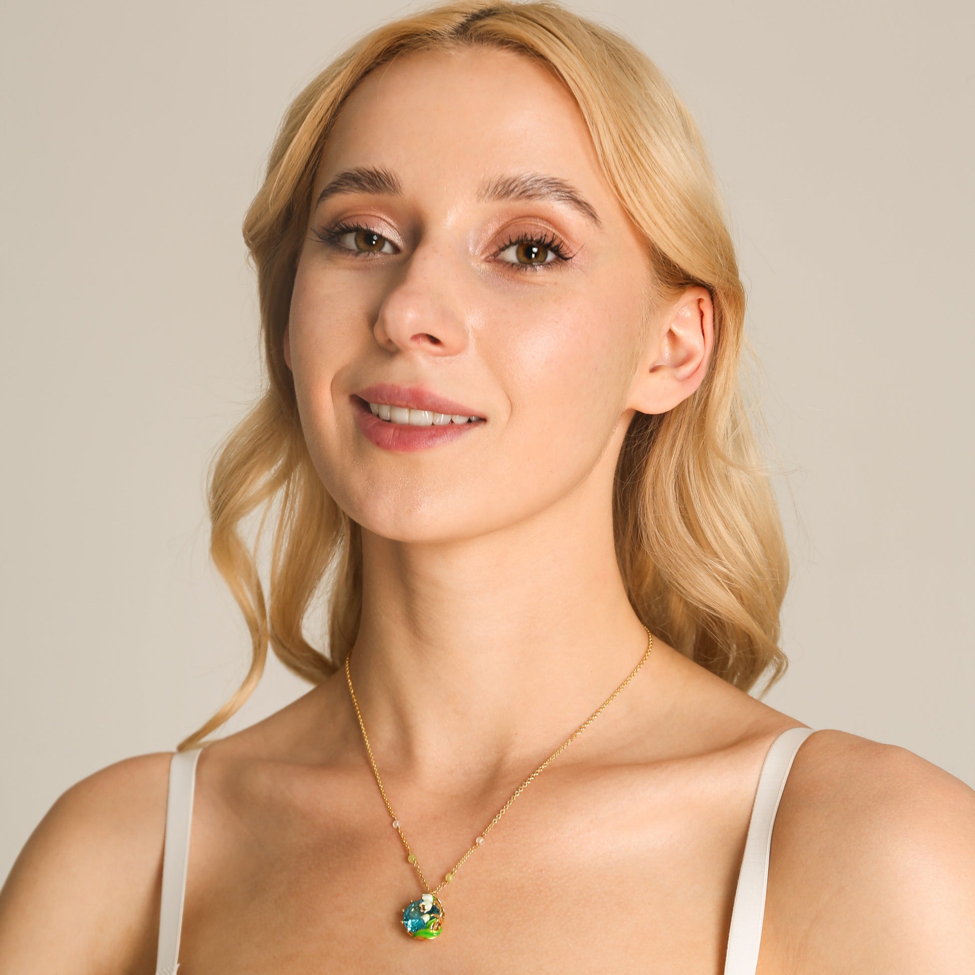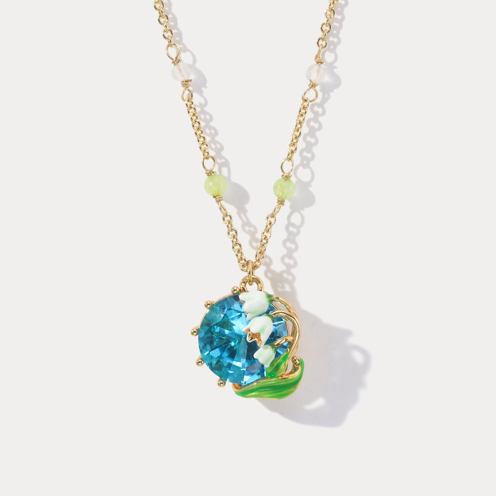Strung on an 18K gold chain as delicate as strands of sunlight, dewy green and milky white beads shimmer like morning droplets on fresh leaves. At the center, an aquamarine stone reflects the calm depth of the sea, its blue surface alive with gentle ripples, like a dream shaped by wind and water. Framing the gem, enamel lily of the valley blooms in snow-white petals and soft green sepals, as if gathered from a painter’s garden. The Lily of the Valley Aquamarine Necklace sways with quiet brilliance, bringing natural grace and a sense of lightness to every moment.