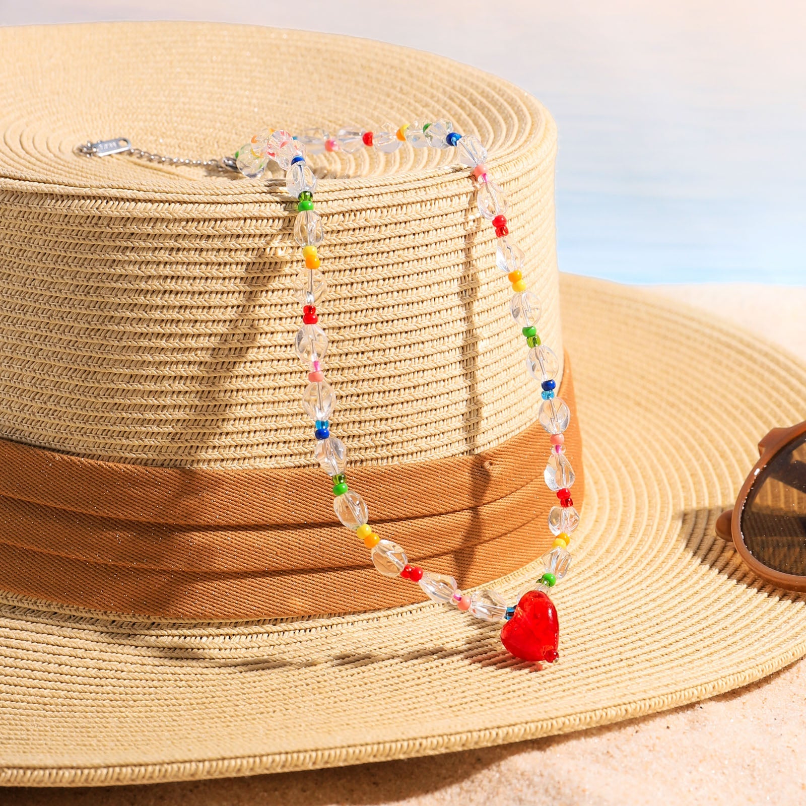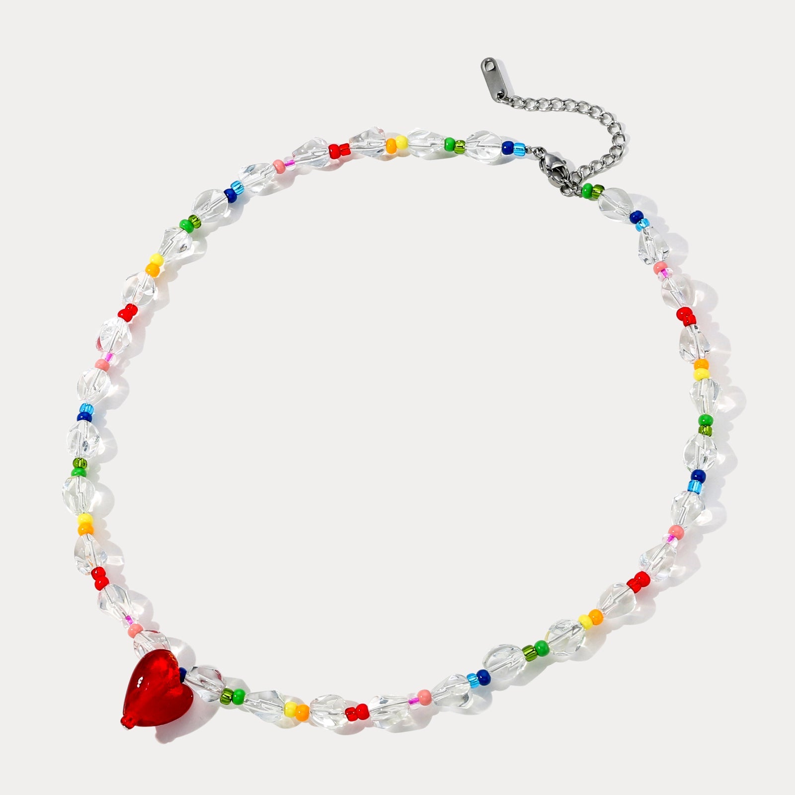 Celebrate love and color with the Rainbow Heart Beaded Necklace. Featuring vibrant, multicolored beads and a charming heart centerpiece, this heart beaded necklace adds a joyful and playful touch to any outfit. Perfect for expressing your unique personality or gifting to someone special, the red heart necklace brings warmth and positivity wherever you go. Brighten your look with this eye-catching accessory that speaks from the heart.