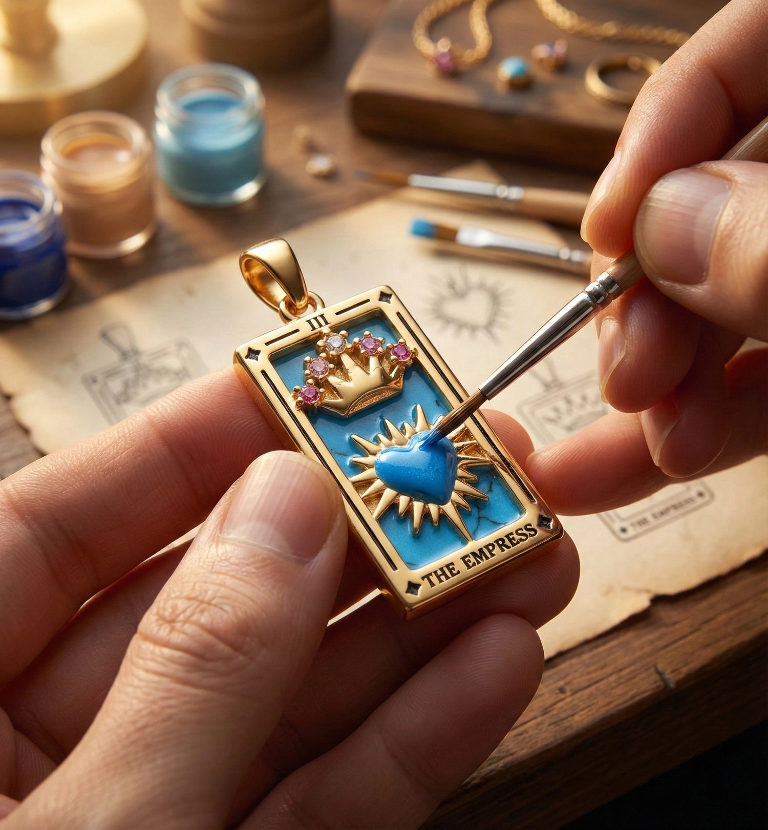 The Warmth of the Hand-Painted This is why we introduced our new handmade jewelry collection. We reject the cold detachment of the industrial assembly line. In our Tarot Collection, every single pendant is Hand-Painted by artisans.