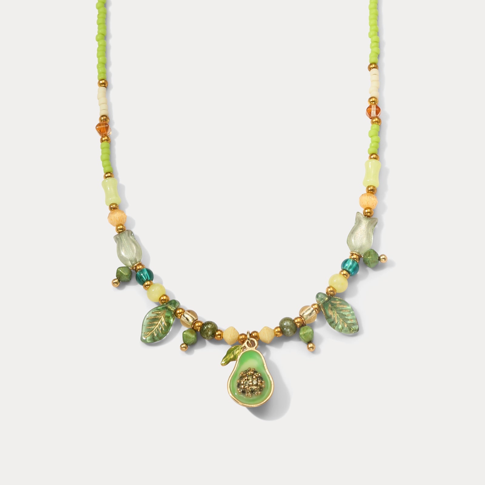 Inspired by a fresh natural vibe this Antique Avocado Bead Necklace features a vivid green strand with colorful beads and a delicate avocado pendant. This Avocado Bead Necklace blends vintage charm and playfulness through hand selected beads paired with leaf elements for intricate detail and rich color. Lightweight and comfortable this Avocado Necklace adds retro flair to any outfit. It brightens a simple shirt for daily commutes fits the natural feel of weekend outings and adds fresh vintage charm at summer festivals or beach vacations.This charming Antique Necklace adds a perfect touch of playful elegance to any outfit, blending fun and refinement with ease. 👉 Shop More Fruit Jewelry.