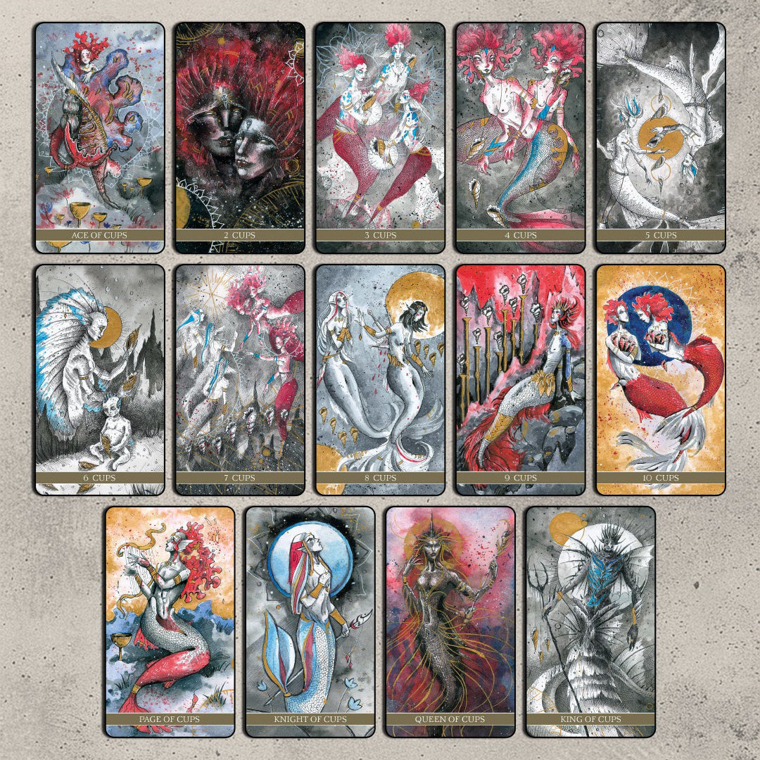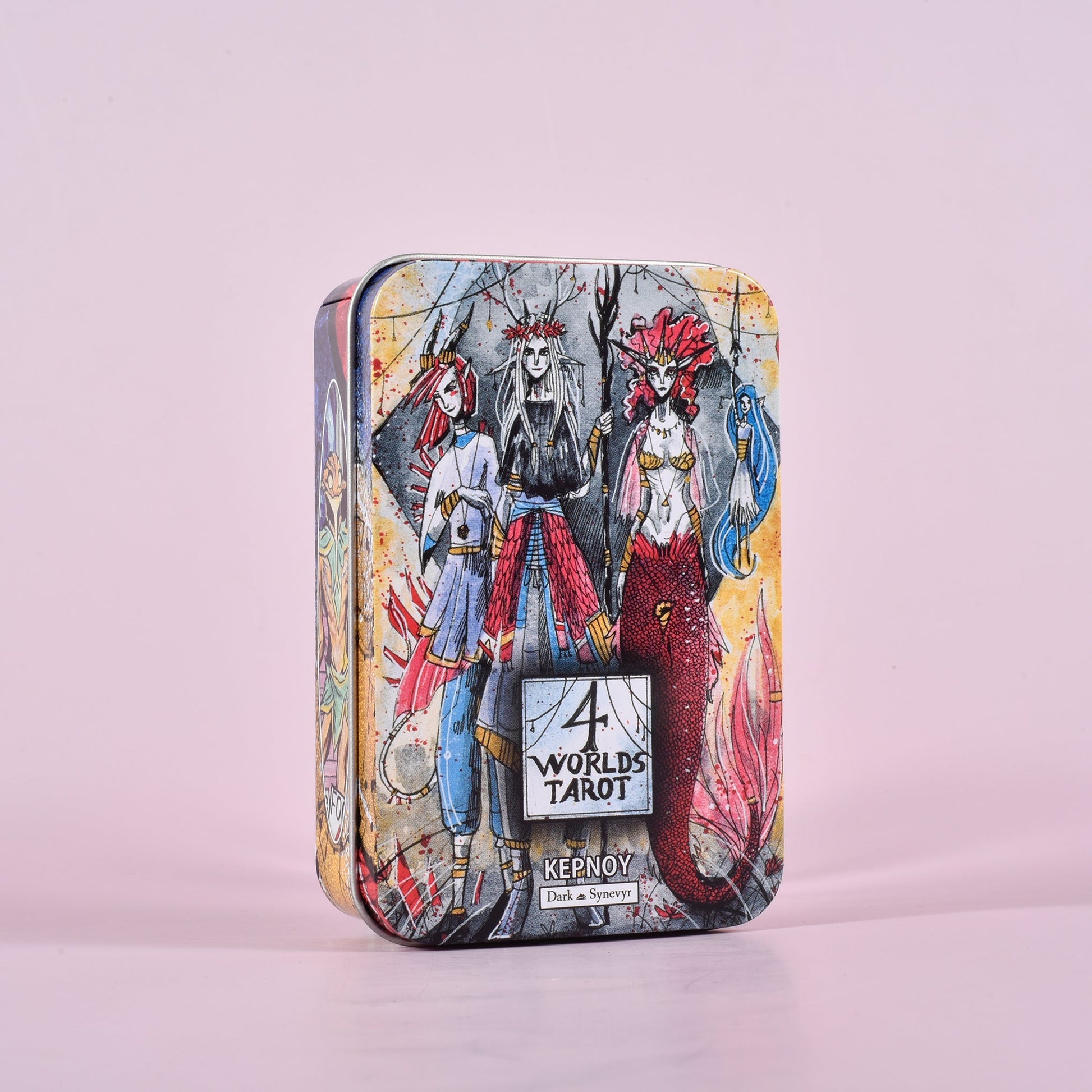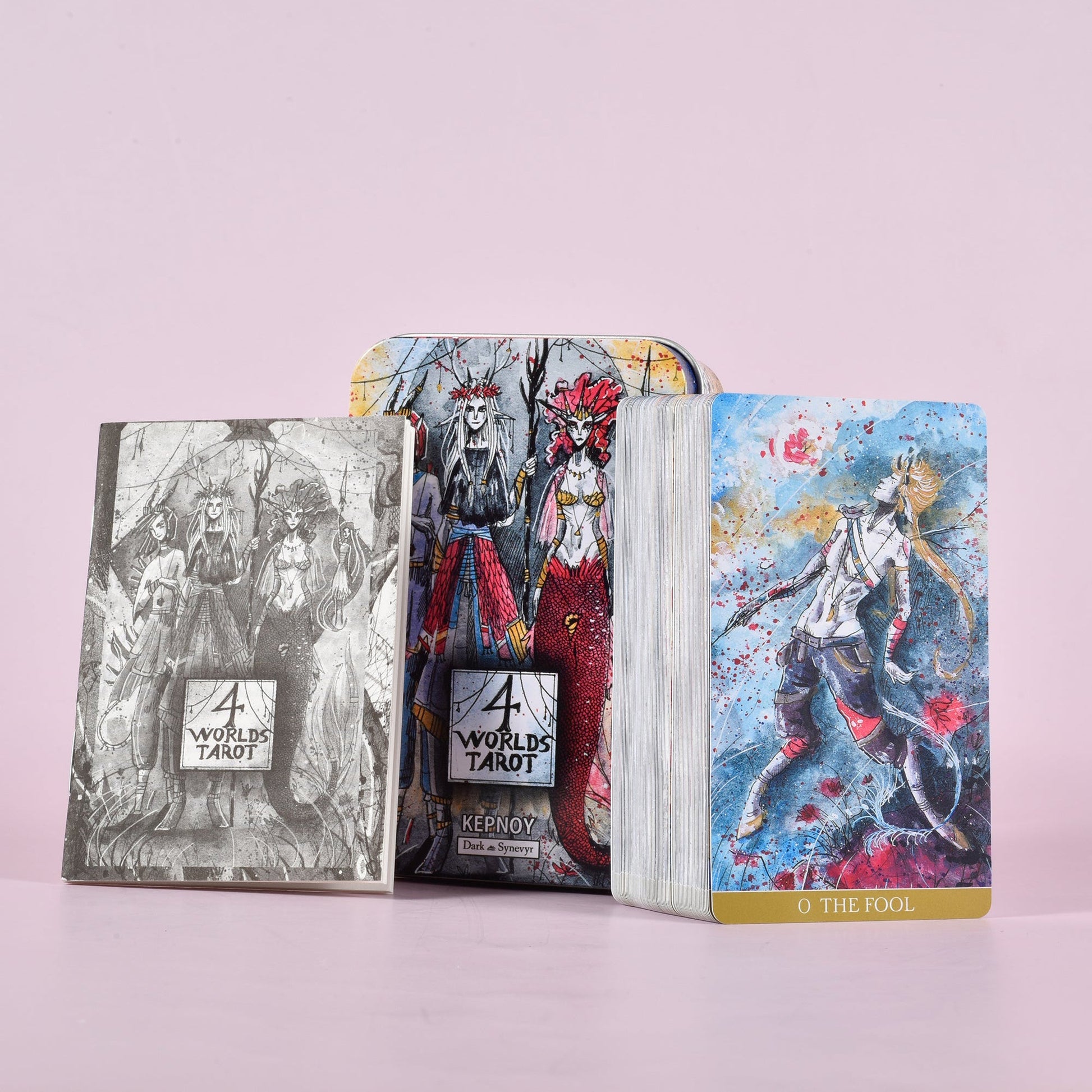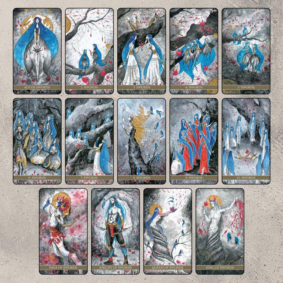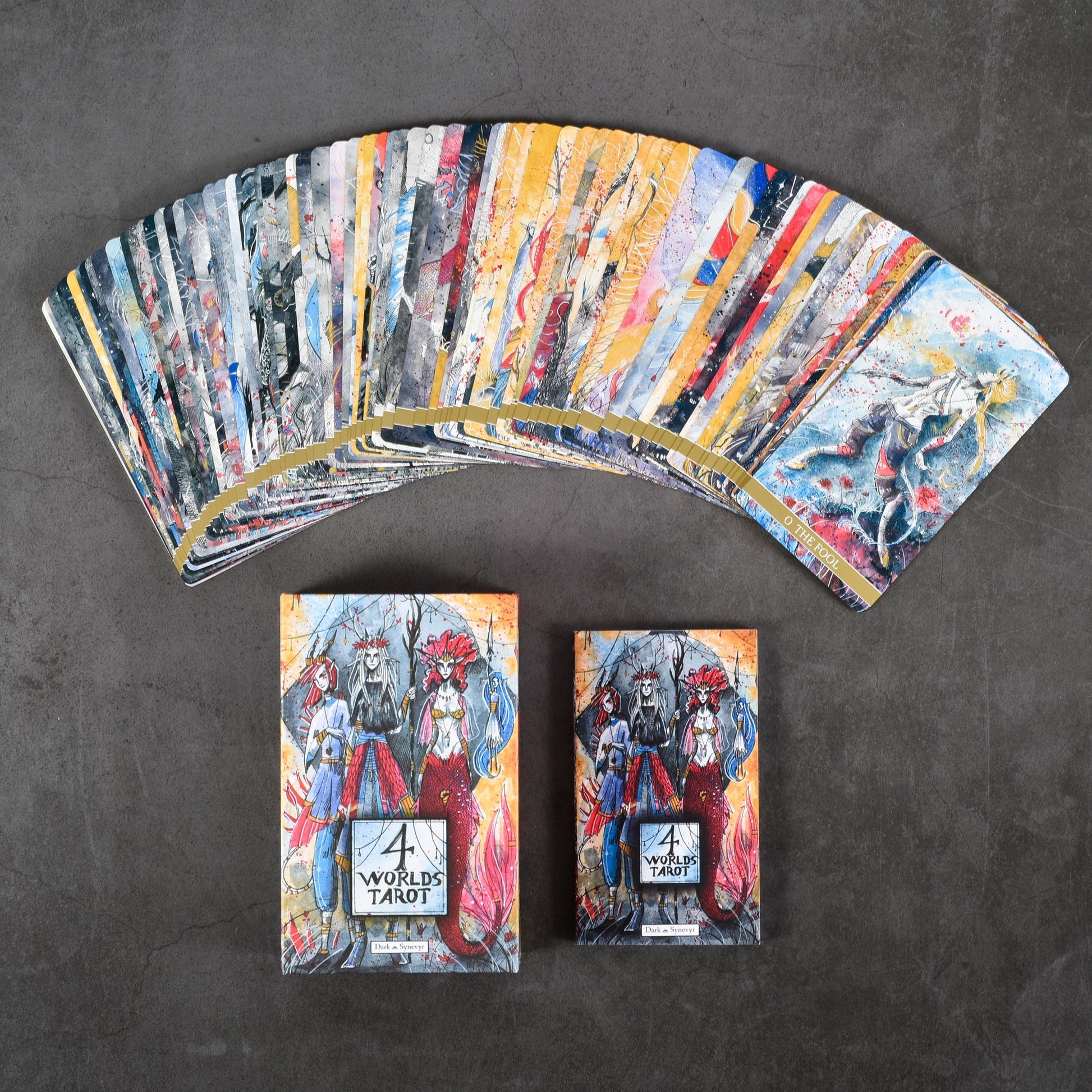 Imbued with primal energy, this wildly imaginative take on the Rider-Waite tells us to face life and death with a light heart, through its uninhibited portrayal of the Four Realms. It channels esoteric philosophy in a riot of color, while the Western comic brushwork lends a playful touch – perhaps even a knowing smile. Amidst chaos, this deck will guide your soul to its place of rest and awaken the power that has always dwelled within.
