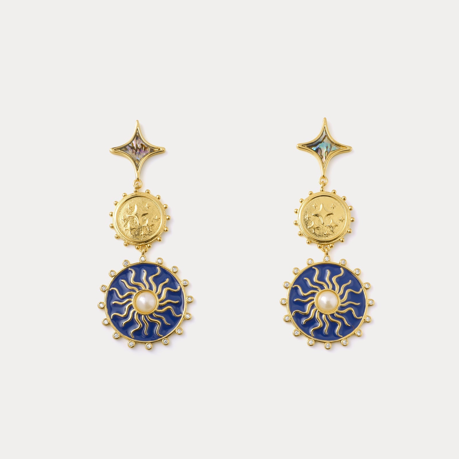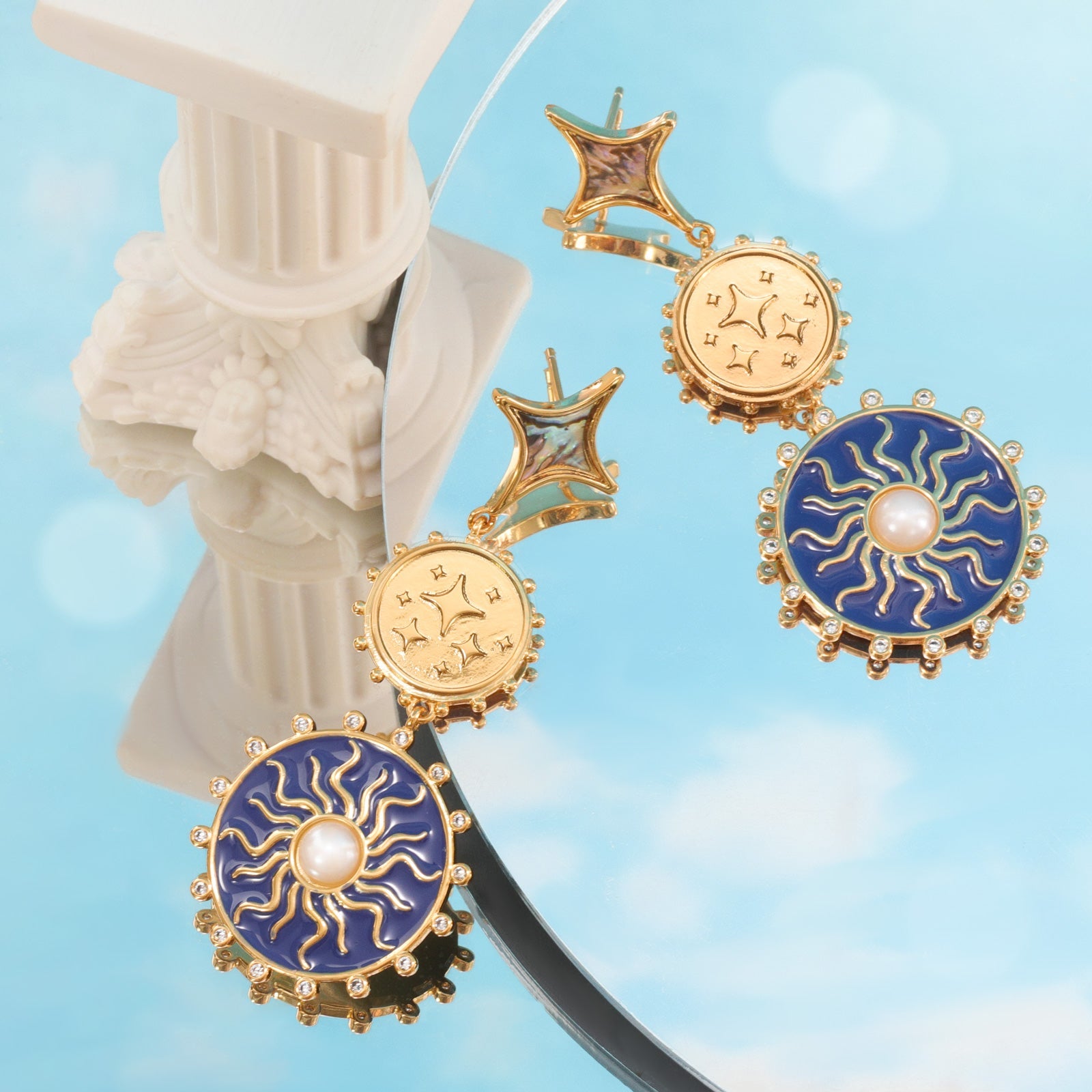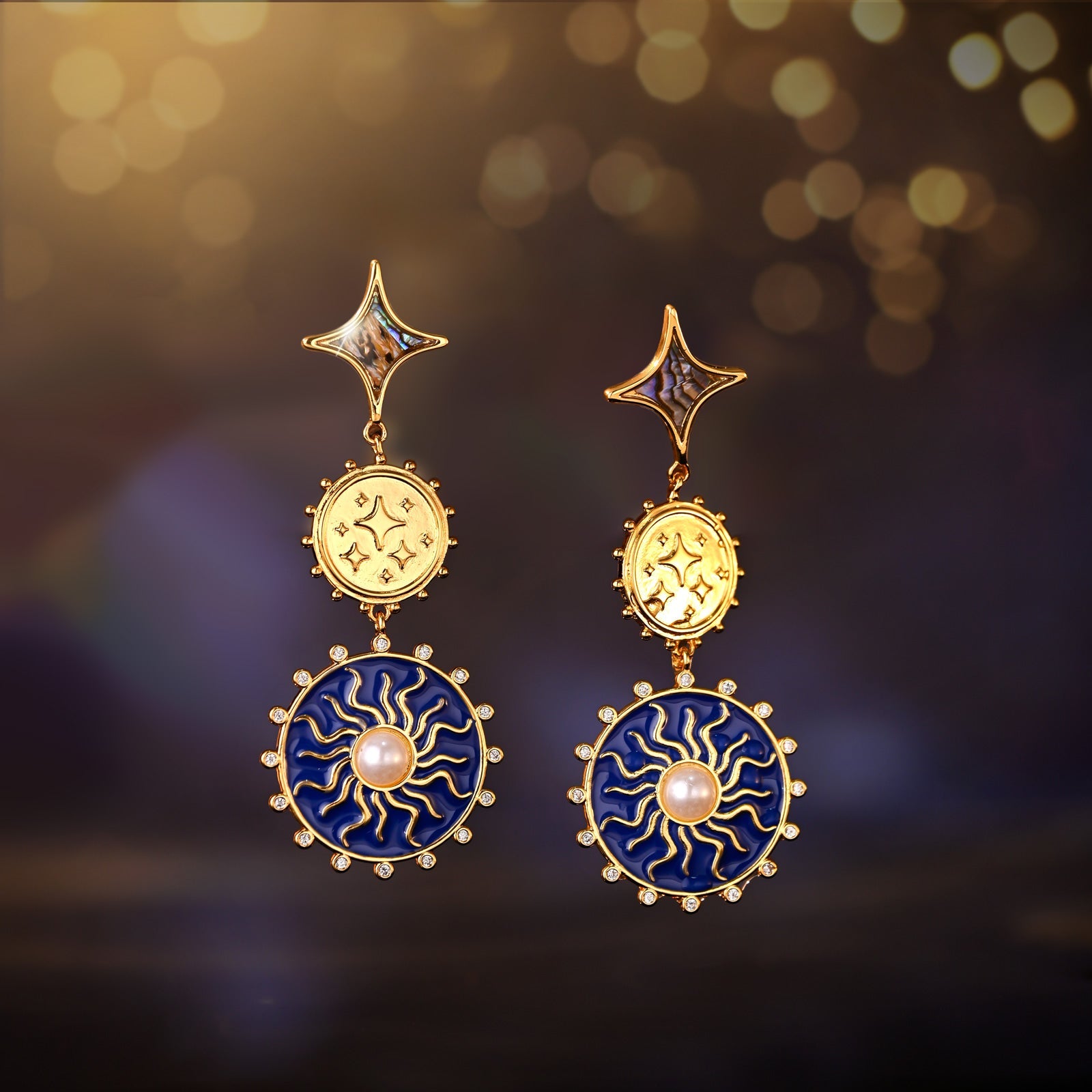 Illuminate your style with the Blue Celestial Disc Earrings from our Astrology Jewelry collection. These stunning moon and star earrings are made from 18K gold-plated brass, featuring intricate blue discs adorned with a captivating mix of dripping oil, shell, and shimmering cubic zirconia. Each earring is further enhanced by the lustrous sheen of artificial pearls and silver accents, creating a celestial effect that dazzles with every movement. Perfect for adding a touch of cosmic elegance to any outfit, the moon and star Earrings bring the mystique of the stars into your everyday wear. Embrace the beauty of the universe with these exquisite, celestial-inspired earrings.