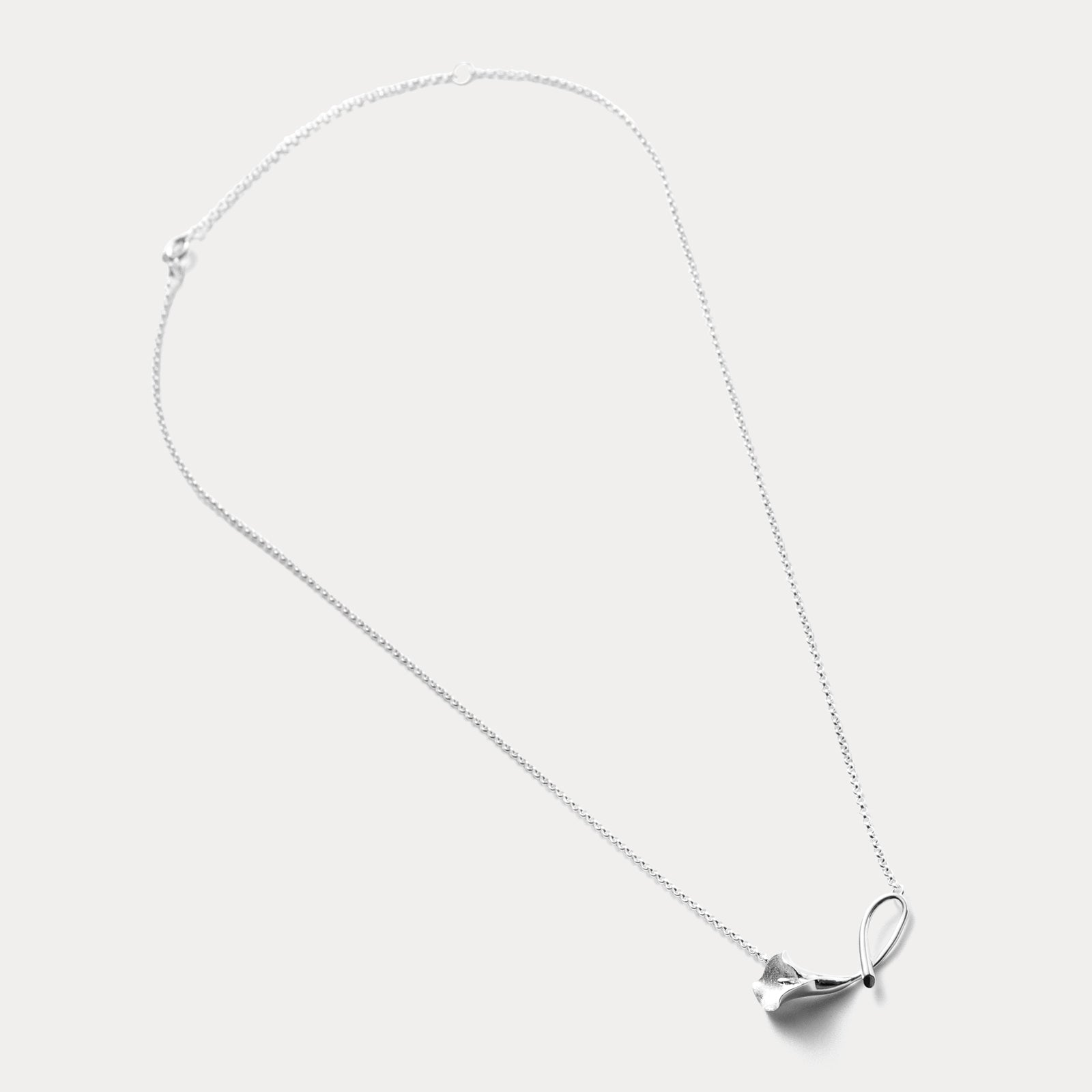 A solitary bloom, its petals unfurling in a graceful arabesque, the Silver Calla Lily Necklace blooms eternal upon the décolletage. Sculpted from precious sterling silver, each curved line and delicate detail pays homage to nature's ephemeral beauty, frozen in an exquisite reverie. As it rests against the skin, this floral talisman whispers of loves born and reborn across the inexorable march of time. With every subtle movement, the calla lily sways, a delicate dance that speaks of atonements sought and granted, of souls intertwined through the ages. Wear our flower necklace as a vow renewed, a promise that true devotion knows no bounds, save those of eternity itself.