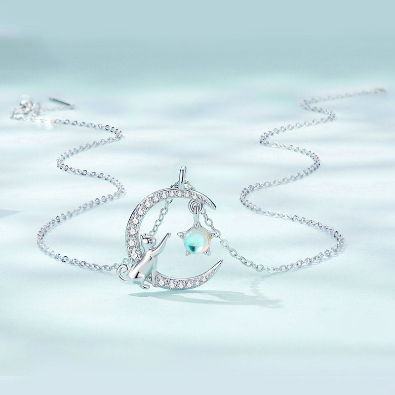 The curved moon is inlaid with small zircons, a cat sits on the moon and reaches out its small claws lazily to reach the crystal moon stone star. The necklace is funny and cute, could sprout your girly heart.