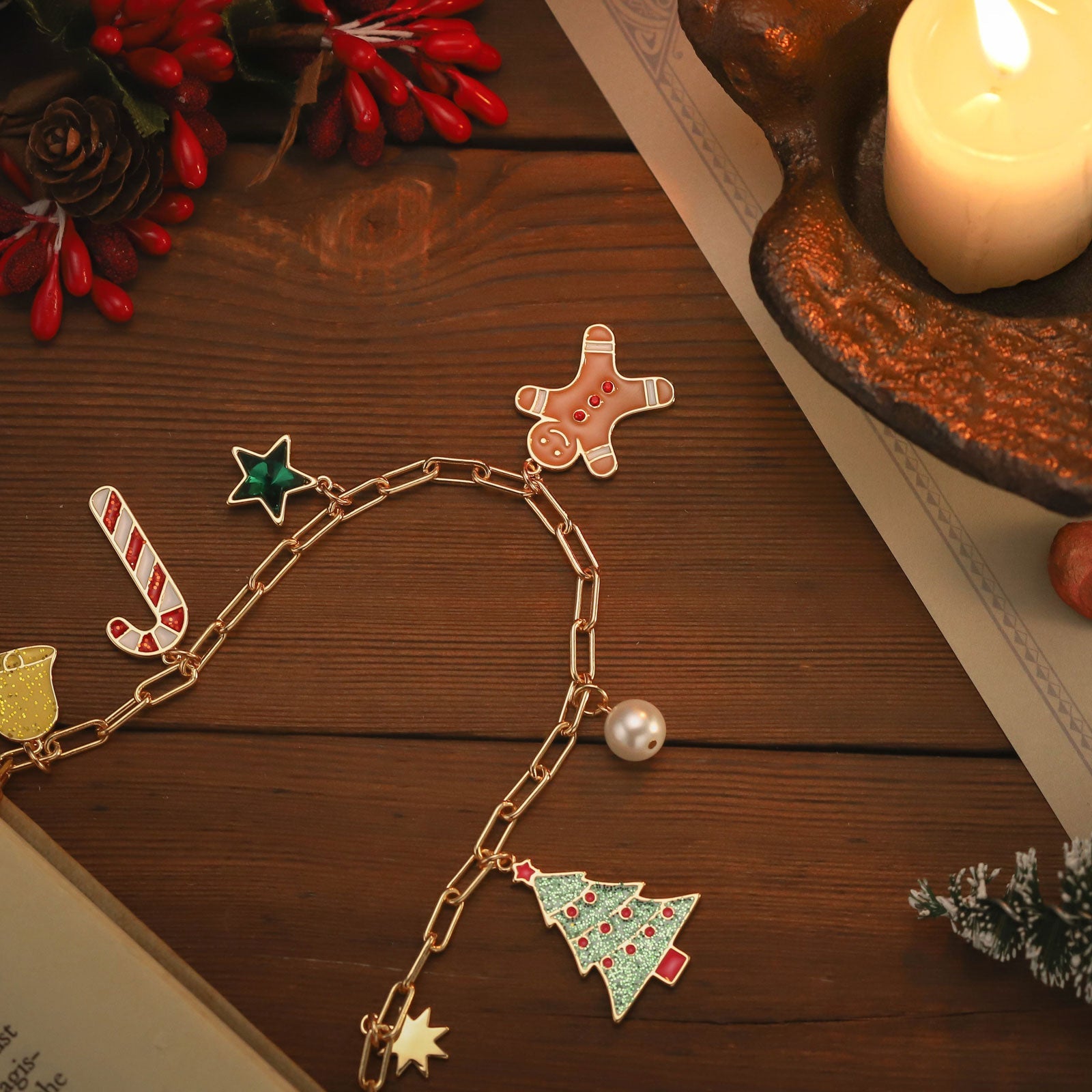 Celebrate the holidays with this festive Christmas Tree Gingerbread Man Necklace. This delicious-looking necklace features a gingerbread man hanging from a tree, making a perfect addition to any holiday ensemble. Spread the Christmas cheer with this fun and quirky accessory!