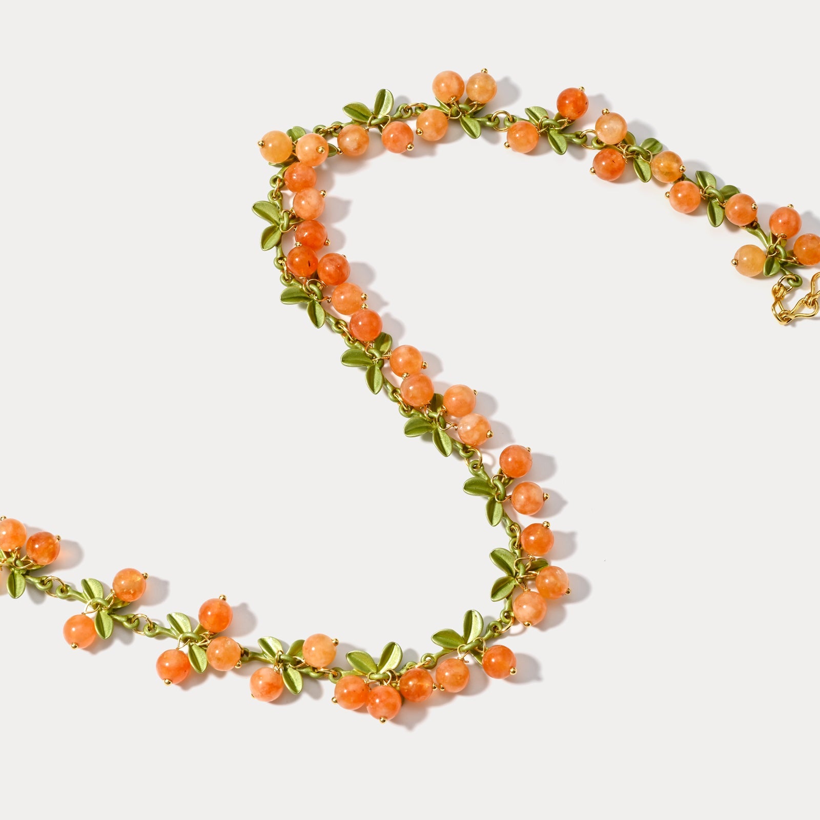 Embrace the vivacious energy of nature with this captivating berry necklace, a vibrant masterpiece of berry jewelry. Made with 18K gold-plated brass and radiant citrine gemstones, this enchanting piece celebrates the warm, sun-kissed hues of ripe berries bursting with life. Each citrine bead is carefully selected and arranged, creating a harmonious symphony of organic textures and vibrant tones that exude the essence of the great outdoors.
