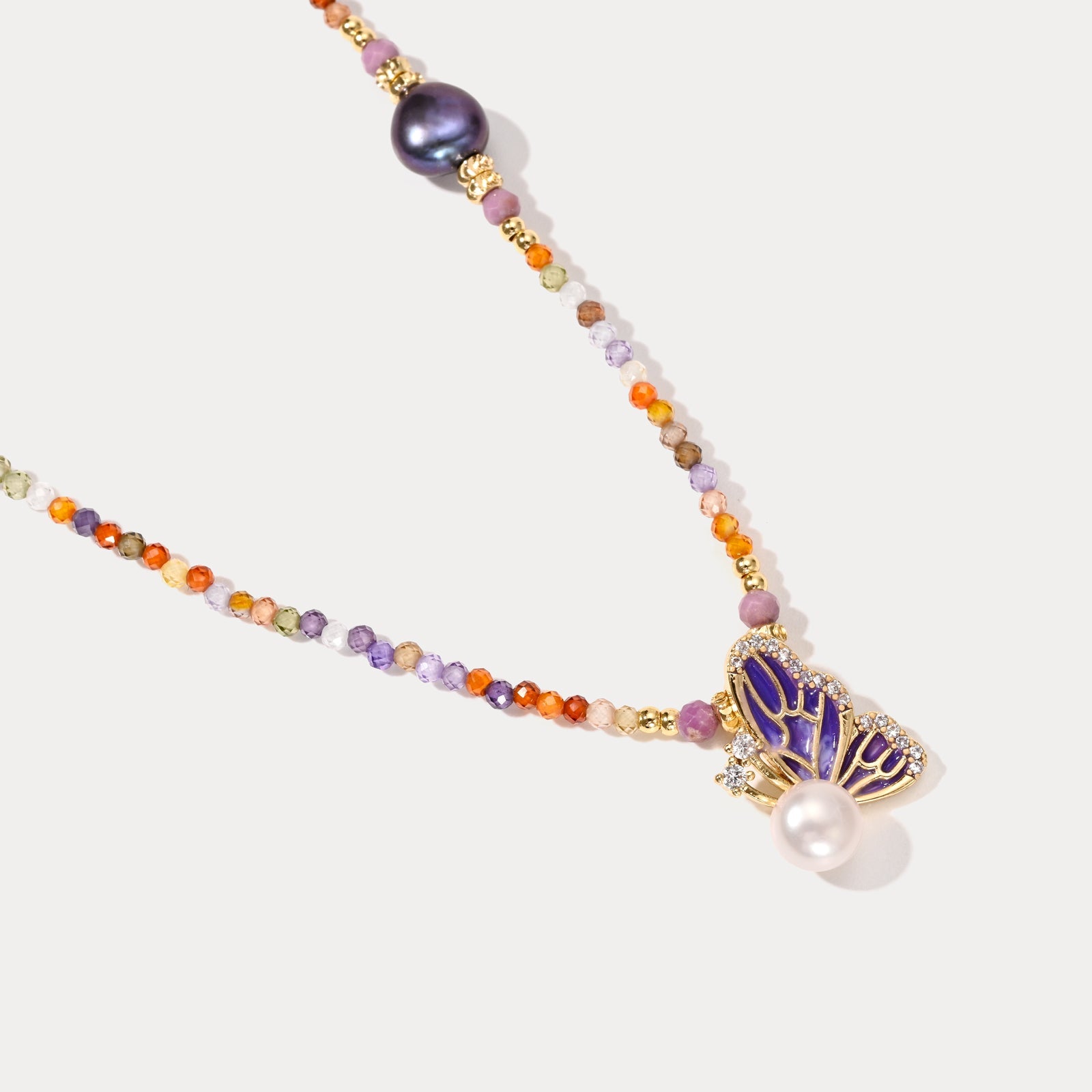 Elevate your ensemble with the ethereal charm of our Dainty Bead Butterfly Pearl Necklace. This exquisite piece features a delicately crafted butterfly pendant, its wings adorned with intricate enamel detailing in deep, regal purple, and highlighted with a cascade of sparkling crystals. A lustrous pearl, symbolizing purity and grace, nestles perfectly against the butterfly, adding a touch of timeless elegance to this enchanting design. The necklace itself is a celebration of color and texture, strung with a harmonious blend of faceted gemstone beads in warm, earthy tones. Let this necklace be a reminder of the beauty in transformation and the elegance in nature.