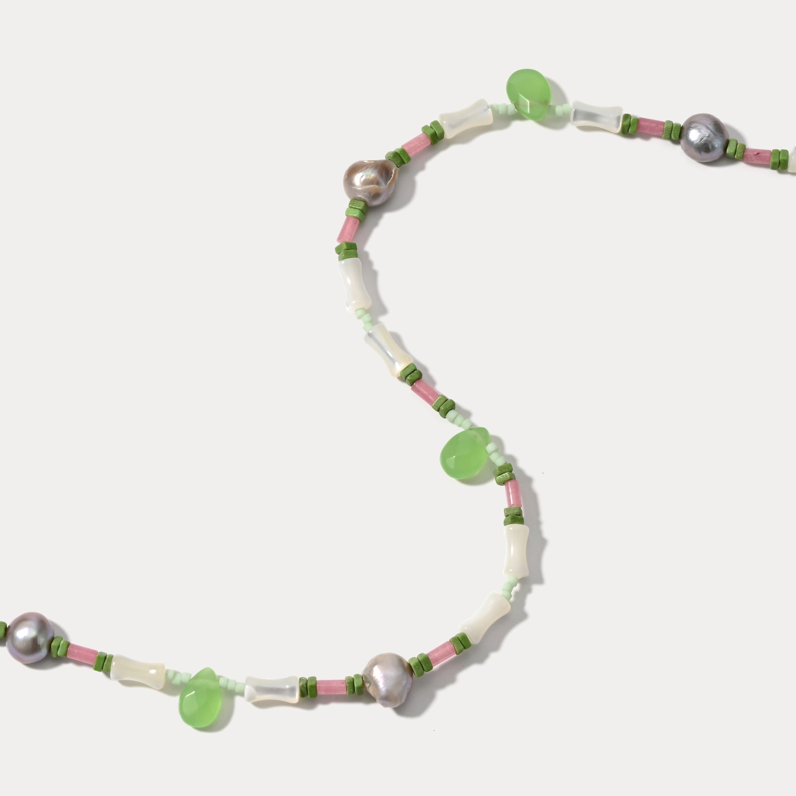 Enhance your style with the Matcha Dainty Bead Necklace, an exquisite piece that harmoniously blends elegance and natural beauty. This green crystal necklace features a captivating combination of mysterious black pearls, refreshing green natural stones, and shimmering crystals, all delicately strung together on a silver-plated brass chain. Made with durable brass and a timeless silver finish, this green stone necklace is perfect for layering or wearing solo for a subtle yet sophisticated statement. Adjustable in length and secured with a lobster clasp, it effortlessly transitions from day to night, making it a versatile addition to your jewelry collection. Indulge in the Matcha Dainty Bead Necklace with Black Pearl, where elegance meets nature in a delicate dance of beauty.