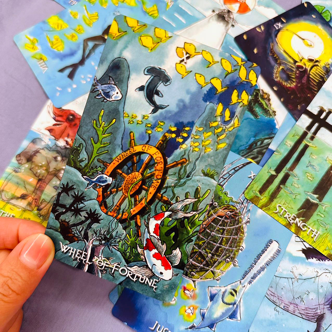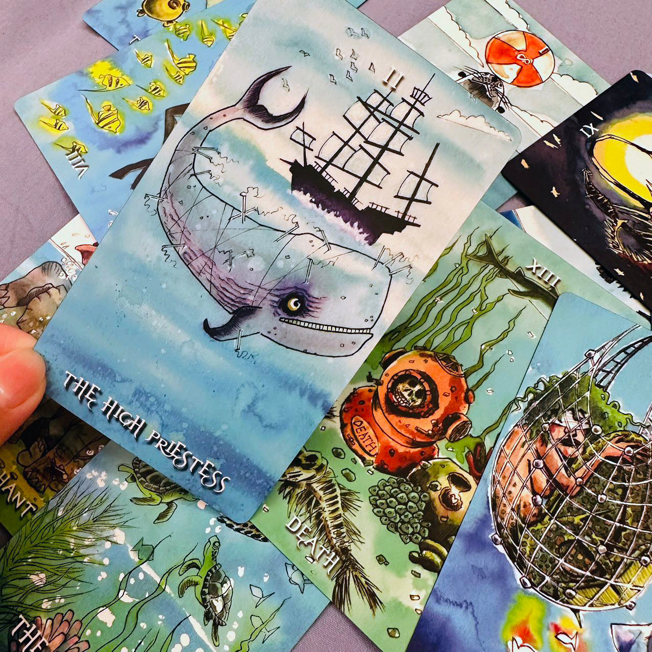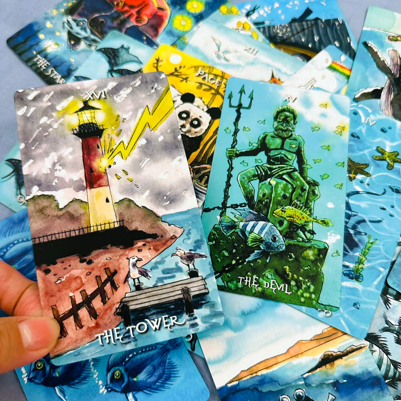 Plunging into an underwater world where mystical creatures and oceanic symbols bring each card to life, this Rider-Waite deck reimagines traditional tarot themes through surreal oceanic landscapes with a colorful, whimsical style that invites exploration. A total of 78 aquatic illustrations, from whales and turtles to lighthouses and divers, merge the mysterious and magical. The artwork captures both the serene and turbulent aspects of the sea, creating a unique tarot experience that resonates with both novice and seasoned readers.