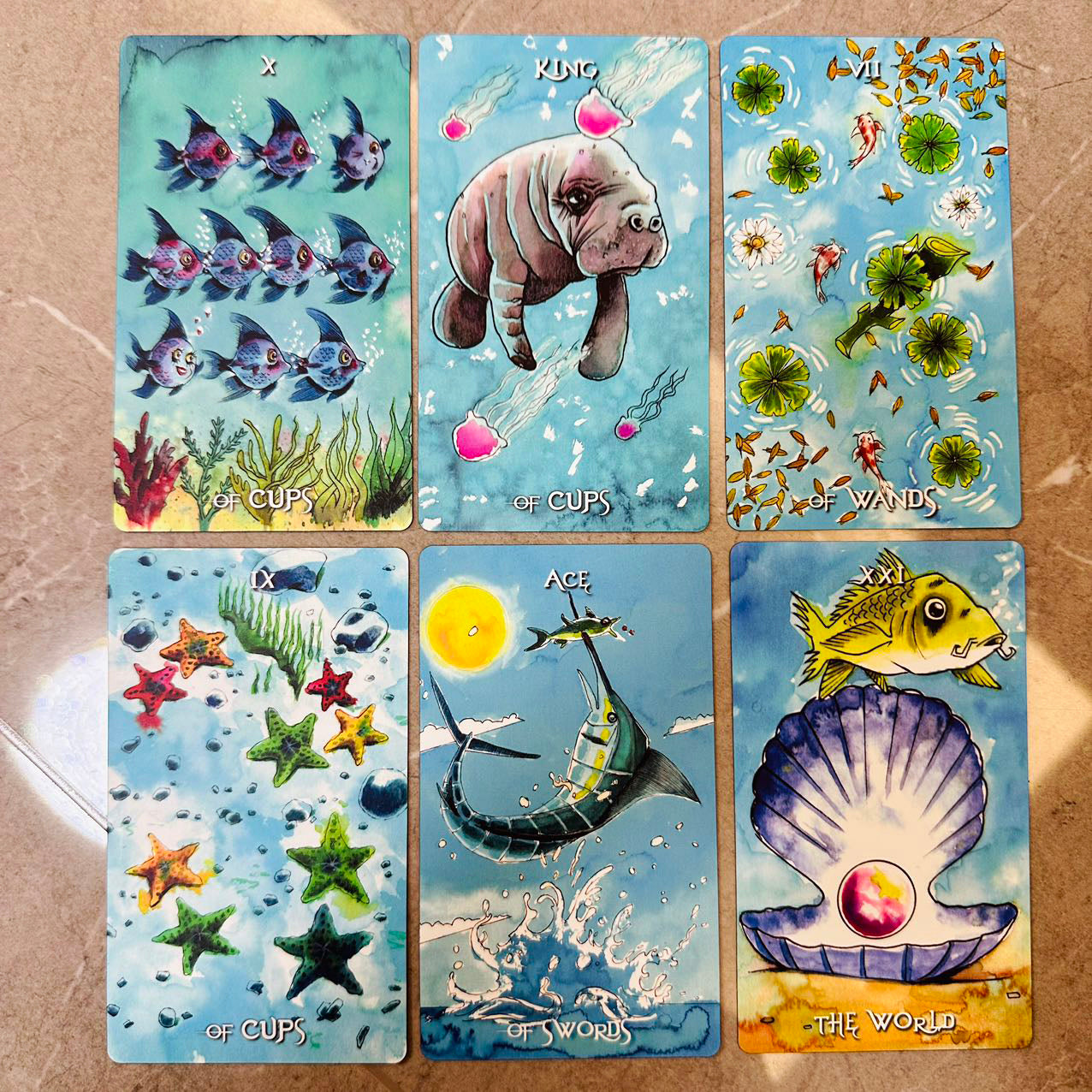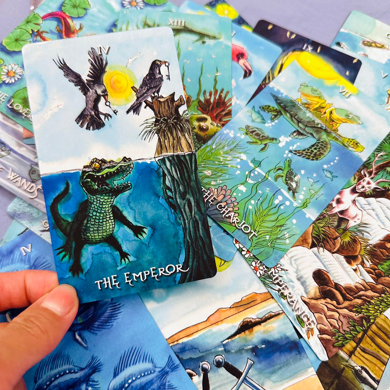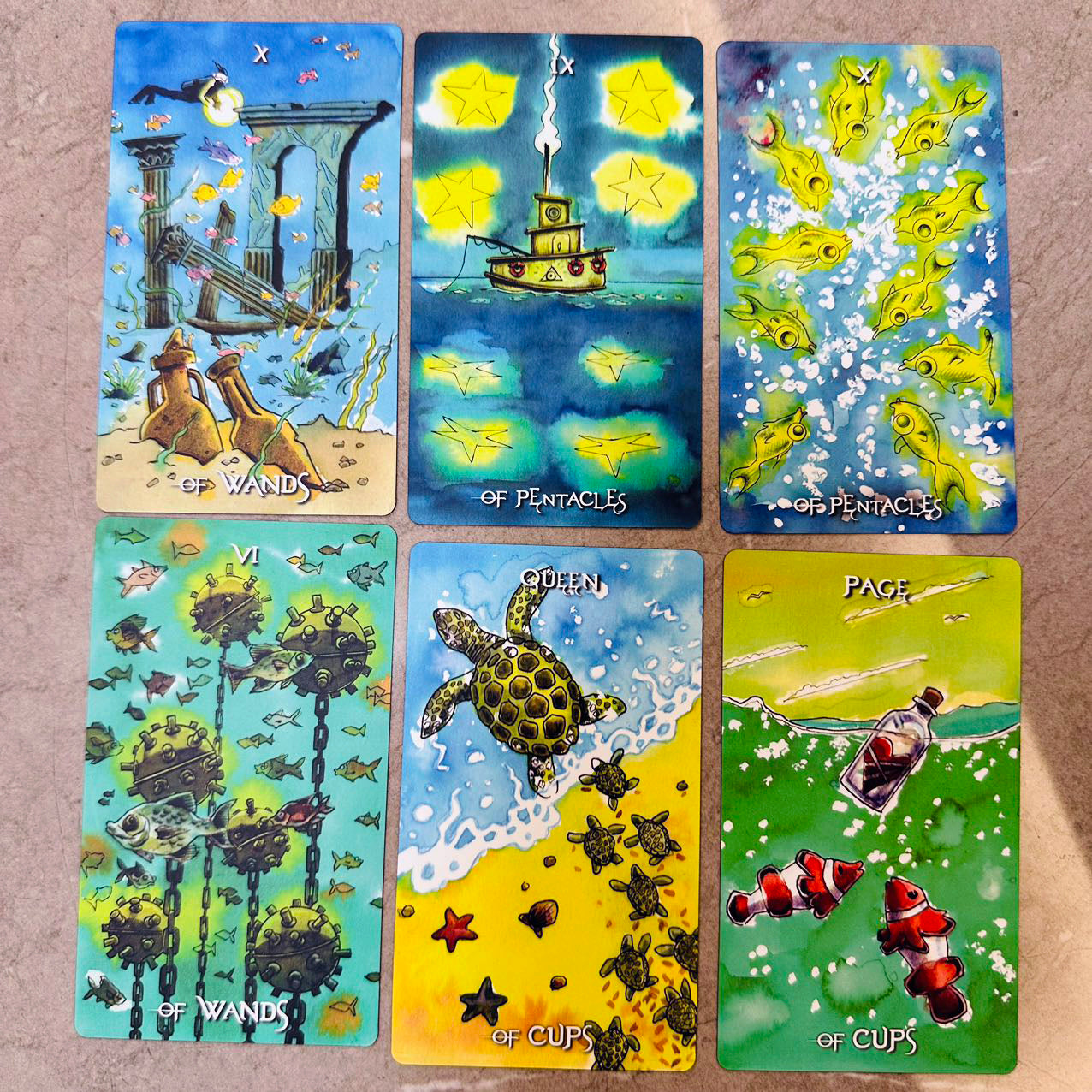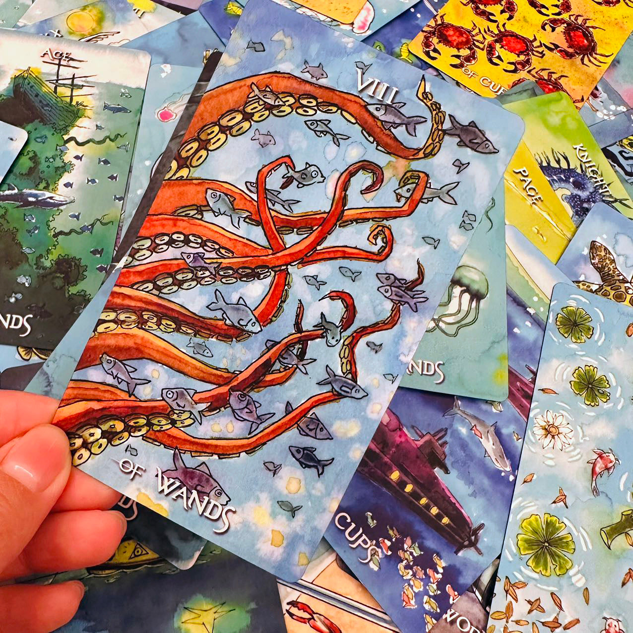 Plunging into an underwater world where mystical creatures and oceanic symbols bring each card to life, this Rider-Waite deck reimagines traditional tarot themes through surreal oceanic landscapes with a colorful, whimsical style that invites exploration. A total of 78 aquatic illustrations, from whales and turtles to lighthouses and divers, merge the mysterious and magical. The artwork captures both the serene and turbulent aspects of the sea, creating a unique tarot experience that resonates with both novice and seasoned readers.