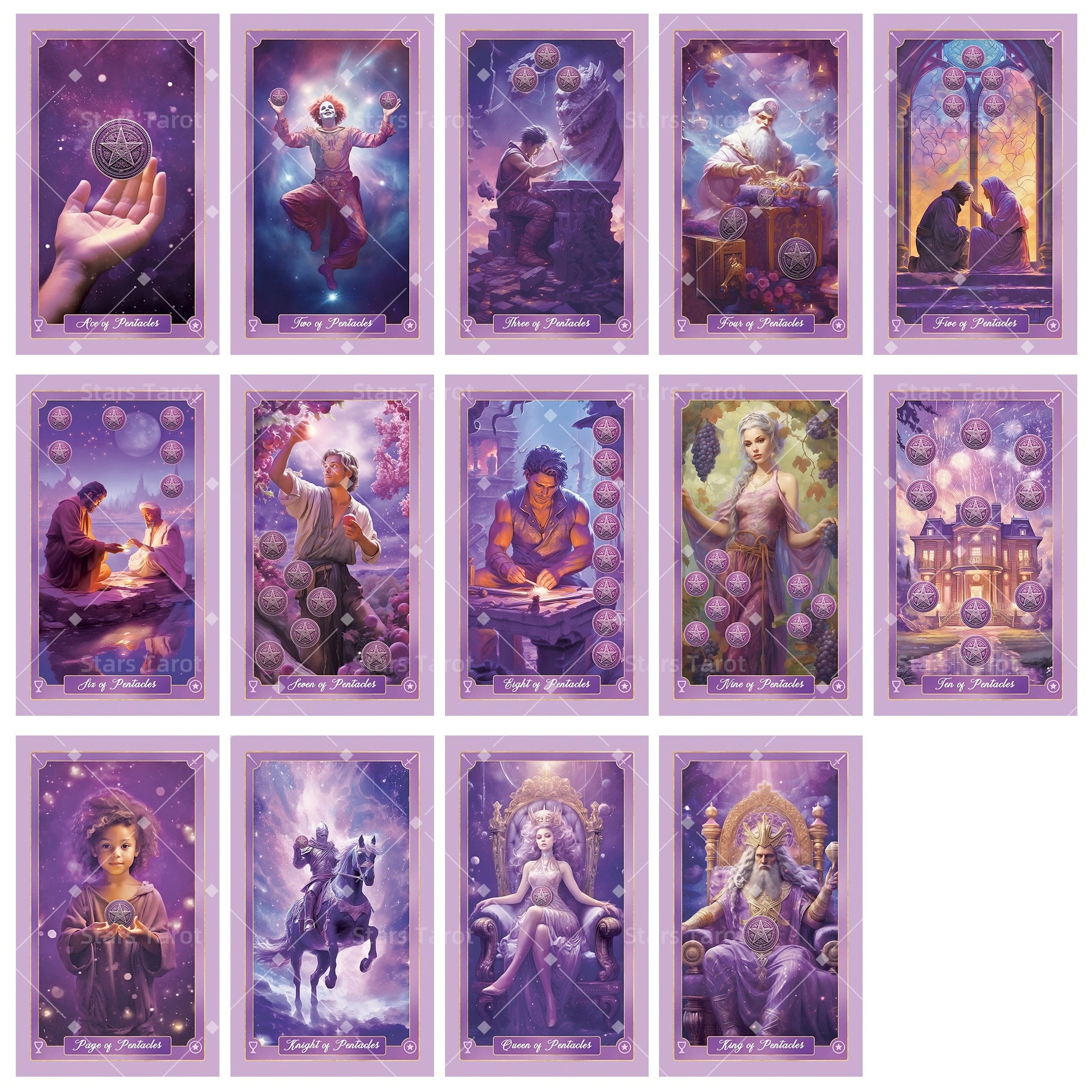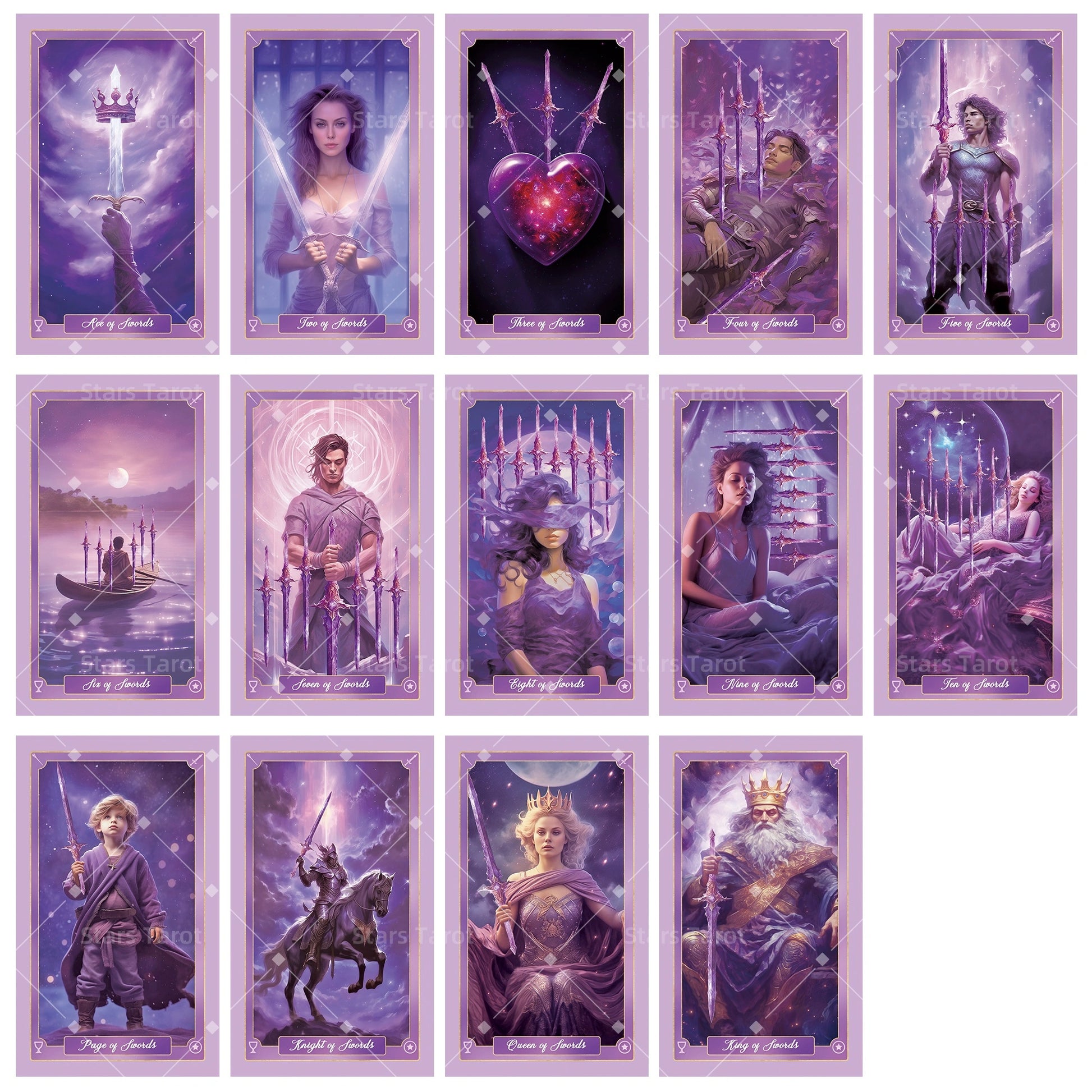 Draped in twilight hues, this deck glows with calm, otherworldly light. Ethereal figures stand beneath starlit skies, while rich violets and soft lilacs lend each reading an air of mystery. Perfect for introspection and dreamlike journeys.