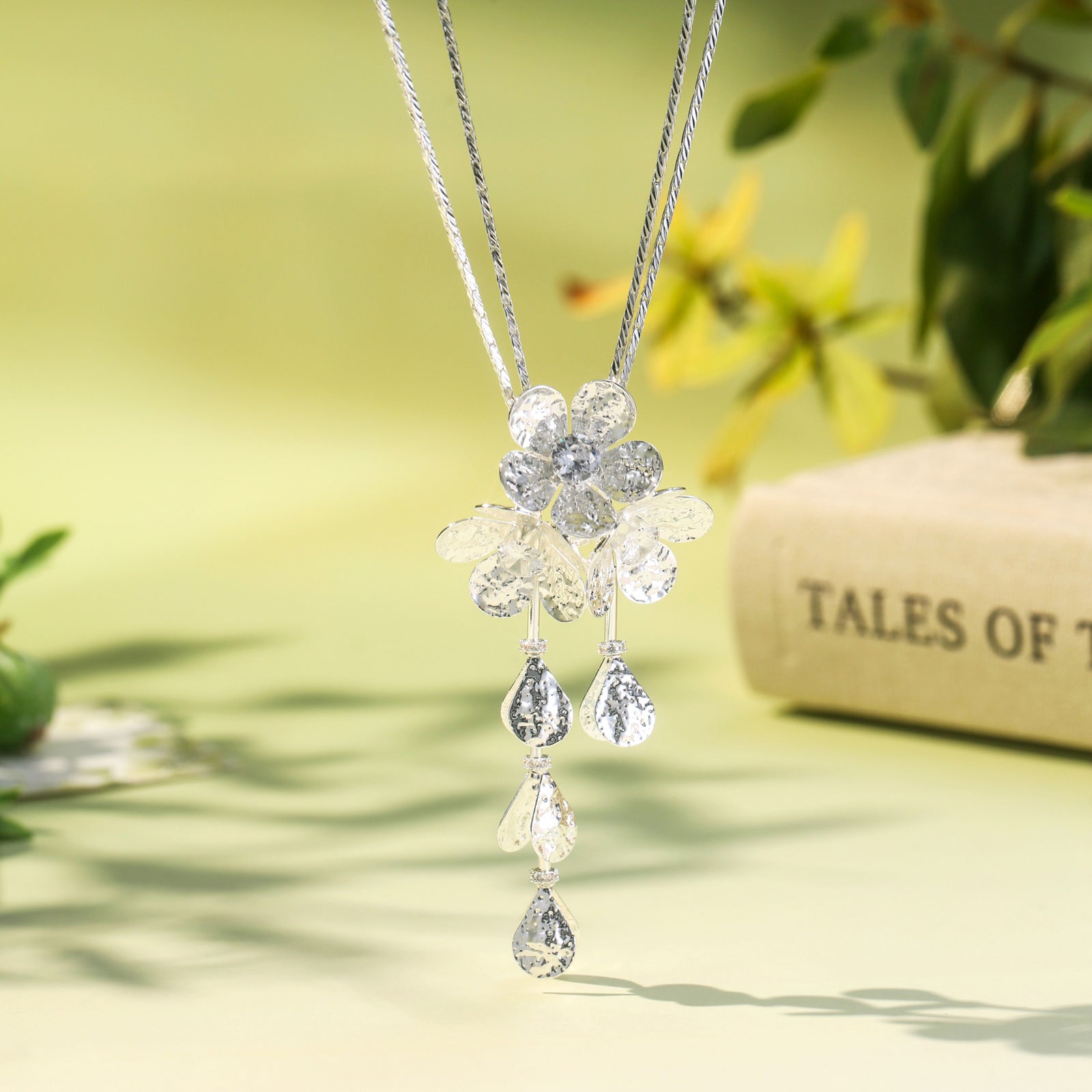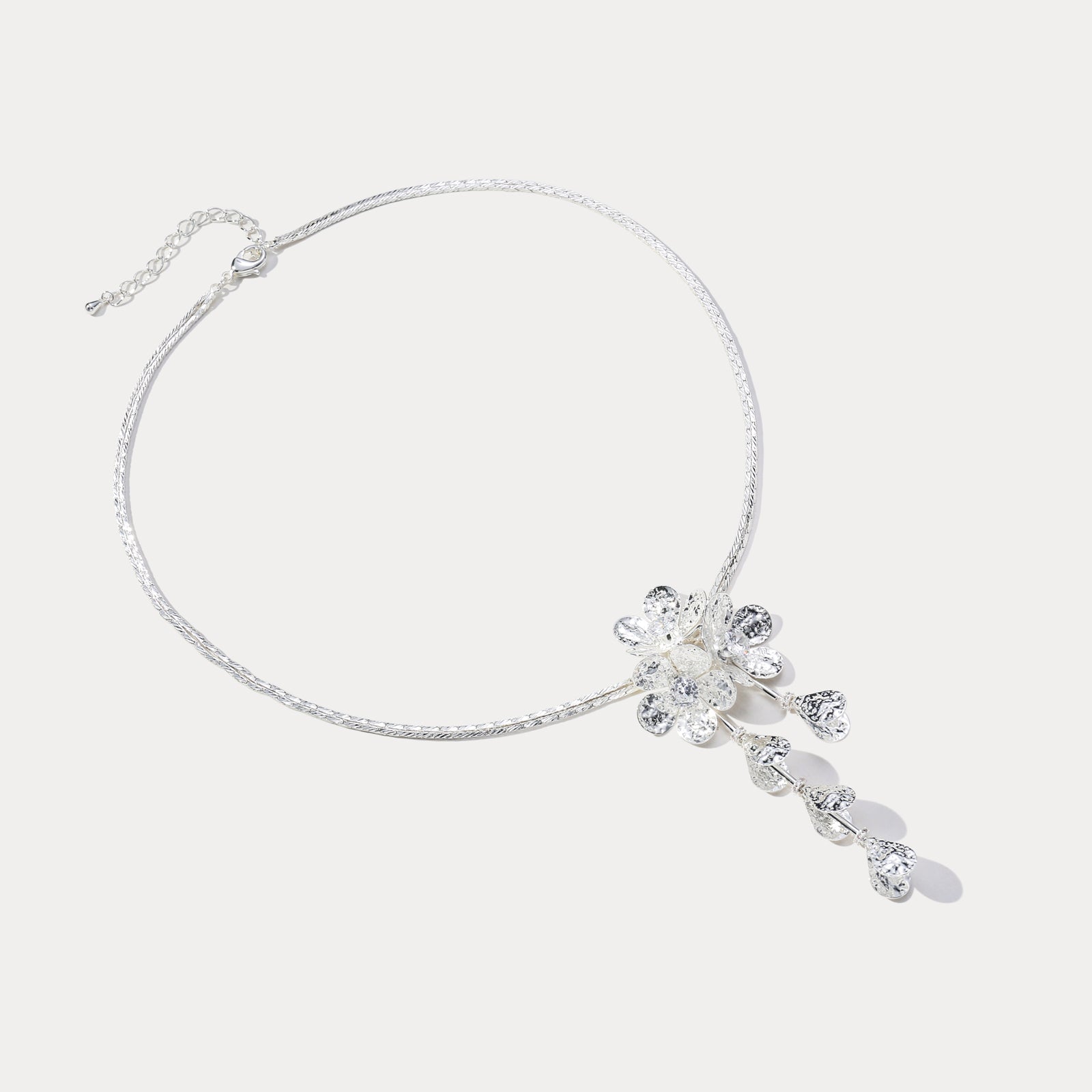 Immerse yourself in the radiant beauty of the Flowers Dangle Necklace. Suspended from a silver chain, the floral pendants shimmer like blooming blossoms, while delicate droplet accents add a sense of rhythm and movement. As a flowers necklace, it pairs effortlessly with simple dresses for a touch of romance in your daily commute. For formal dinners or evening occasions, the elegant design of this dangle necklace enhances your presence with graceful allure. Infused with floral poetry and sparkle, the Flowers Necklace brings refinement and personality to every look, making each appearance feel effortlessly luminous.