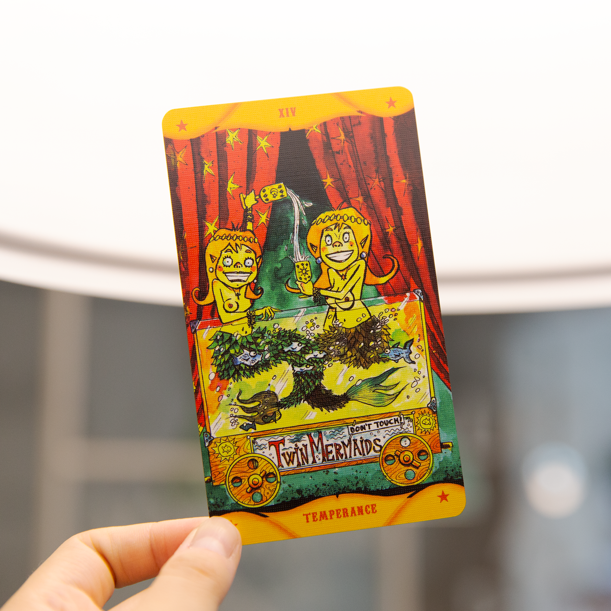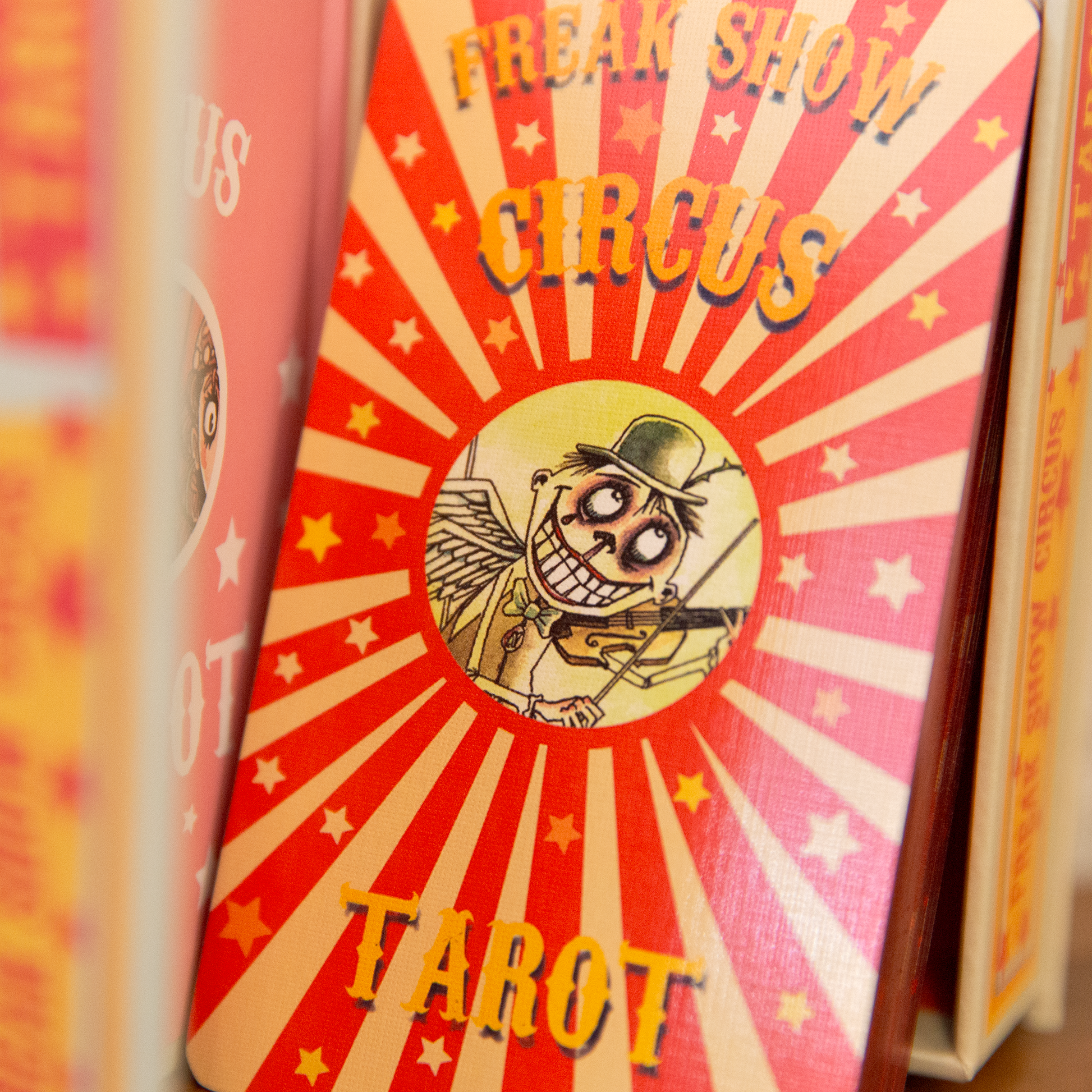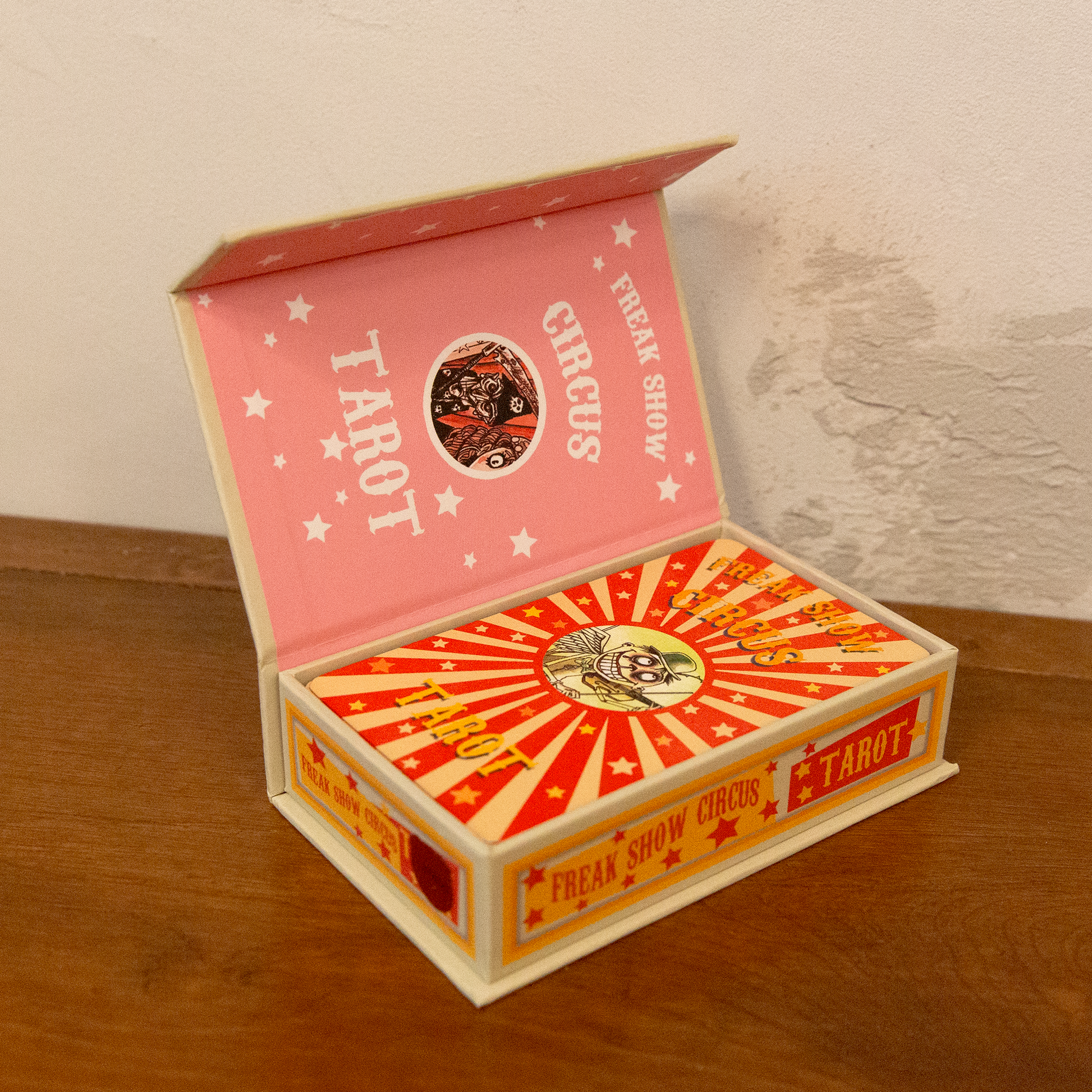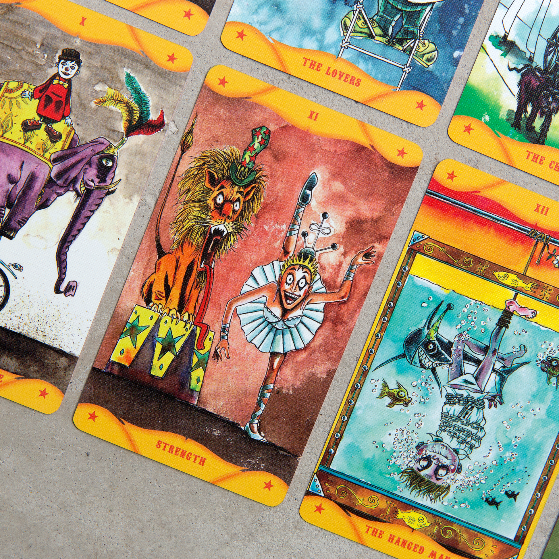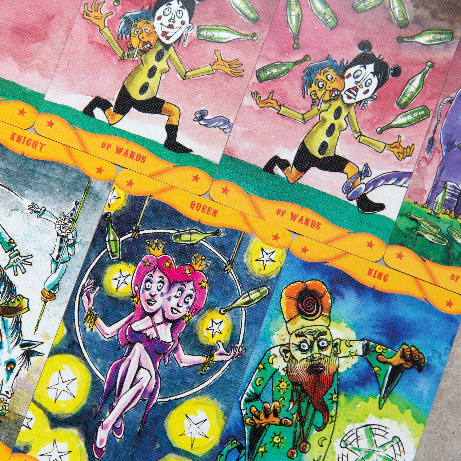 Blending the mystique of tarot with the razzle-dazzle of the big top, this nostalgic deck is your ticket to a spiritual extravaganza! Dressed to impress in a circus poster style, it bursts with cartoonish vibrancy and line work as intricate as a high-wire act. Tarot archetypes take center stage as circus icons – from clowns, magicians, and acrobats to lion tamers, knife throwers, and twin mermaids. Each card performs its own act, brimming with eccentric charm, grotesque humor, and most importantly – emotional depth. Whether you're juggling questions or taming your inner beast, join us – if you dare.