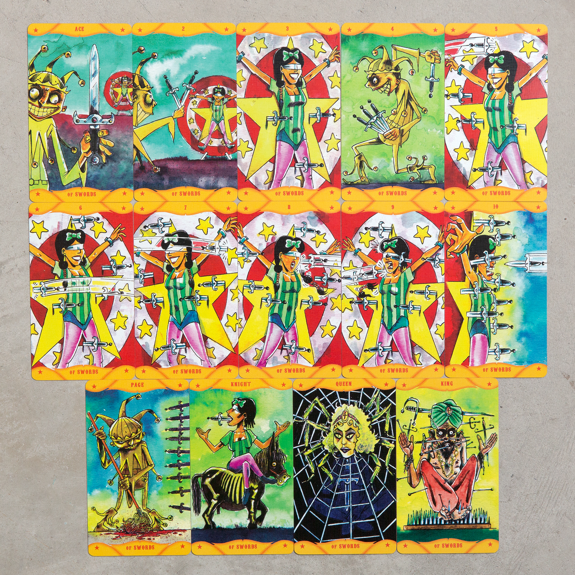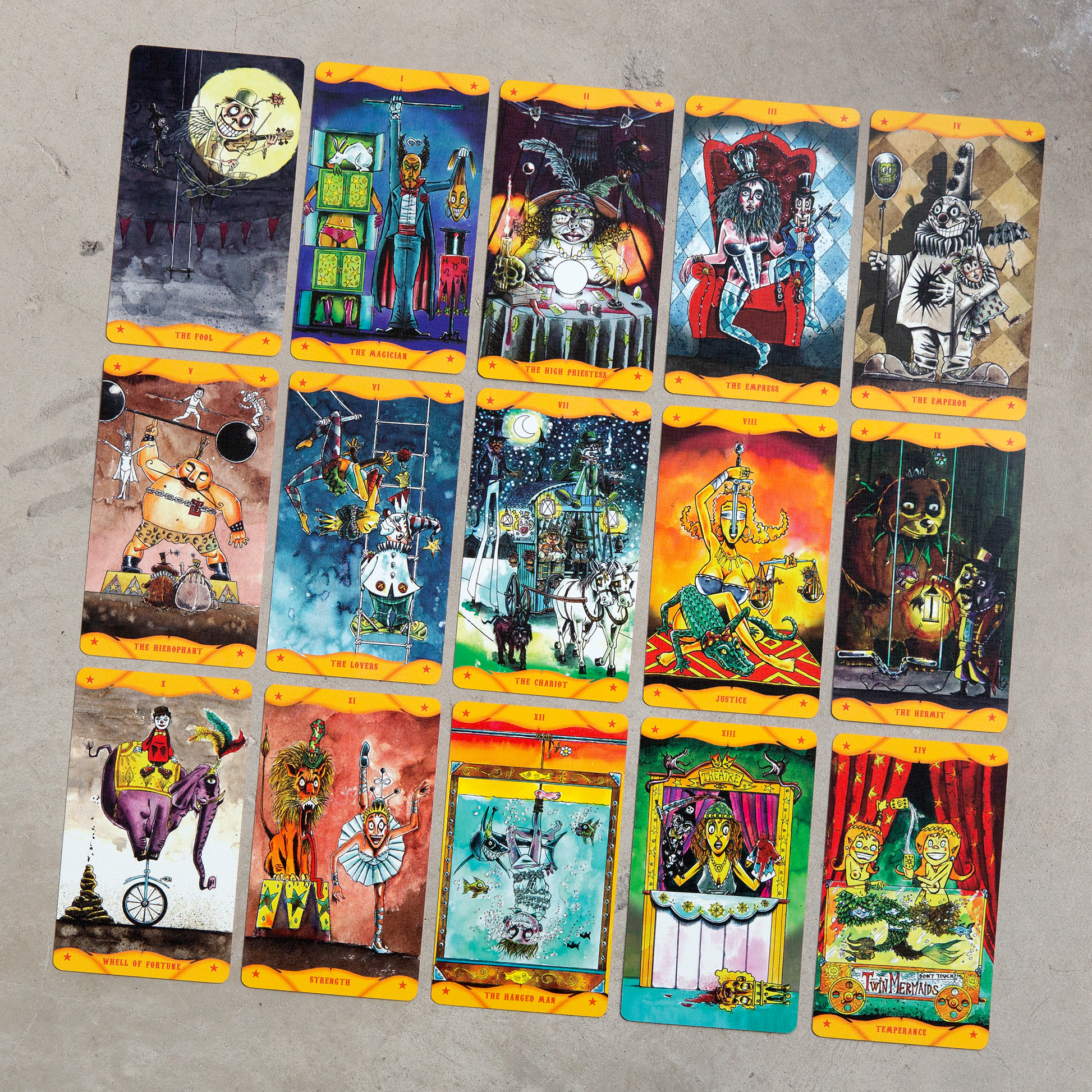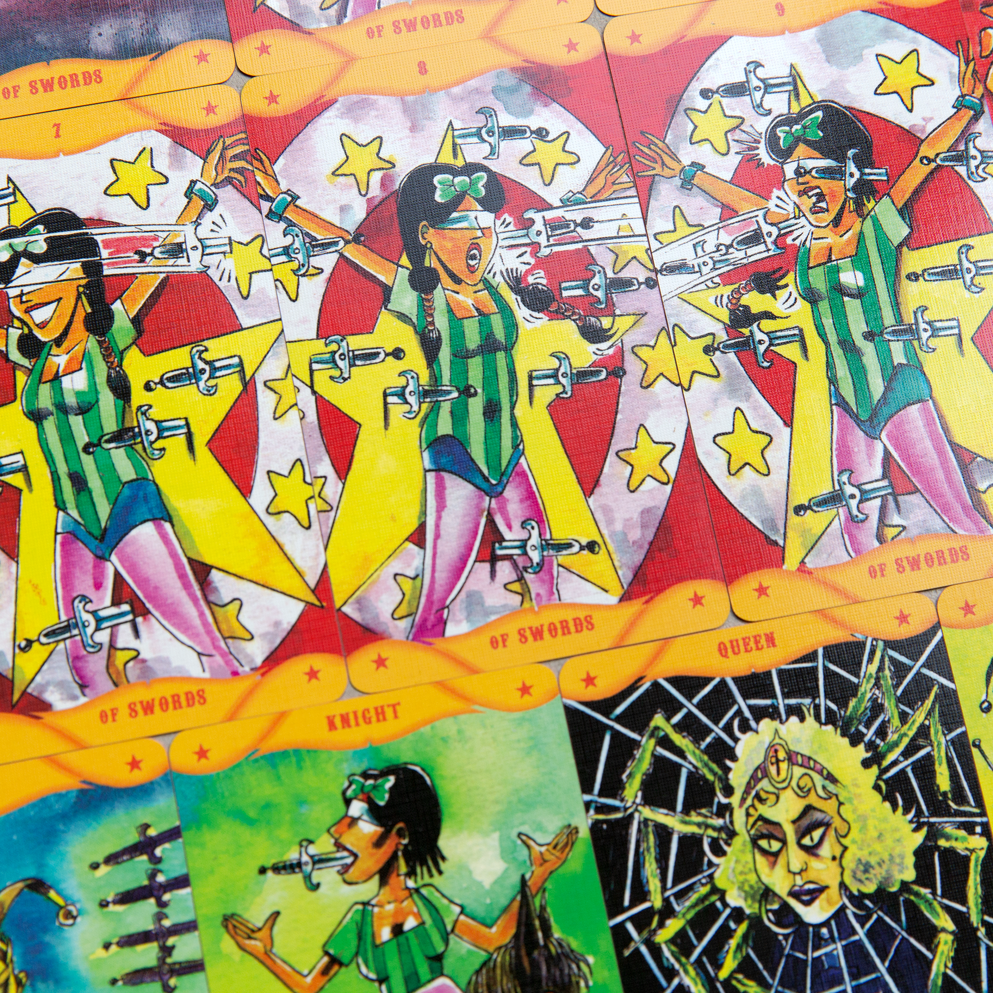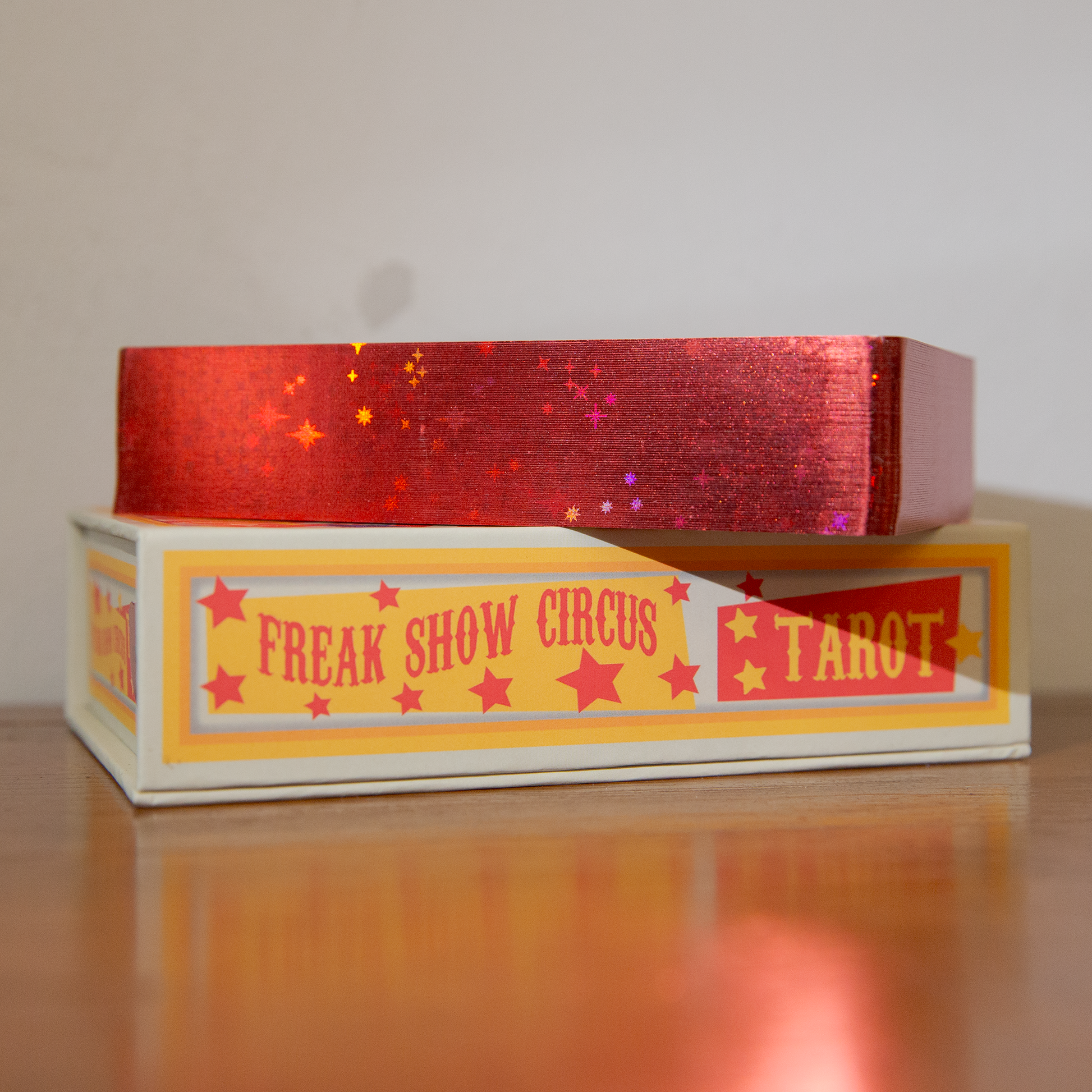 Blending the mystique of tarot with the razzle-dazzle of the big top, this nostalgic deck is your ticket to a spiritual extravaganza! Dressed to impress in a circus poster style, it bursts with cartoonish vibrancy and line work as intricate as a high-wire act. Tarot archetypes take center stage as circus icons – from clowns, magicians, and acrobats to lion tamers, knife throwers, and twin mermaids. Each card performs its own act, brimming with eccentric charm, grotesque humor, and most importantly – emotional depth. Whether you're juggling questions or taming your inner beast, join us – if you dare.
