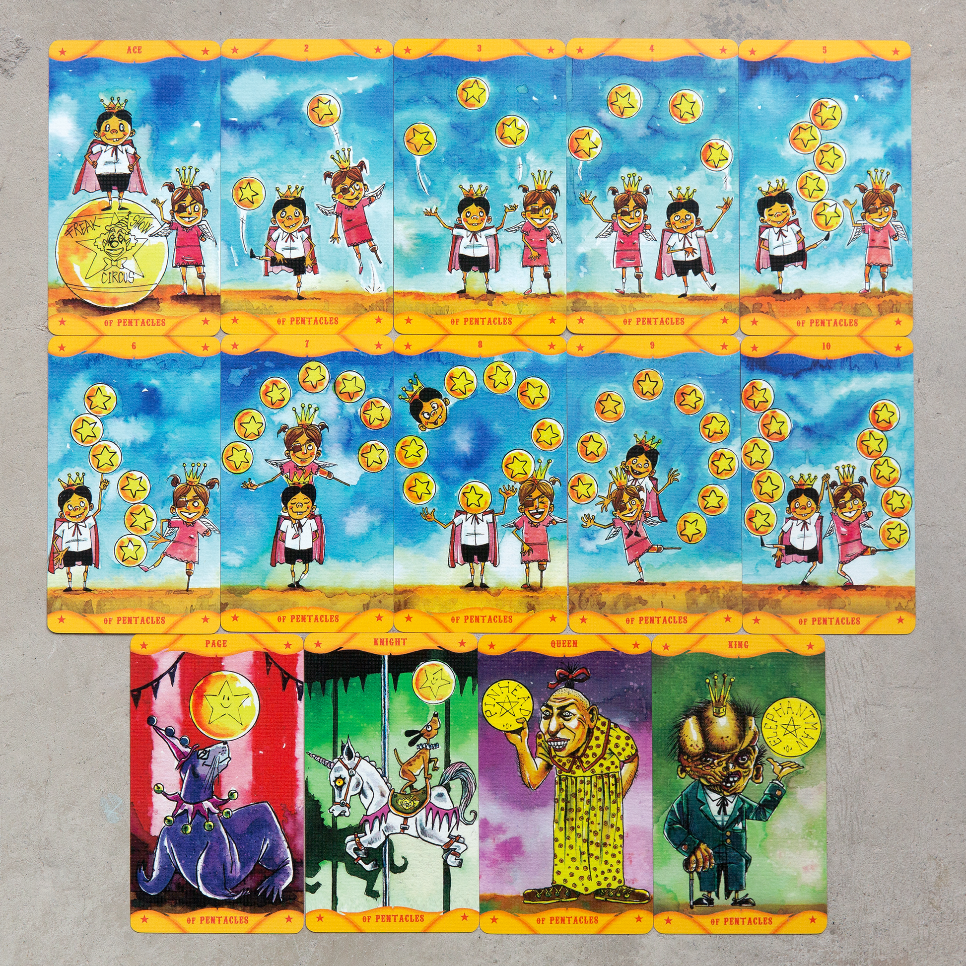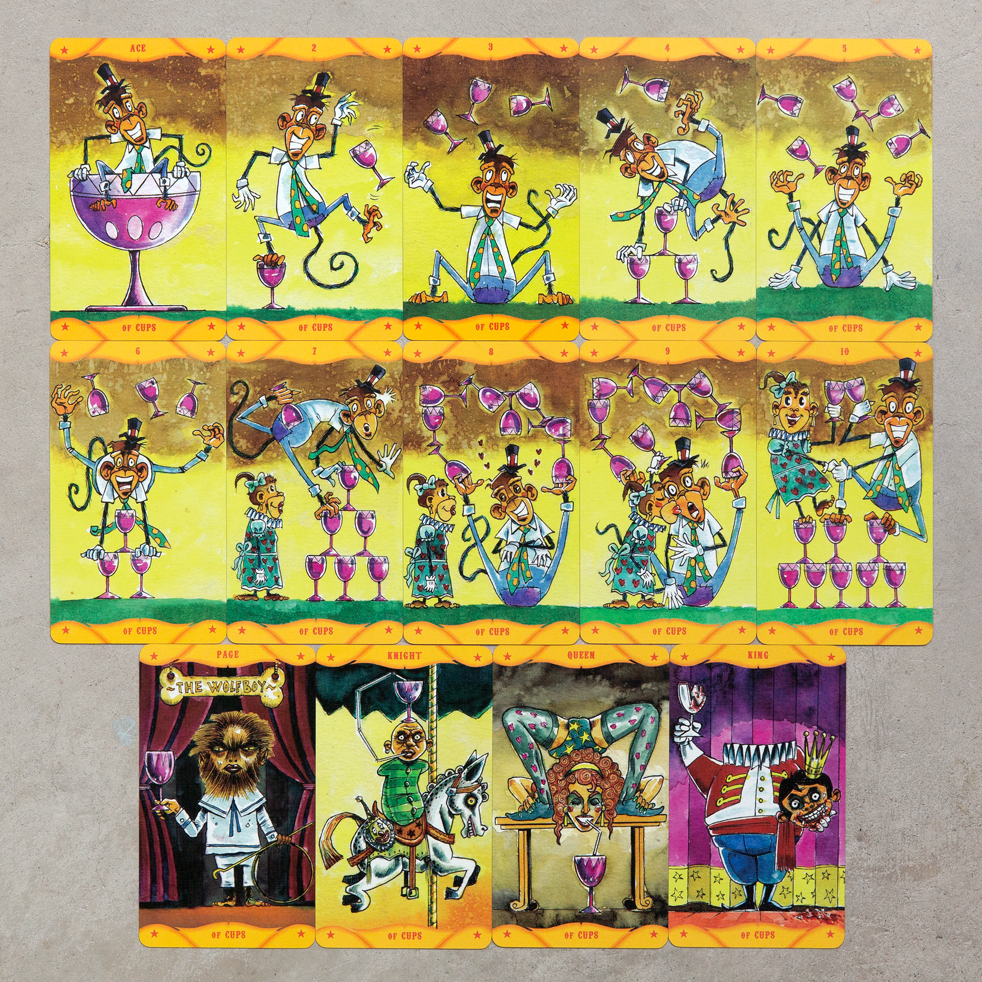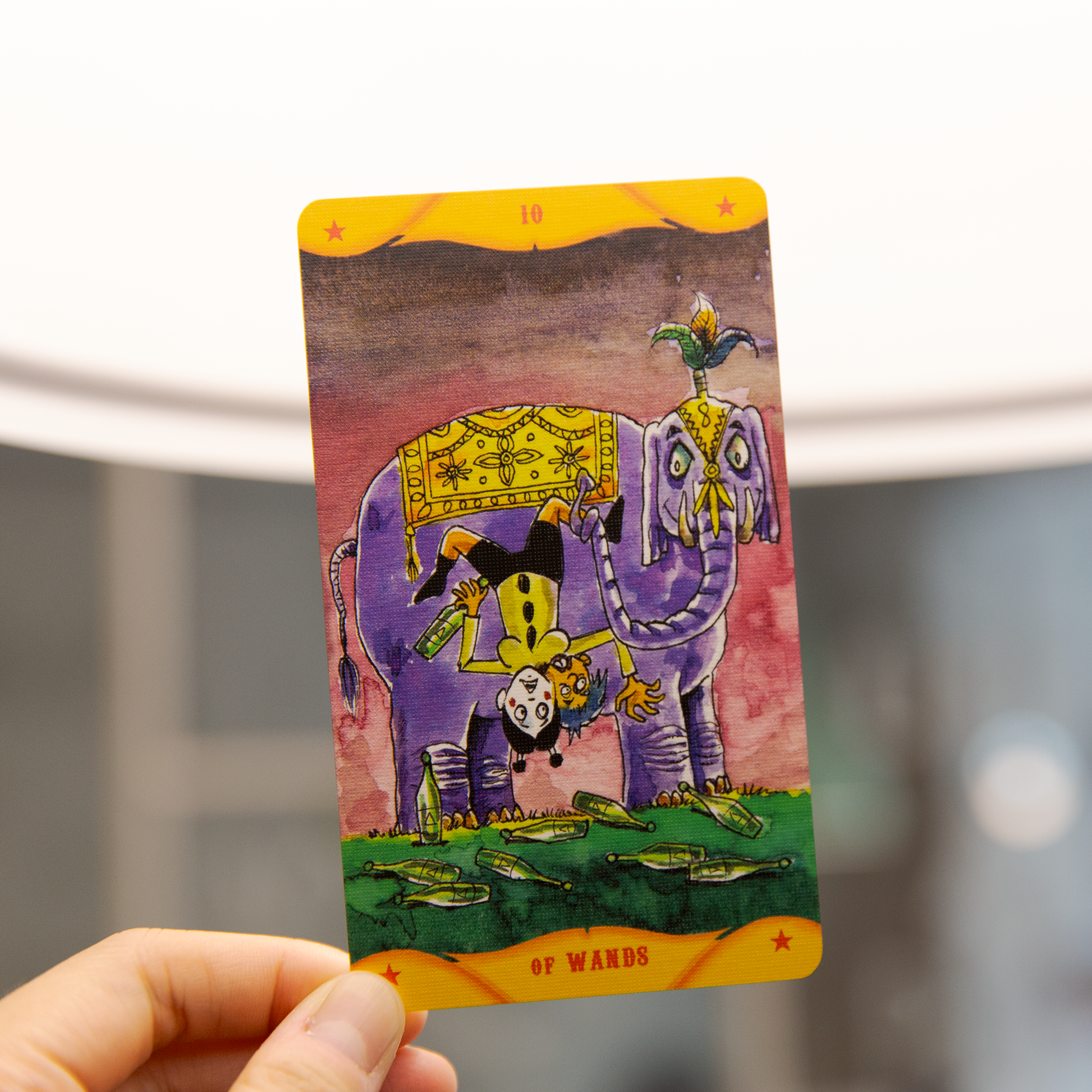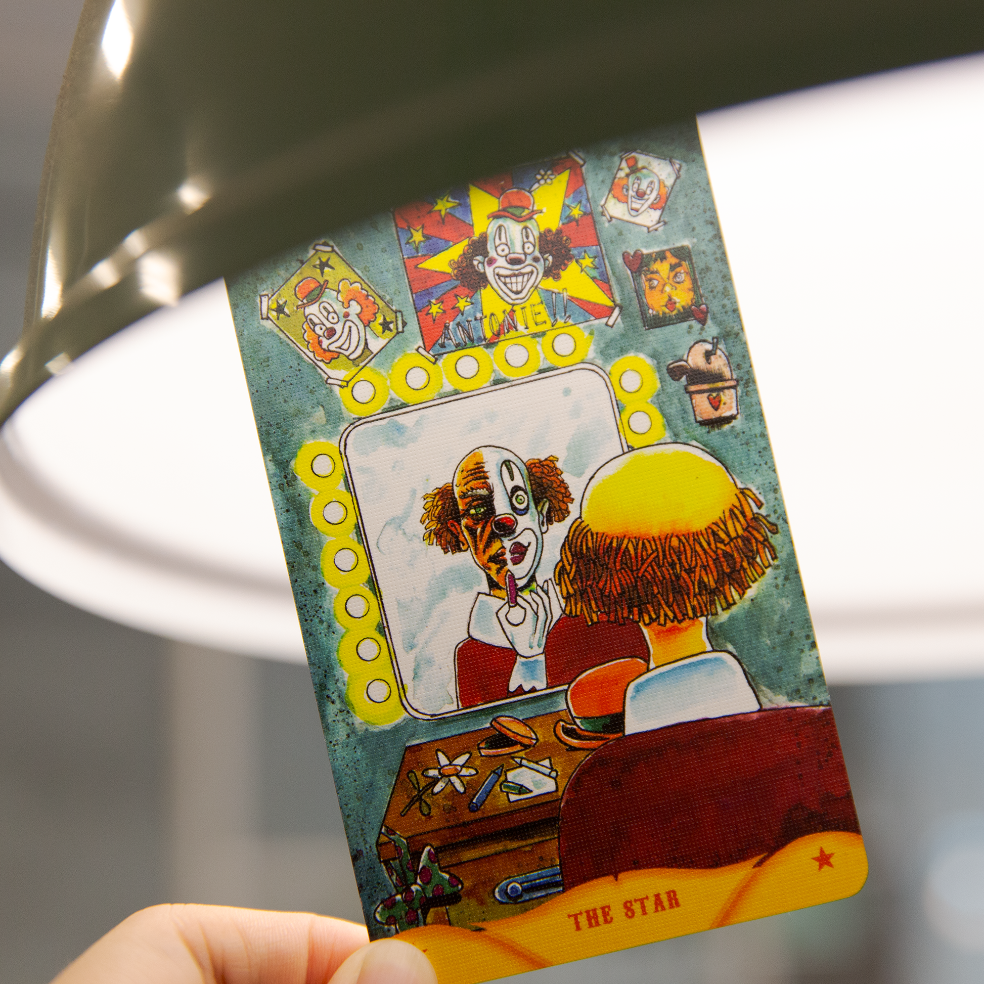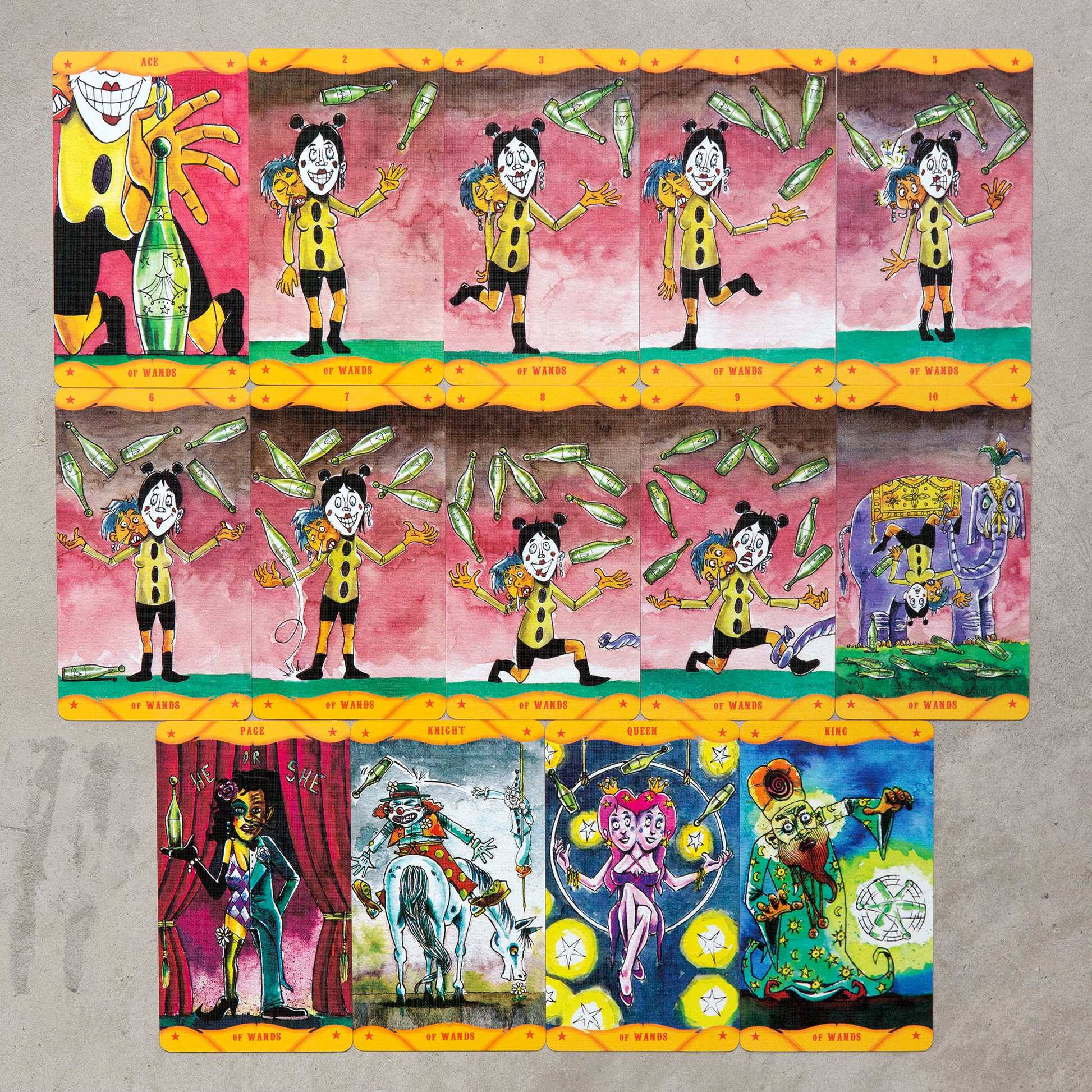 Blending the mystique of tarot with the razzle-dazzle of the big top, this nostalgic deck is your ticket to a spiritual extravaganza! Dressed to impress in a circus poster style, it bursts with cartoonish vibrancy and line work as intricate as a high-wire act. Tarot archetypes take center stage as circus icons – from clowns, magicians, and acrobats to lion tamers, knife throwers, and twin mermaids. Each card performs its own act, brimming with eccentric charm, grotesque humor, and most importantly – emotional depth. Whether you're juggling questions or taming your inner beast, join us – if you dare.