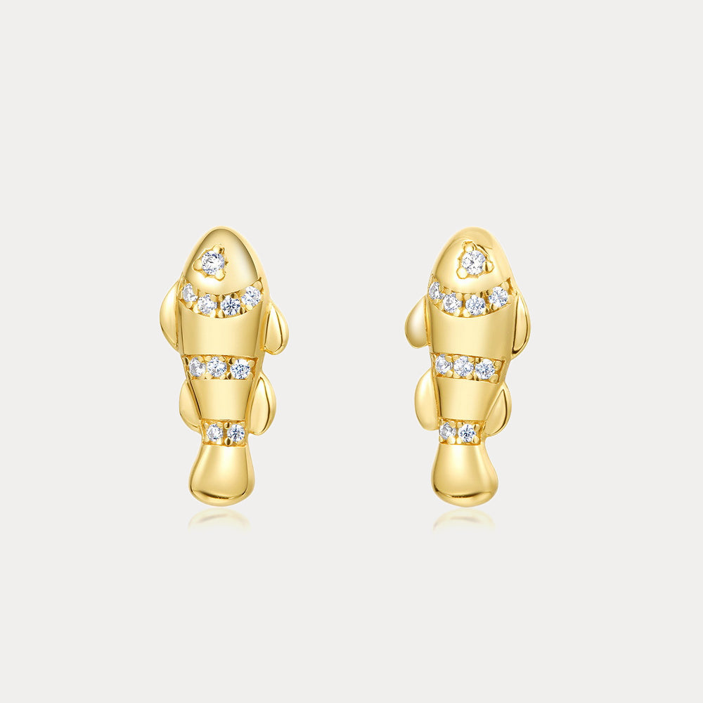 Delight in the playful elegance of our Gold Fish Stud Earrings, where exquisite design meets oceanic inspiration. These charming earrings feature a delightful fish motif, each meticulously crafted in 10K gold on silver. Inspired by the beauty and importance of ocean creatures, these earrings serve as a reminder of the need to protect and cherish marine life. The fish are adorned with sparkling cubic zirconia, capturing the light with every movement and adding a touch of whimsy to your style.