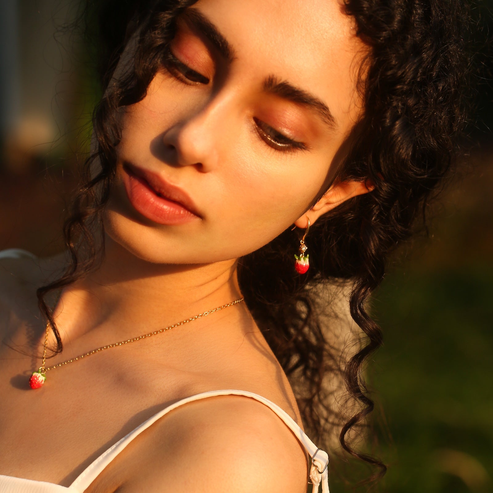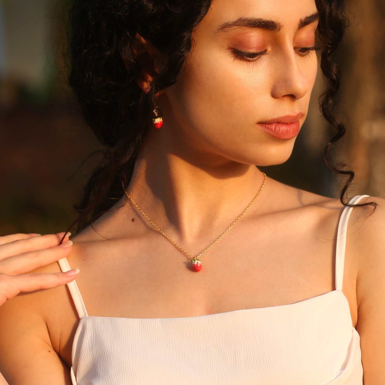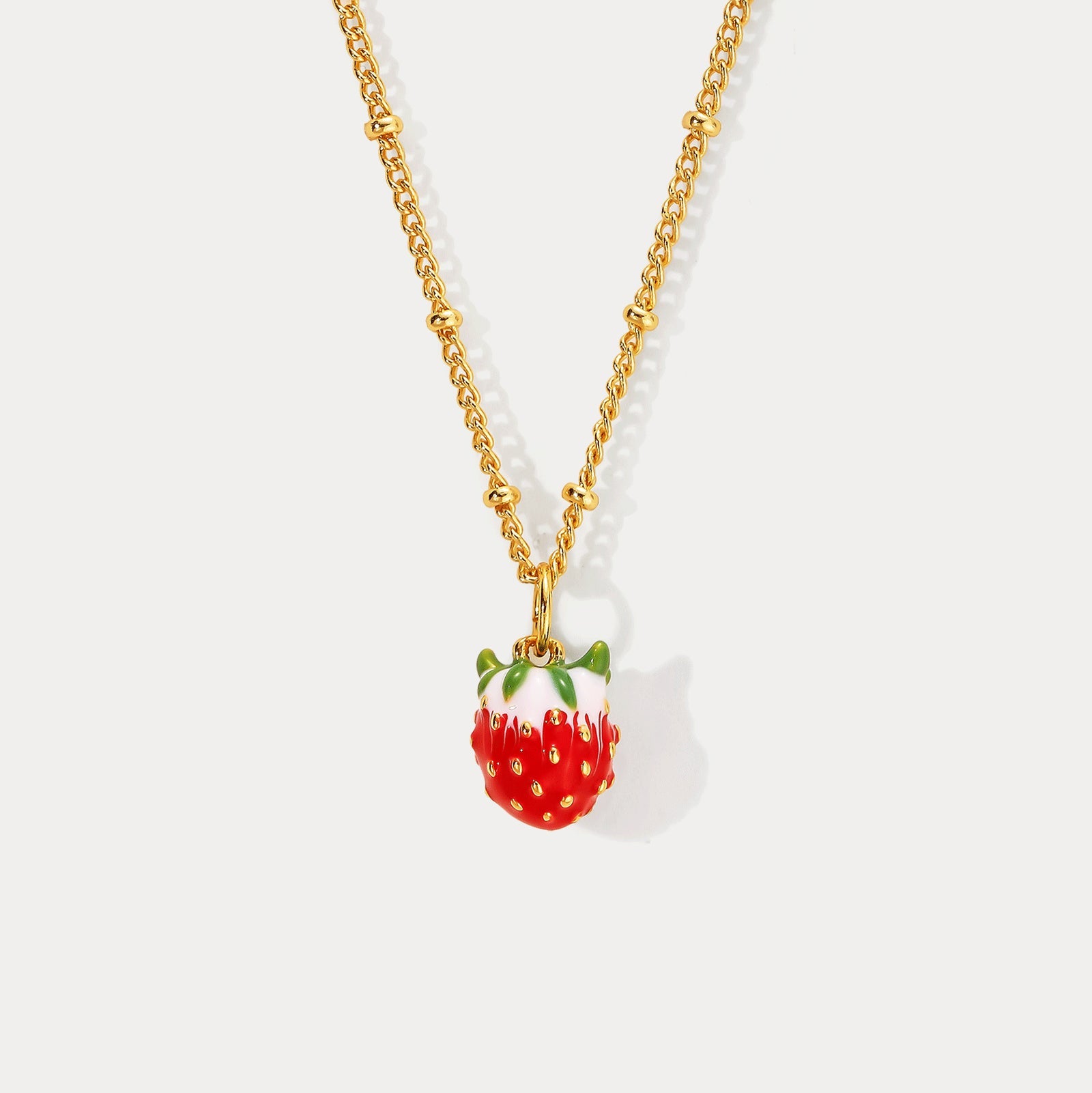 Infuse your style with the delightful charm of the Strawberry Necklace, an exquisite piece that captures the essence of nature's sweetness. This enchanting necklace features a beautifully crafted strawberry pendant, adorned with vibrant enamel detailing that brings the fruit to life in vivid color. Made from durable brass and lavishly coated in 18K gold, the necklace radiates luxury and ensures lasting quality. The strawberry, a symbol of love and happiness, adds a whimsical yet sophisticated touch to your jewelry collection. Perfect for both everyday wear and special occasions, the gold strawberry necklace is a captivating standalone statement piece or a lovely addition when layered with other favorites. Celebrate the joy and beauty of nature with this enchanting accessory, sure to add a touch of sweetness and elegance to any outfit.