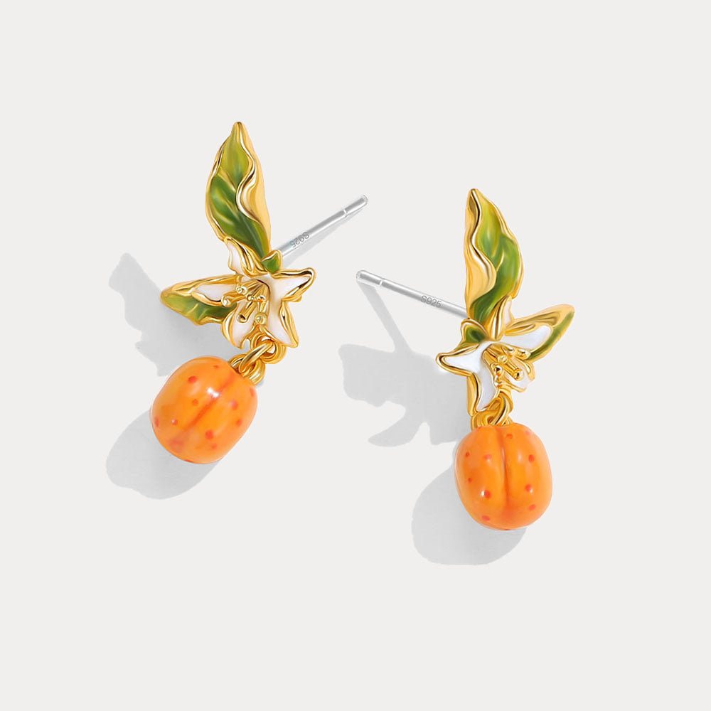 Indulge in the splendor of nature’s finest with our Golden Plum Earrings, a pair that captures the essence of botanical elegance through masterful craftsmanship and exquisite design. These earrings are a harmonious blend of delicate floral motifs and the rich warmth of golden plums, designed to add a touch of luxury and natural beauty to your ensemble. Each earring features a beautifully detailed blossom, its petals rendered in pristine white enamel and framed by verdant green leaves that seem to come alive with their intricate detailing. Let the Golden Plum Earrings be the finishing touch that completes your look, bringing a sense of refined sophistication and natural beauty to your wardrobe.