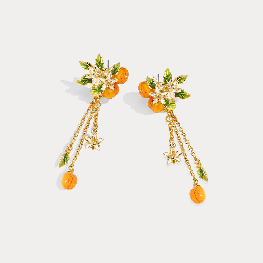 Infuse your style with a touch of nature-inspired elegance with our Golden Plum Drop Earrings, a striking accessory that captures the essence of botanical beauty. These exquisite earrings are meticulously crafted, featuring delicate plum motifs adorned with vibrant orange and green enamel. Each earring showcases a cluster of golden plums and leaves, accented by petite white blossoms that cascade down on fine golden chains. Whether you're dressing up for a special occasion or adding a unique touch to your everyday style, these earrings are sure to elevate your ensemble. Their botanical elegance and artful design make them a must-have accessory for those who appreciate the finer details in life.