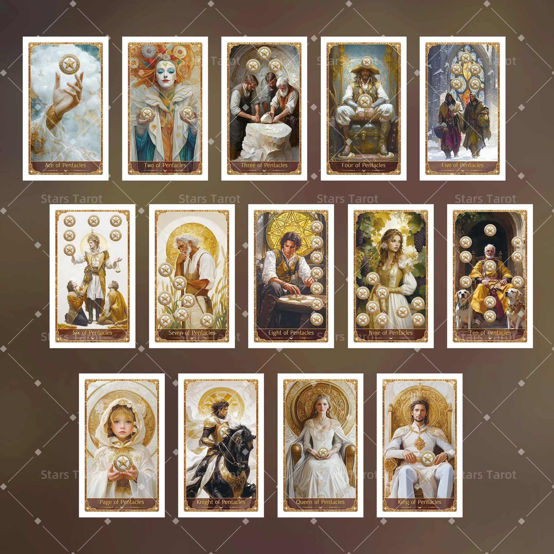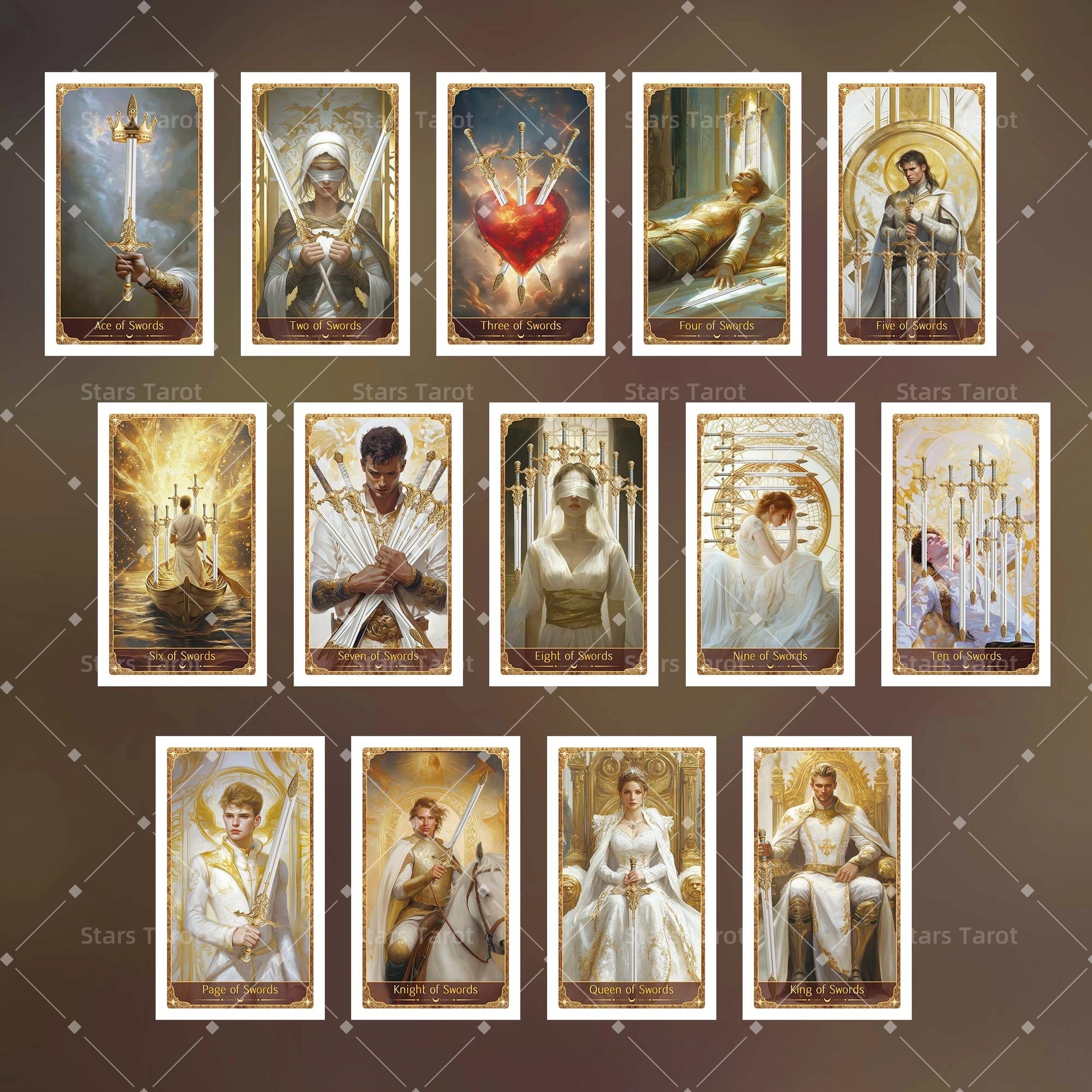 Wrapped in quiet grandeur, for moments of deep inquiry. A matte finish lends the cards a velvety, museum-like presence, while royal gold frames whisper of legendary kingdoms and divine order. The art feels stately, with angels, monarchs, and celestial guardians captured in poised stillness.