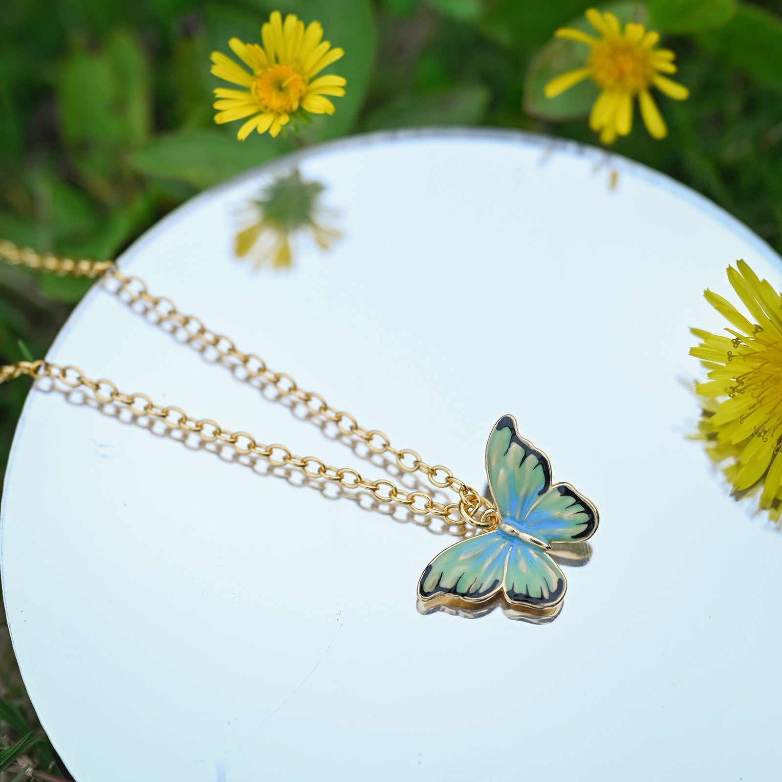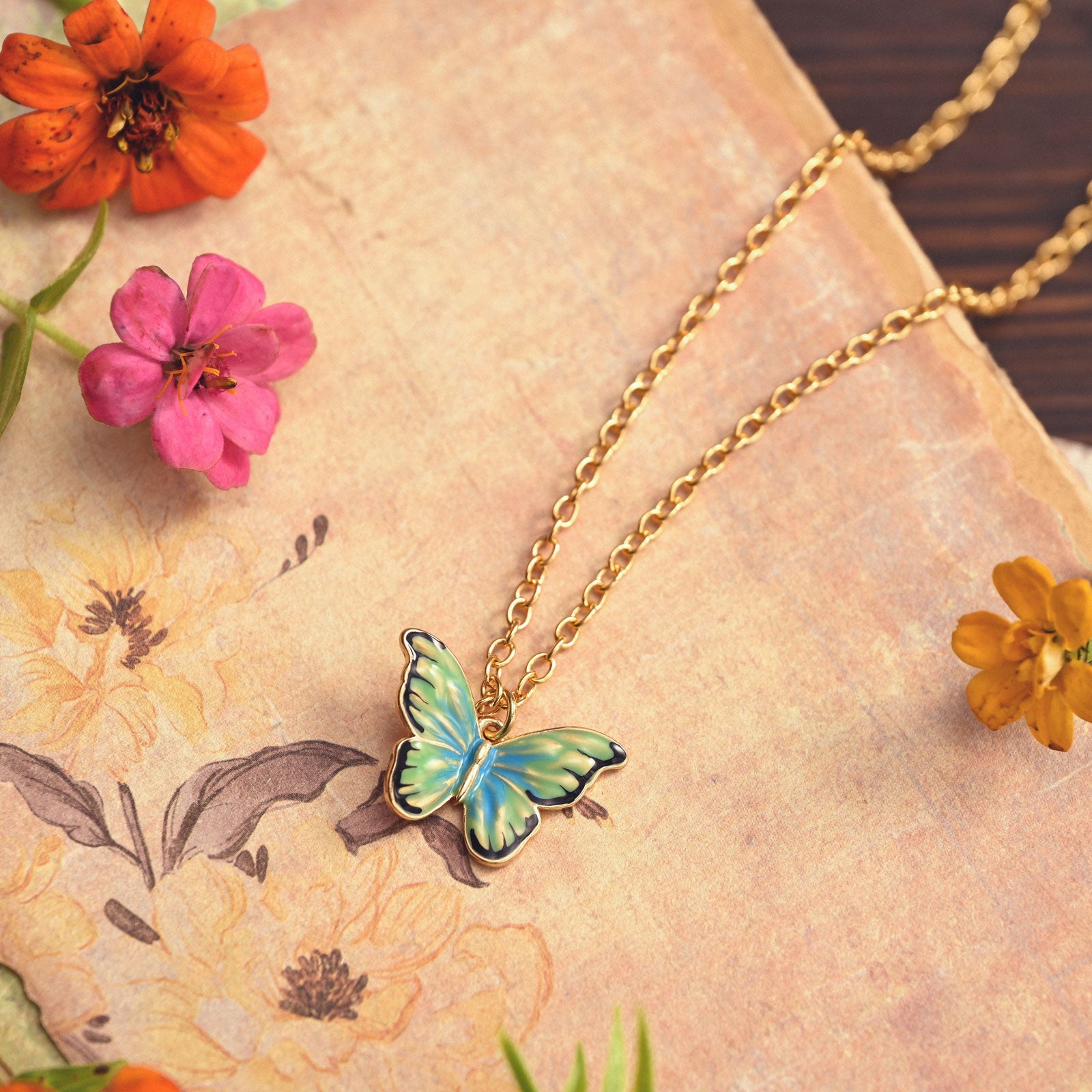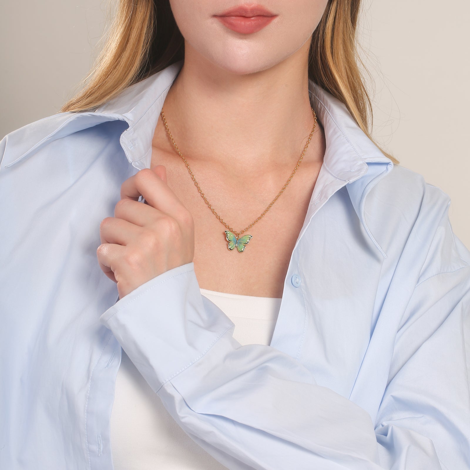Adorn yourself in this Green Butterfly Necklace, a stunning embodiment of transformation and beauty, featuring a delicately crafted butterfly pendant in vibrant shades of green and gold. The intricate details of the wings are highlighted by the luminous enamel finish, creating a striking contrast against the elegant gold chain. This necklace exudes a sense of lightness and grace, making it a perfect accessory for adding a touch of whimsy and sophistication to any outfit. Ideal for those who cherish the symbolism of the butterfly, this piece elevates your style with its enchanting design and timeless appeal.