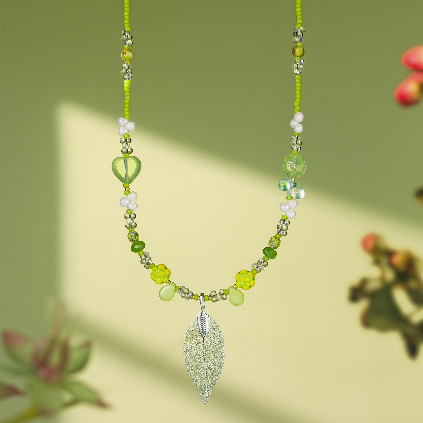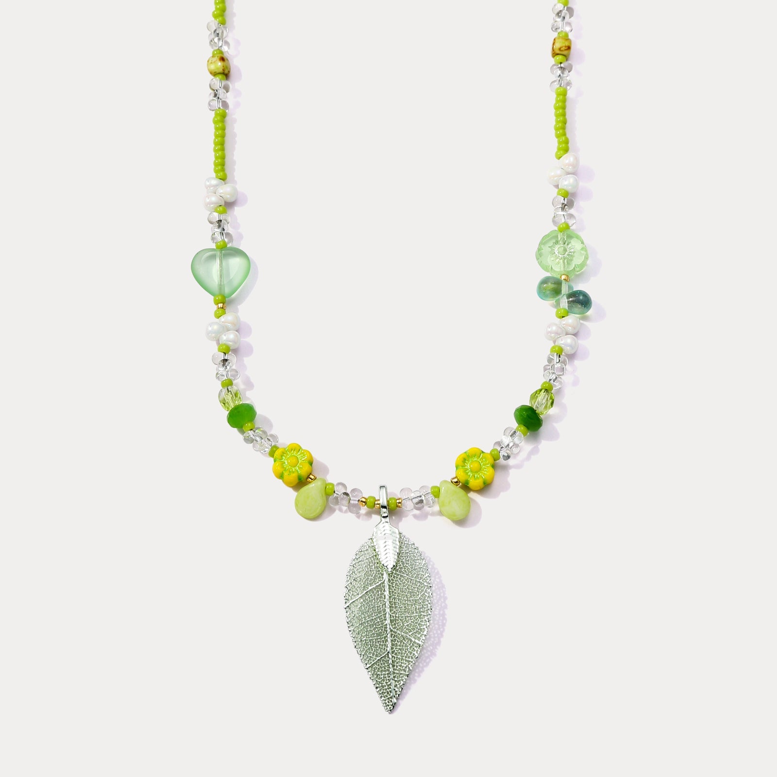 A touch of summer forest romance rests at the neckline with the Green Leaf Bead Necklace. Vibrant green beads are paired with translucent crystals and pearls interspersed with heart and flower shaped beads that seem to gather all the vitality and charm of a woodland. The silver leaf pendant on this green leaf necklace features clear veins like a freshly fallen leaf exuding a natural and refreshing feel. The lightweight beaded design brightens a simple shirt in everyday wear or enhances a forest inspired long dress with a natural vibe. Whether strolling through a park or attending a casual artsy gathering this leaf necklace feels like wearing a lush little green world around your neck fresh and distinctive a lovely accessory to adorn your day and embrace nature.