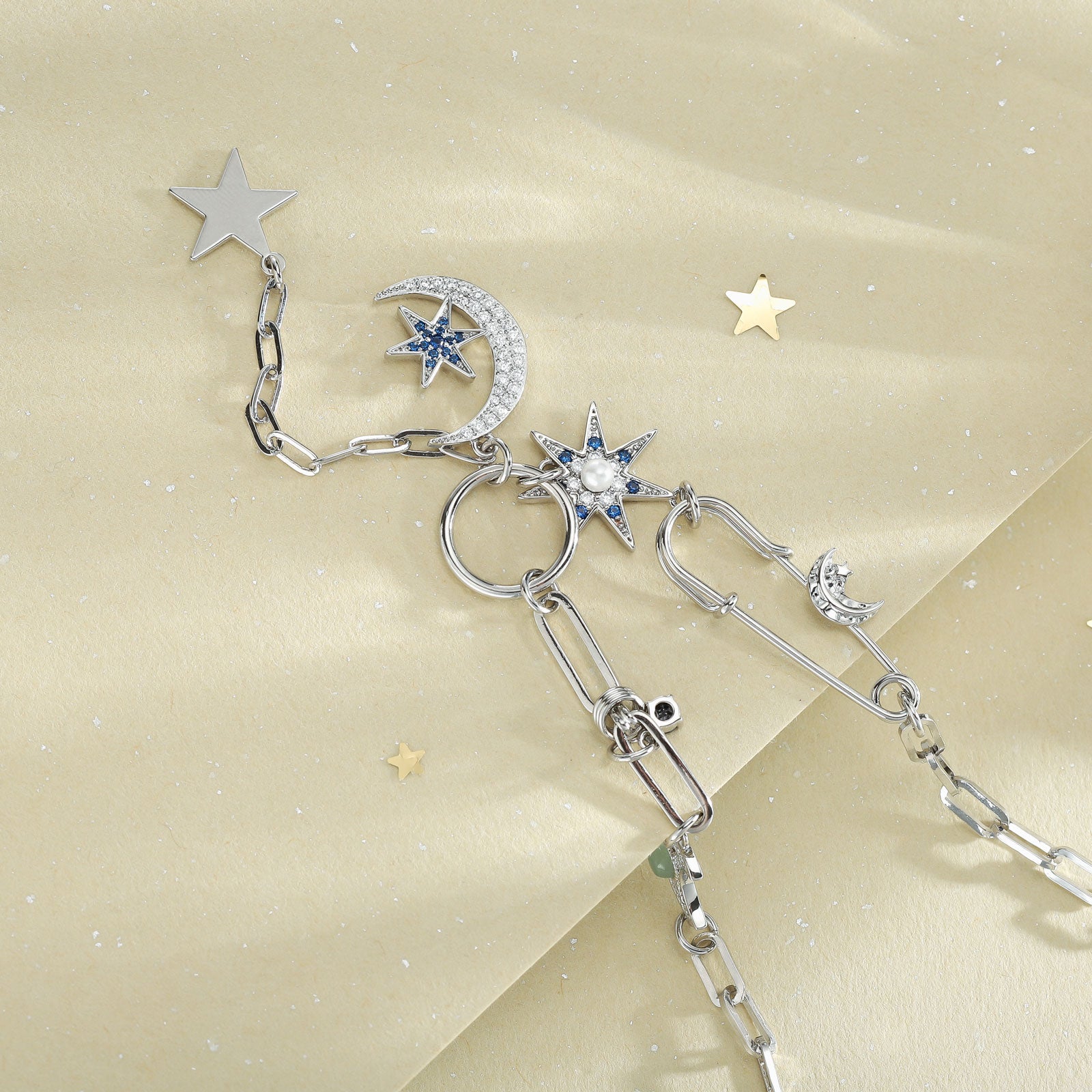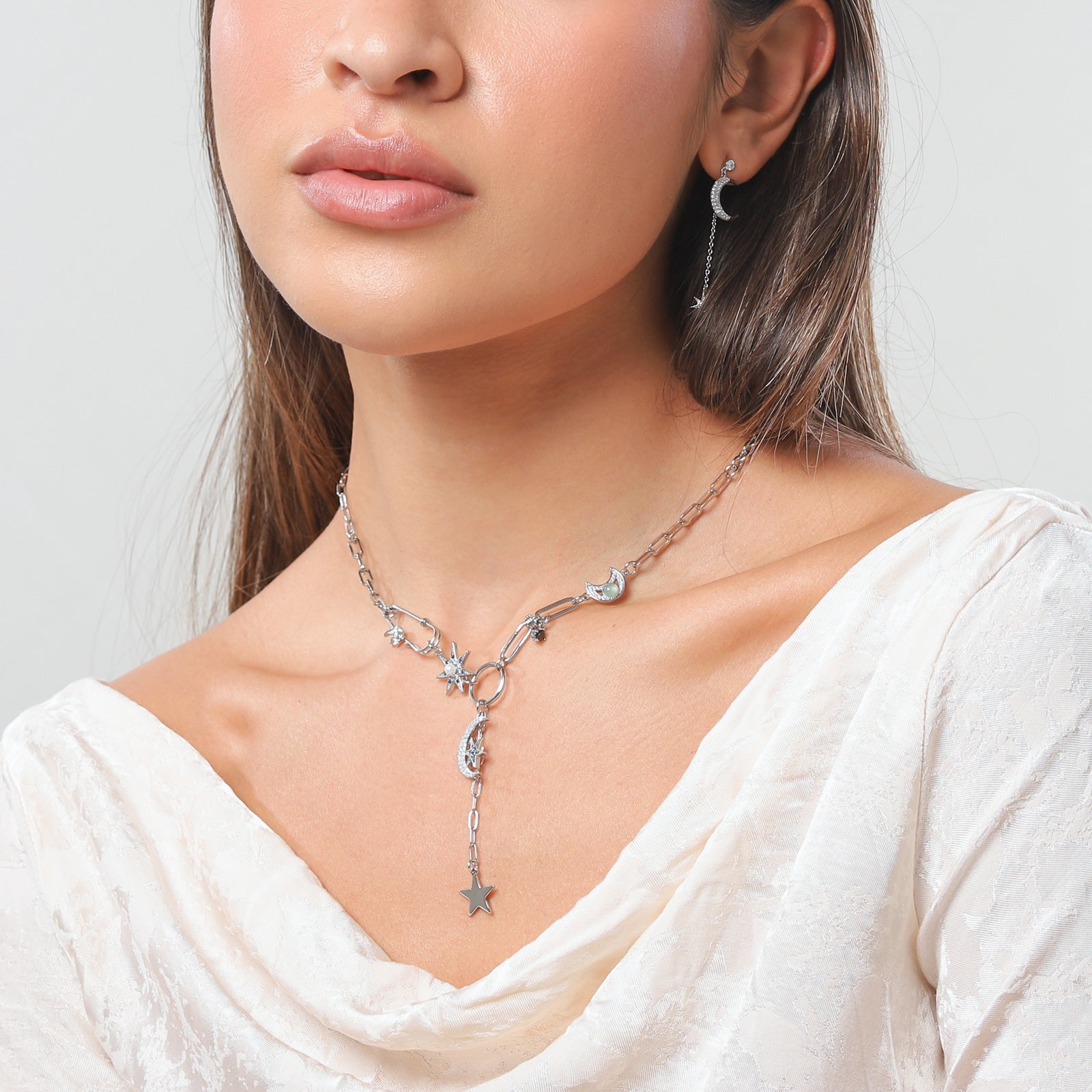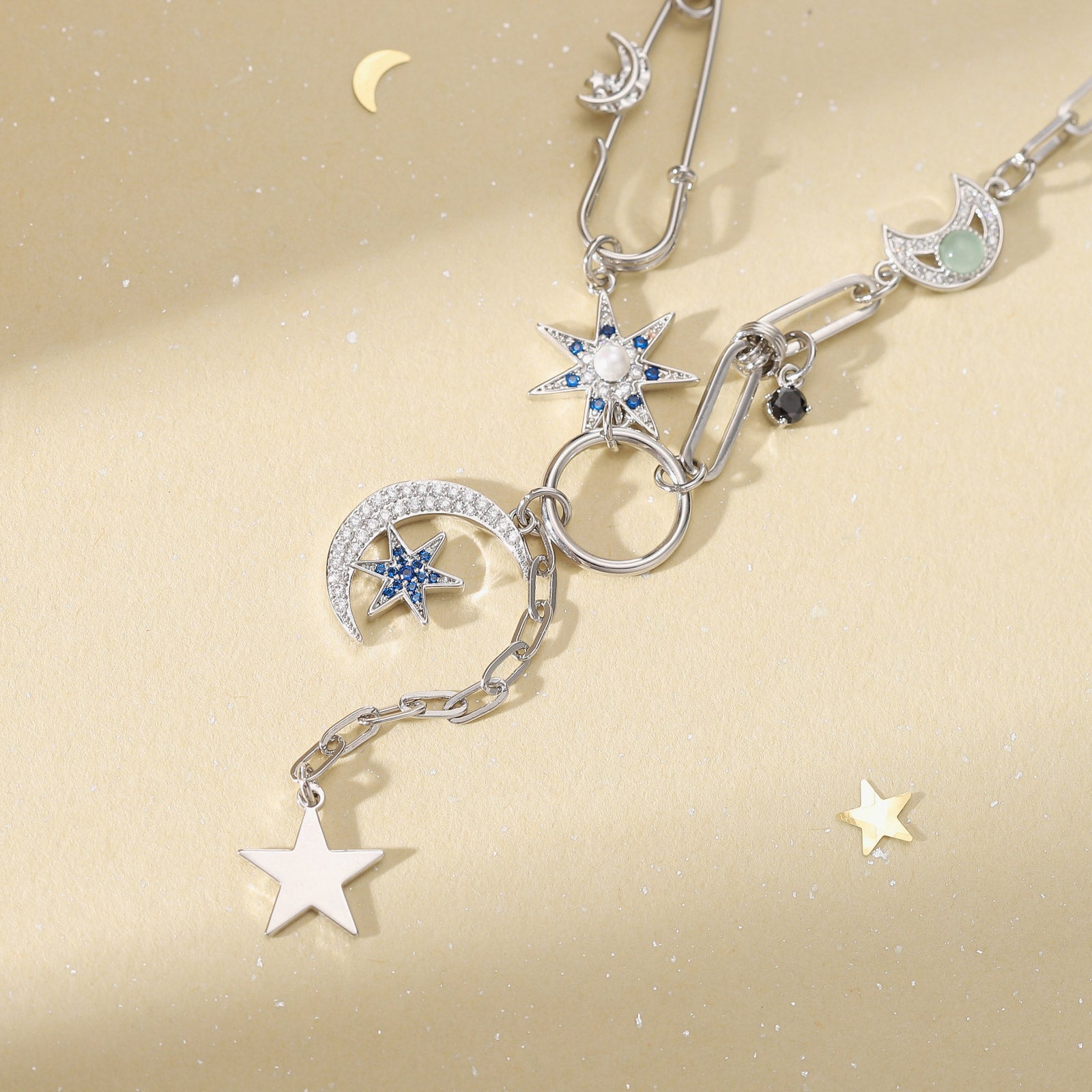 Enchant yourself with the elegant Guardian of the Stars and Moon Necklace. This exclusive, hand-crafted piece features a luxurious silver color with intricate celestial designs that evokes a sense of sophistication and timelessness. Let this beautiful necklace be the guardian of your stylish night sky.