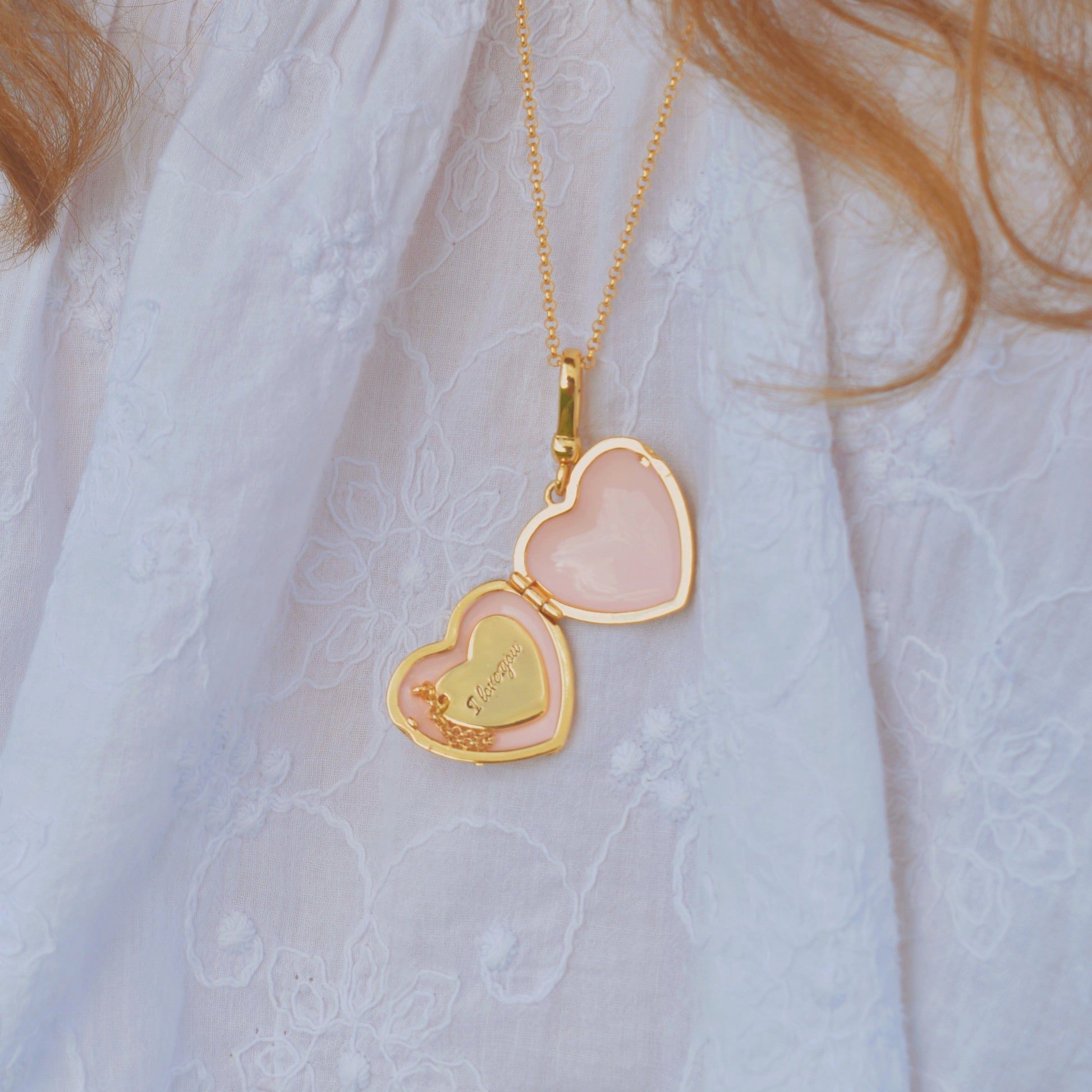 The text on the gold heart inside of the pendant can be customized according to your preferences. Please allow 7-12 days for customing before shipping