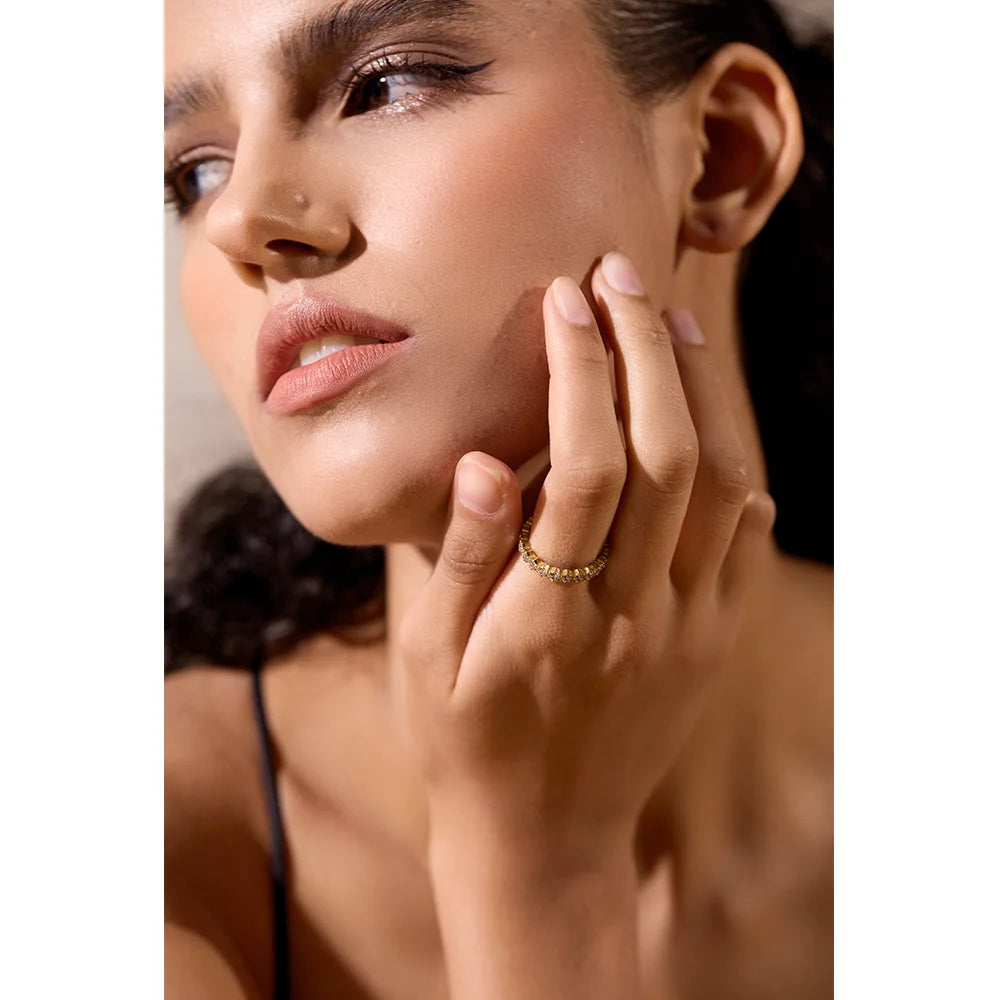 This stunning Honeycomb Band is your go-to for everyday elegance. Crafted from durable stainless steel and adorned with shimmering cubic zirconia crystals, it features a unique scalloped honeycomb design that catches the light beautifully. Whether you choose gold or silver, this ring is the perfect mix of modern style and timeless charm. It’s subtle enough to stack with other rings but bold enough to wear solo. Trust me, it’ll become your new favourite!