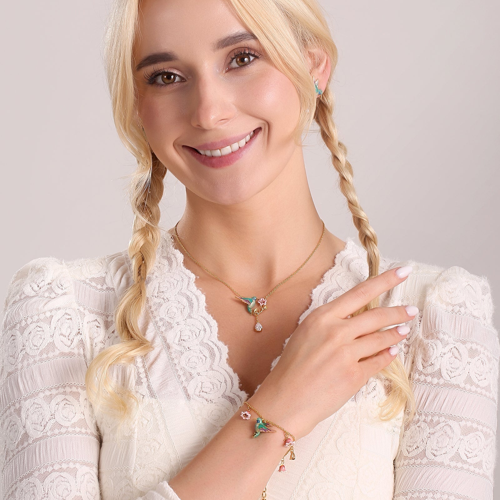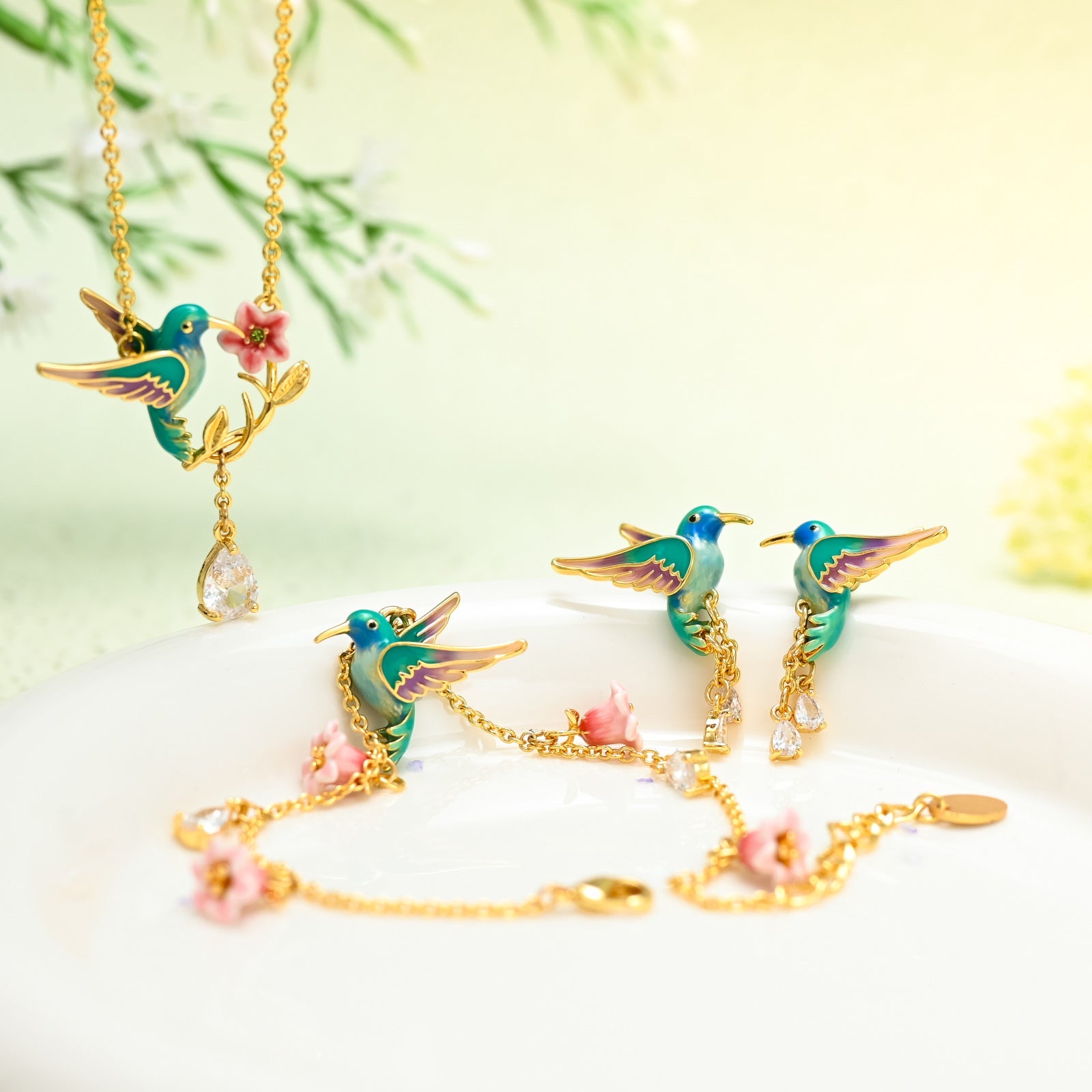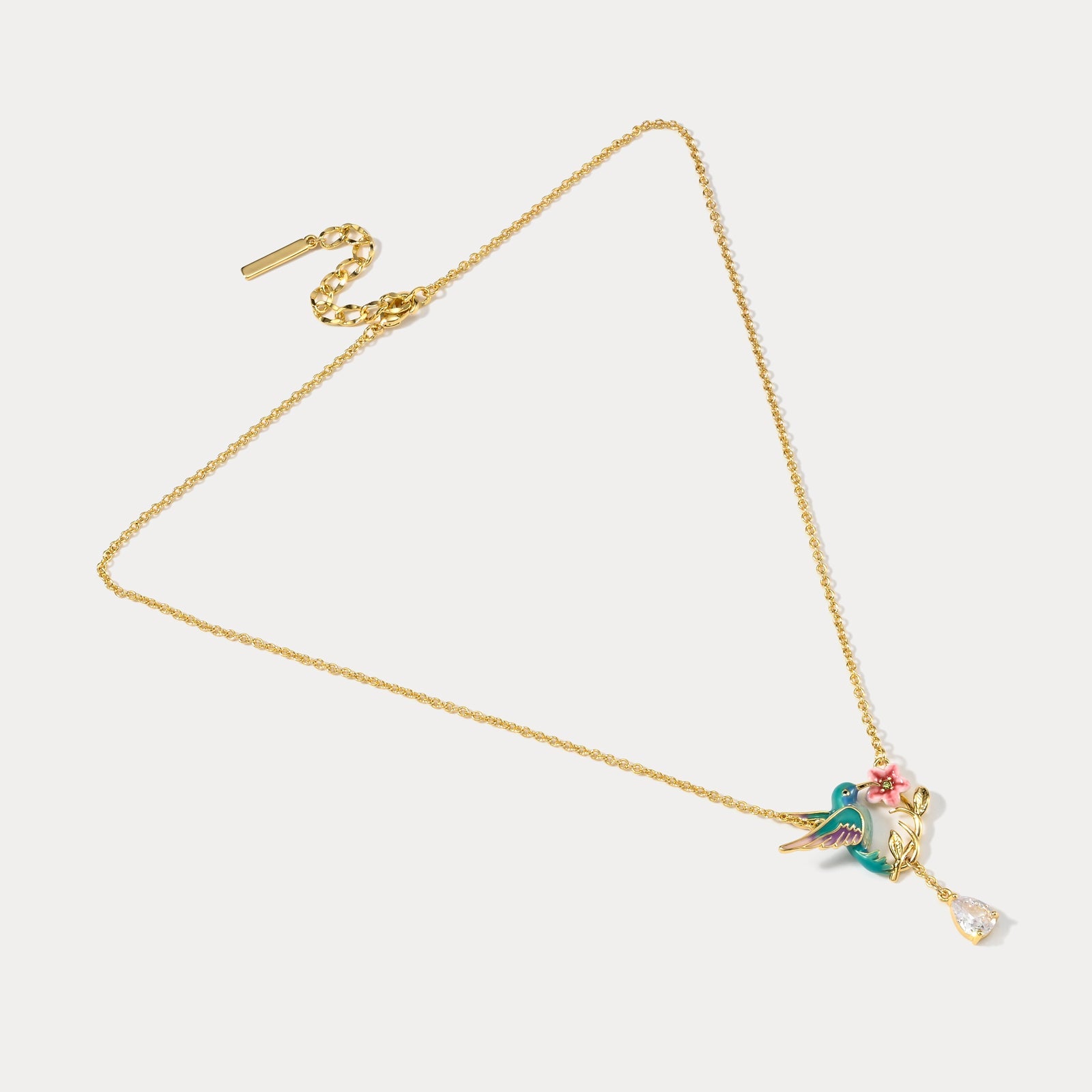 Embrace the delicate beauty of nature with our Enamel Hummingbird Necklace, a captivating piece that brings the vibrant energy of the hummingbird to life. This exquisite necklace features a finely detailed hummingbird pendant, its wings outstretched in flight, showcasing a stunning blend of rich blue and green enamel. Each feather is meticulously painted, capturing the iridescent charm of this beloved creature. Its vibrant colors and intricate craftsmanship make it an ideal accessory for those who appreciate the finer details in life. Let this necklace be a reminder of the beauty and joy found in the natural world, and how it can be elegantly translated into your personal style.