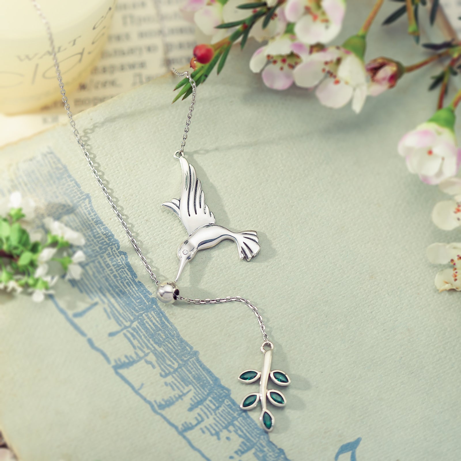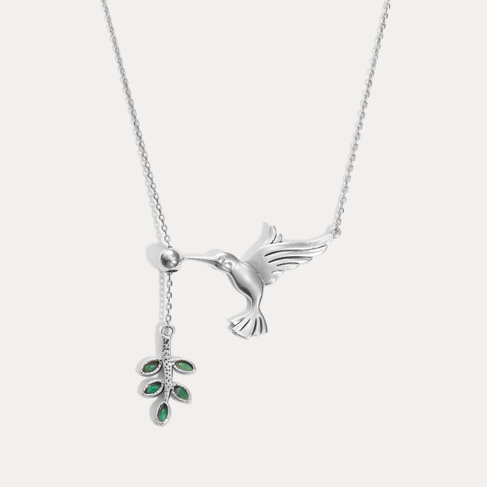 Experience the versatile beauty of our Hummingbird & Olive Branch Necklace, where the placement of the hummingbird can gracefully transform. This exquisitely designed pendant necklace offers flexibility, allowing it to change into a stylish Y-shape. Adorned with an intricately detailed hummingbird and an olive branch, this piece symbolizes grace and peace. Embrace the adaptability of this necklace, allowing you to customize your style with the charming essence of nature.