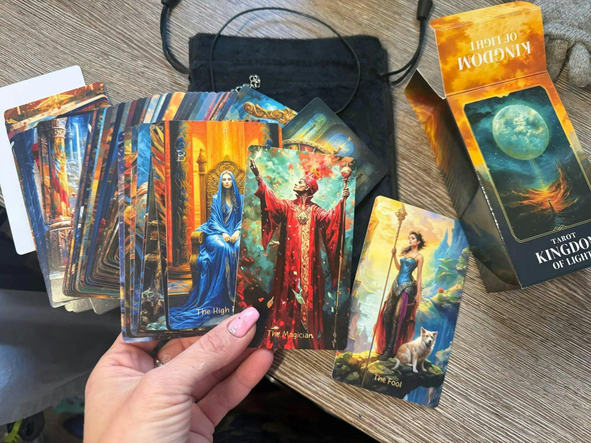 A luminous celebration of life. The cards glow with fiery colors; the figures are painted with bold strokes. The artwork is cinematic, making every draw an adventure into a realm where light itself guides your destiny. A vibrant deck for those who read with passion and heart.