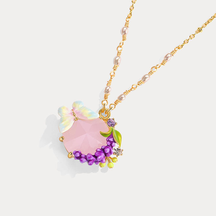 Add a touch of grace to your summer wardrobe with our Lavender Butterfly Pearl Necklace. The glitter pink crystal, as the main body, is surrounded by delicate enamel lavender and butterfly accents, evoking feelings of tenderness and gentleness. This romantic and elegant piece is perfect for women of any age, embracing the beauty of nature.