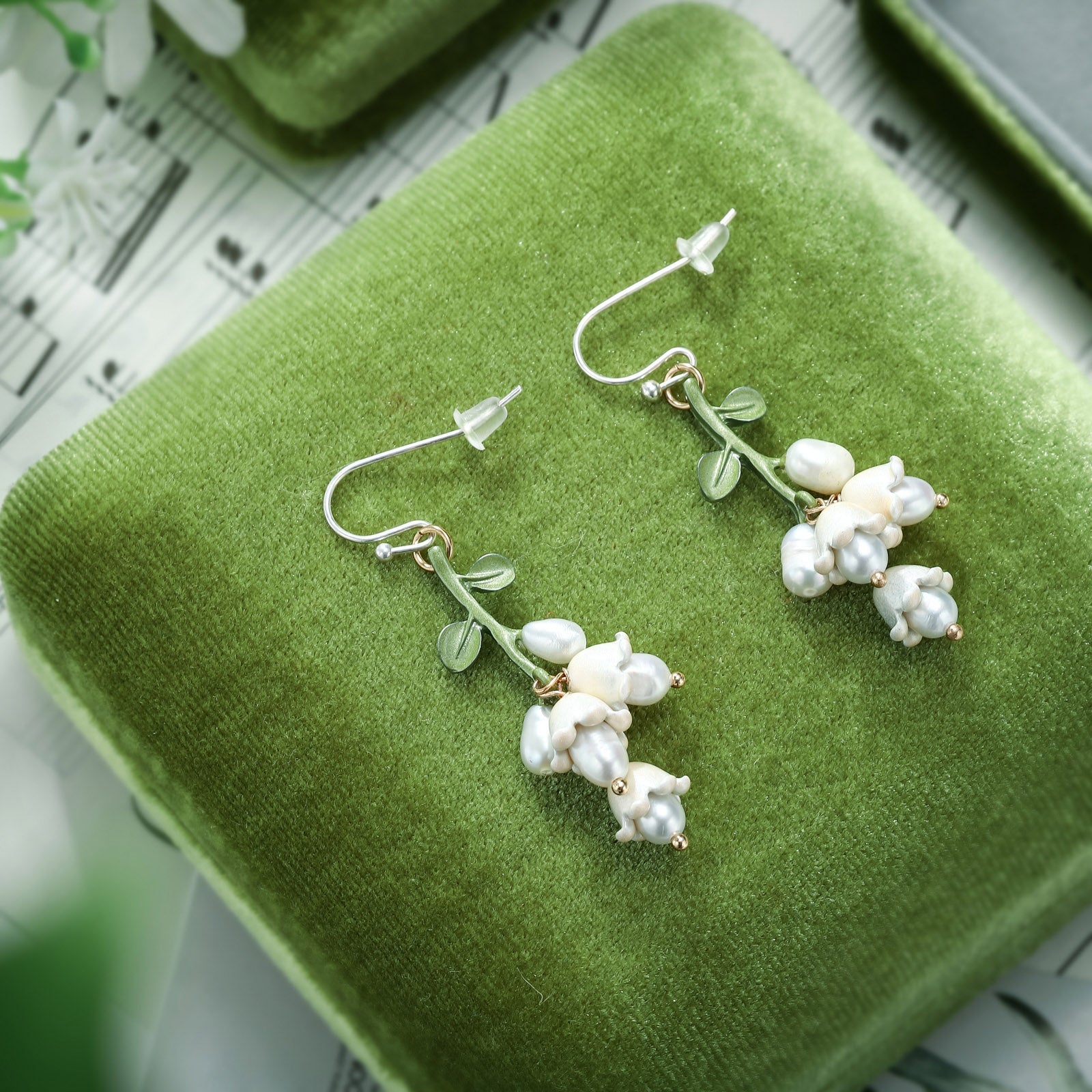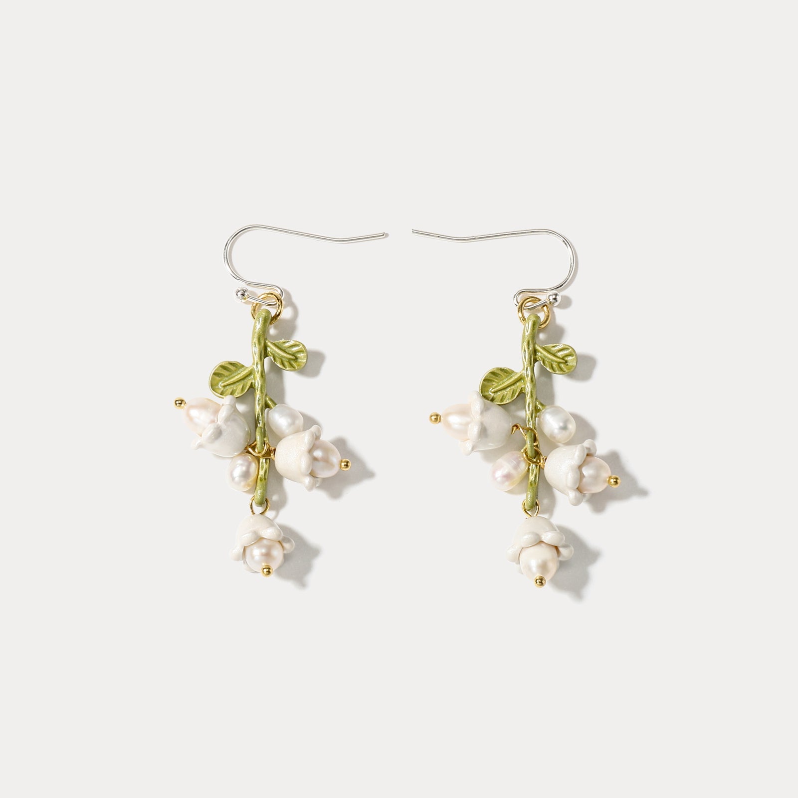 Inspired by the flowers of lily of the valley symbolizing good wishes and happiness, these little bell-shaped flowers earrings which grow in clusters are meant to be a good choose to give this exquisite Earrings to someone you love to wish them good luck and prosperity. The Lily Of The Valley Earrings Necklace is made of high-quality alloy, freshwater Pearl and 18k gold brass. >>See More Lily of the Valley Jewelry Collection.