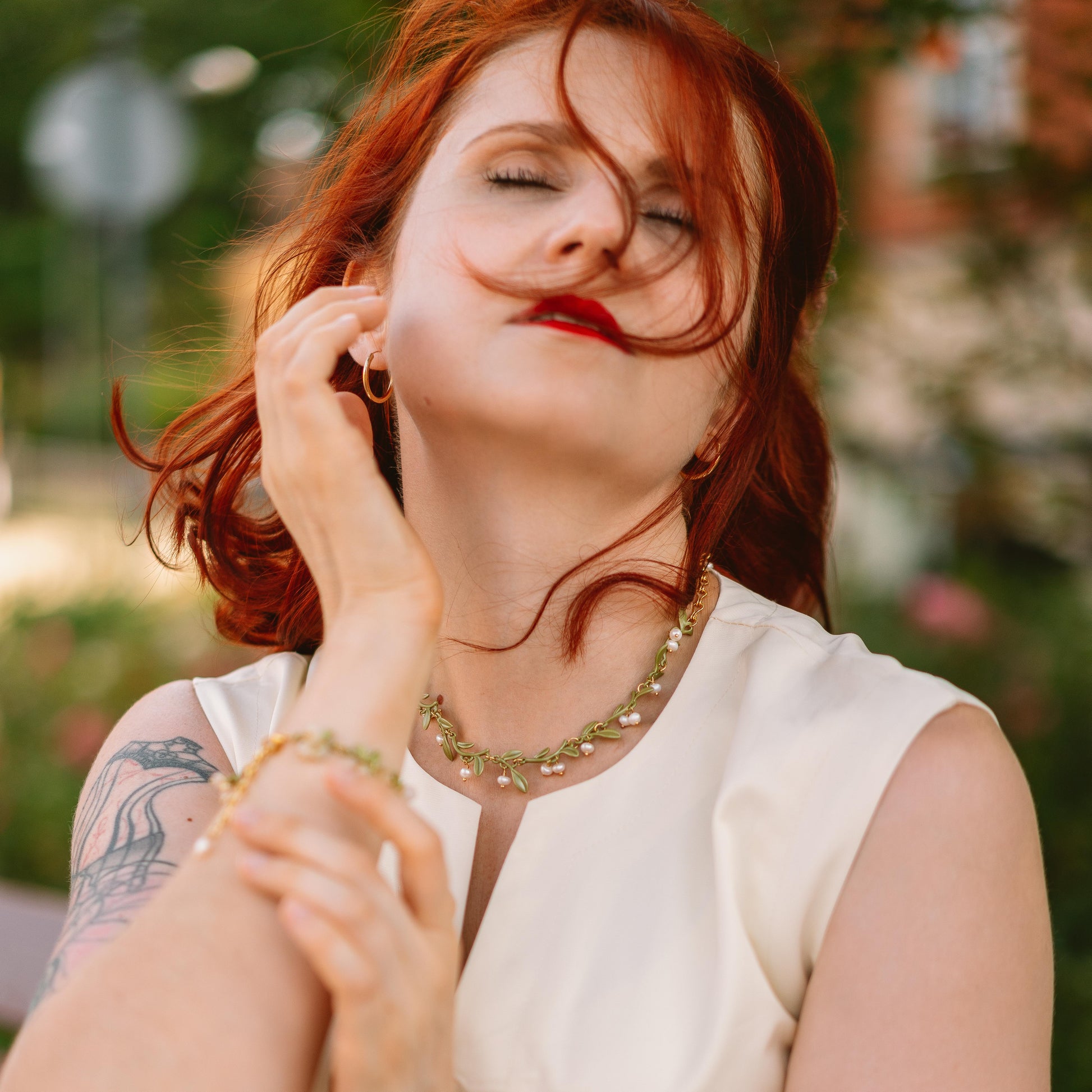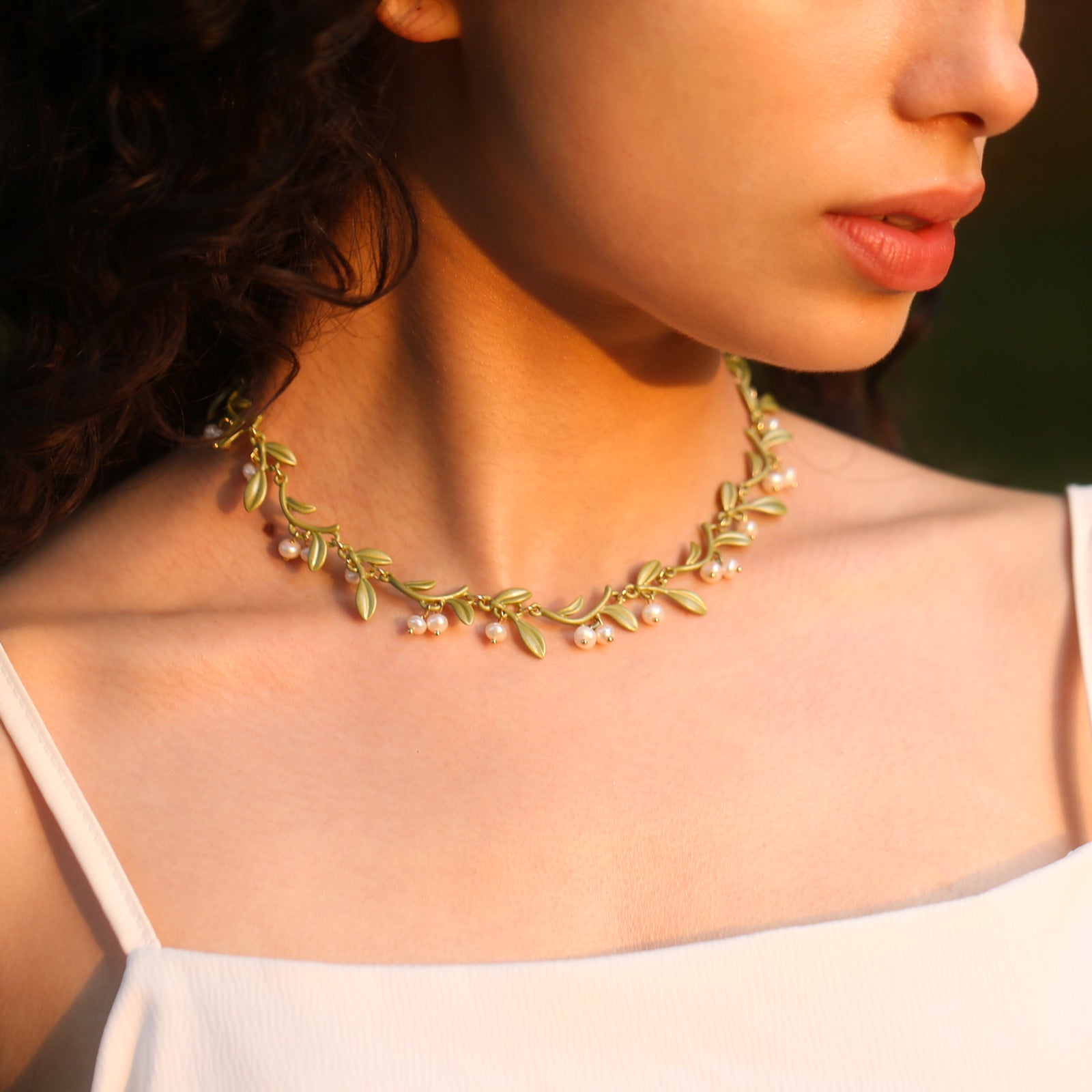 Adorn yourself with the enchanting beauty of our Lily of the Valley Necklace, a piece that captures the delicate charm and profound symbolism of this beloved flower. This exquisite necklace features a garland of verdant leaves and dainty blossoms, each leaf delicately enameled in a soft green hue. Interspersed among the leaves are lustrous pearls, symbolizing purity and new beginnings, which are set in a luxurious 18K gold on brass base, adding a touch of timeless elegance. Perfect for both casual and formal occasions, this necklace adds a sophisticated charm to any ensemble.