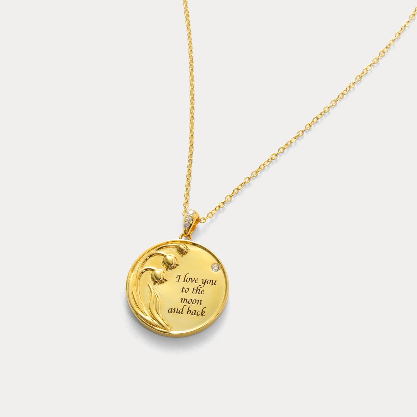 Embrace the beauty of this Lily of the Valley Personalized Coin Pendant Necklace, a luxurious piece that beautifully blends elegance with sentiment. This stunning gold coin pendant features an intricately engraved lily of the valley motif, symbolizing purity and sweetness, alongside a personalized message which can be decided by you for someone special. Crafted from high-quality 18K gold, this necklace radiates warmth and sophistication, making it a perfect keepsake or gift for a loved one. Its personalized touch adds a unique and meaningful element, elevating your style with both grace and heartfelt sentiment.