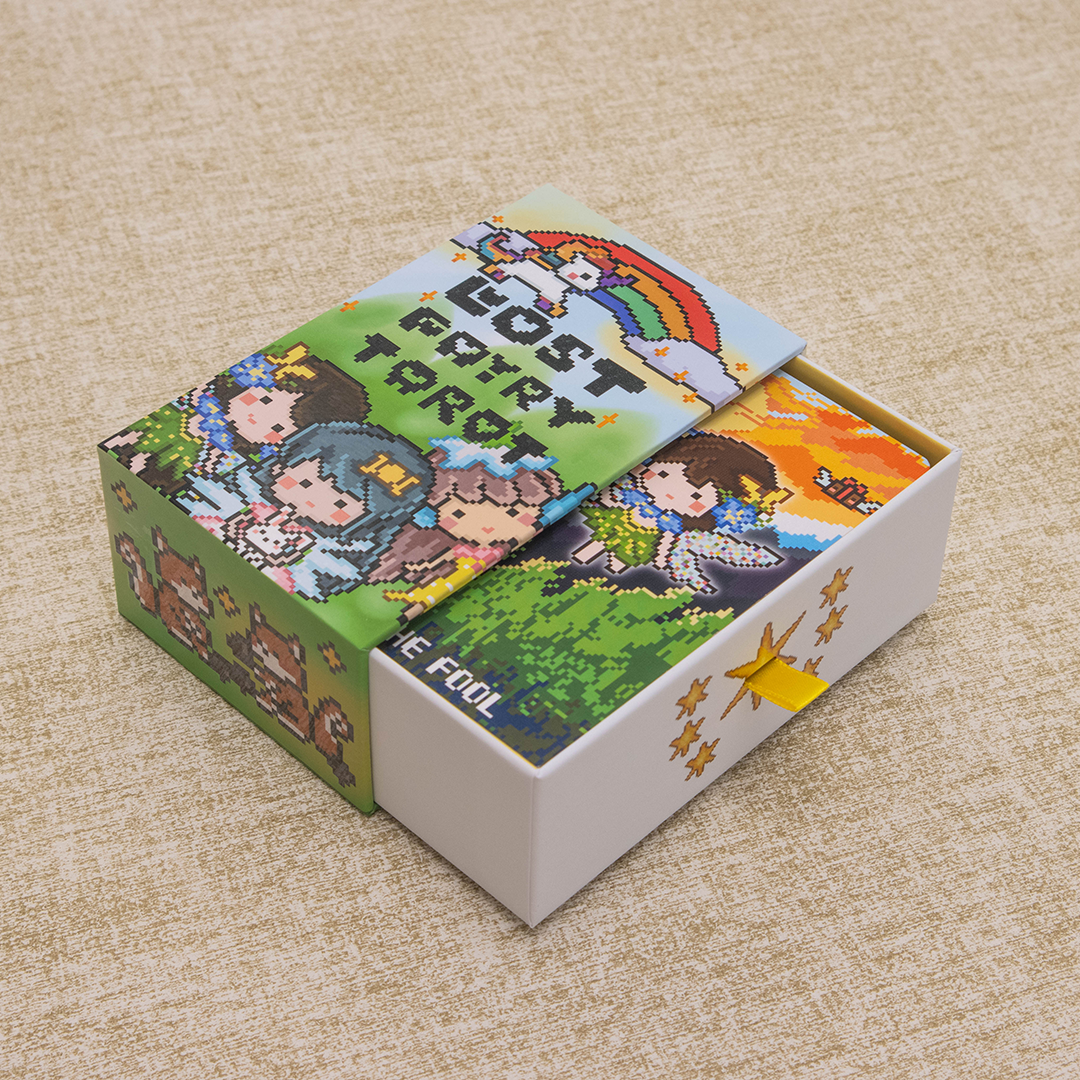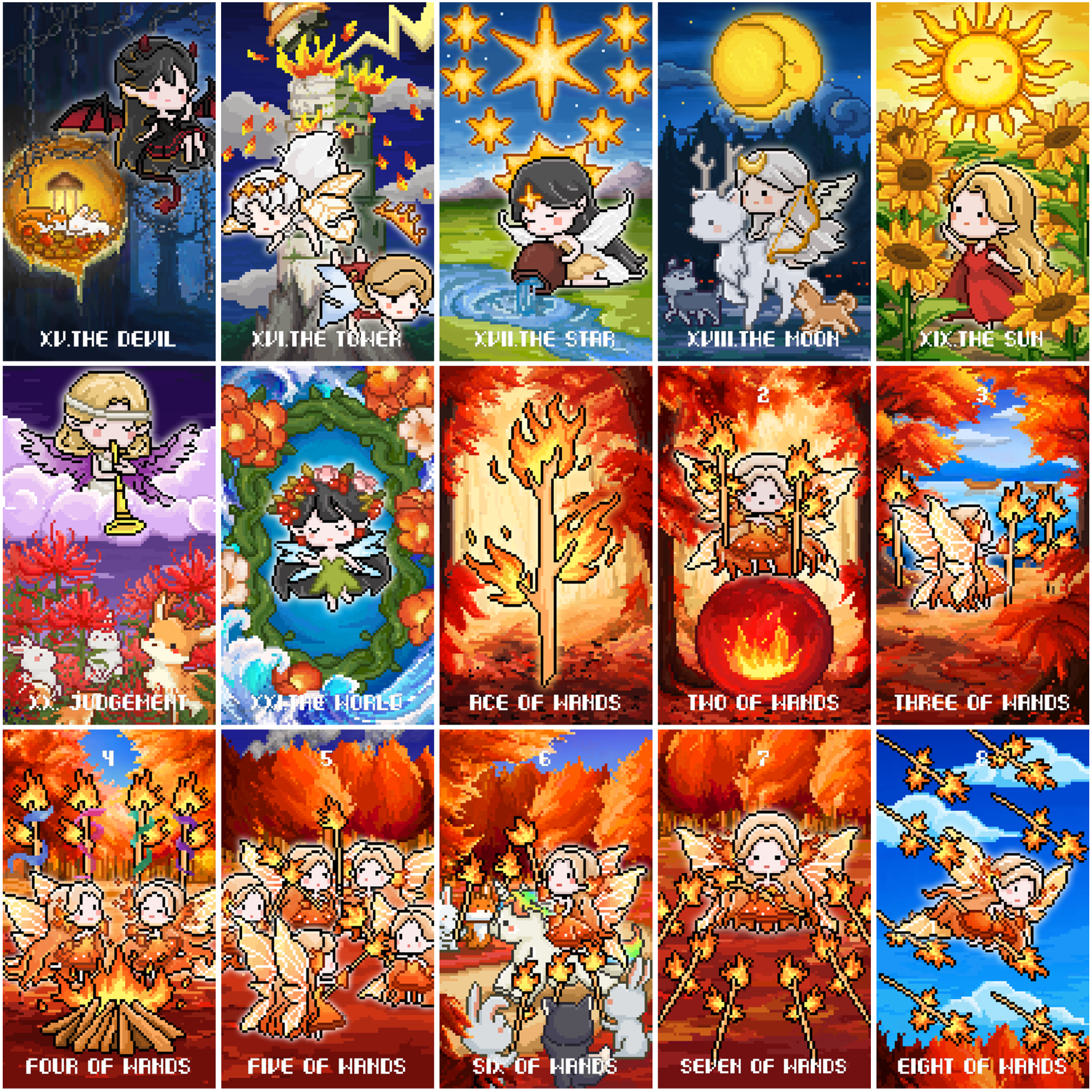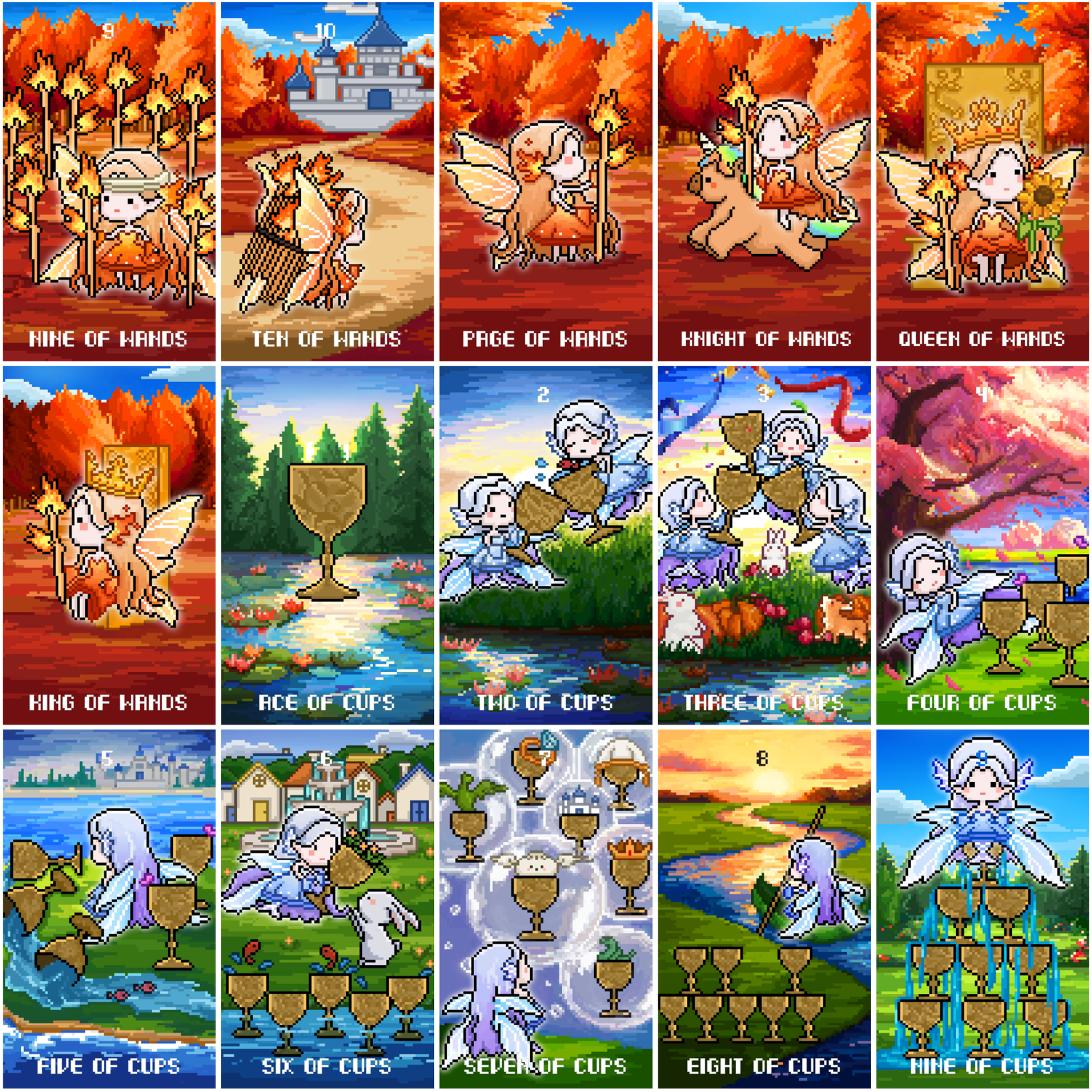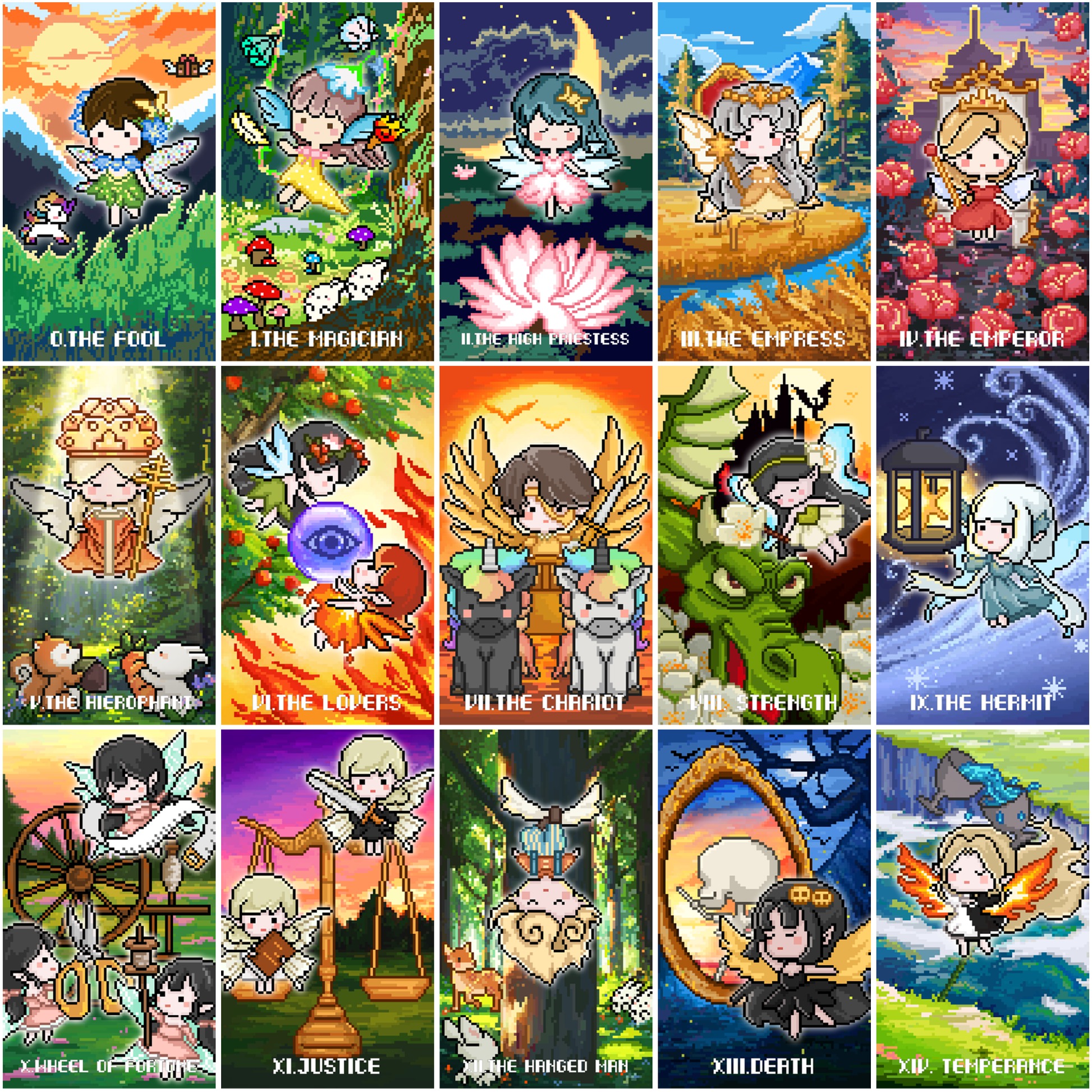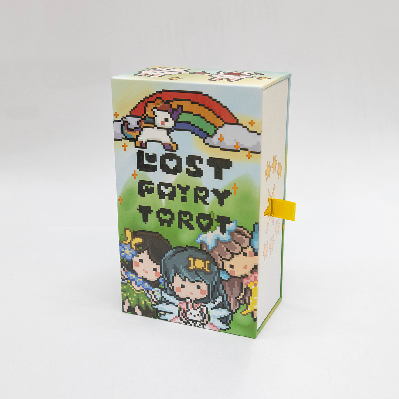 This nostalgic deck features a pixel-art style that sparkles with fairytale charm. Lifted from an enchanted forest where fairies dwell, each card illustrates a whimsical scene, tiny pixelated sprites, and mystical landscapes. With soft, glowing hues and delicate details, the artwork balances playfulness and depth, presenting a captivating blend of innocence and magic.