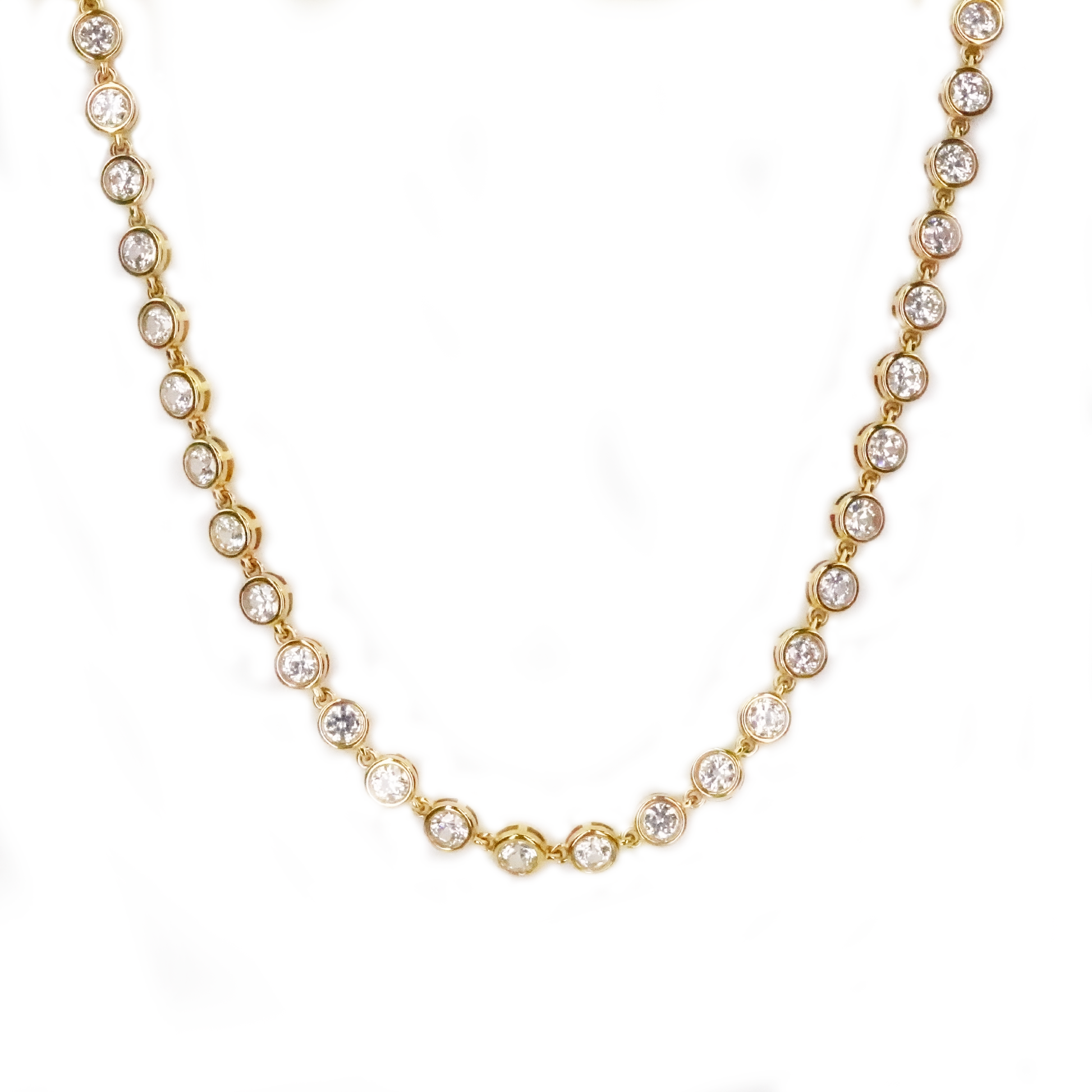 The Lumière White Bezel Necklace combines classic sparkle with a sleek, modern silhouette. Each round-cut white zirconia crystal is bezel-set in polished gold stainless steel, creating a smooth, continuous shine that catches the light from every angle.