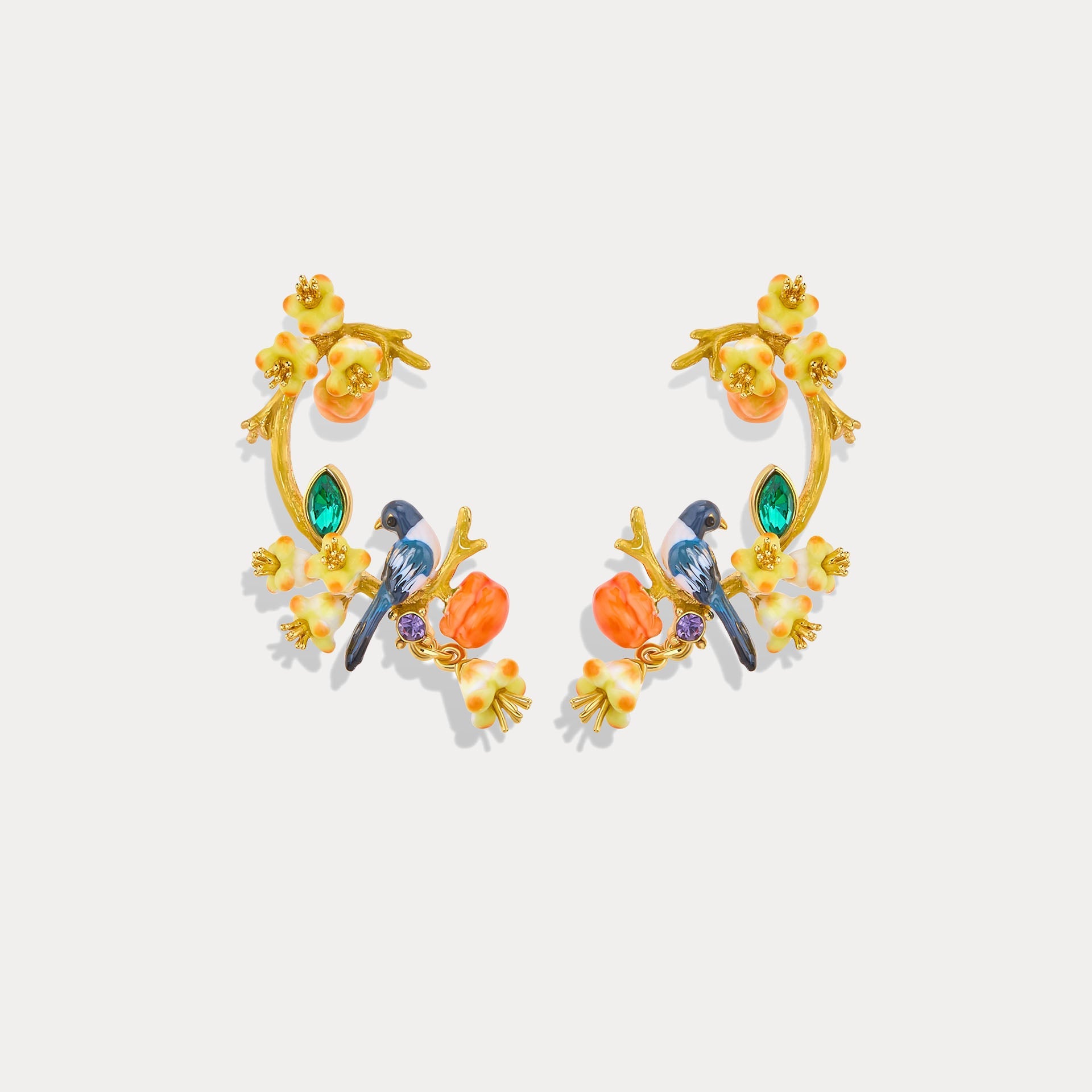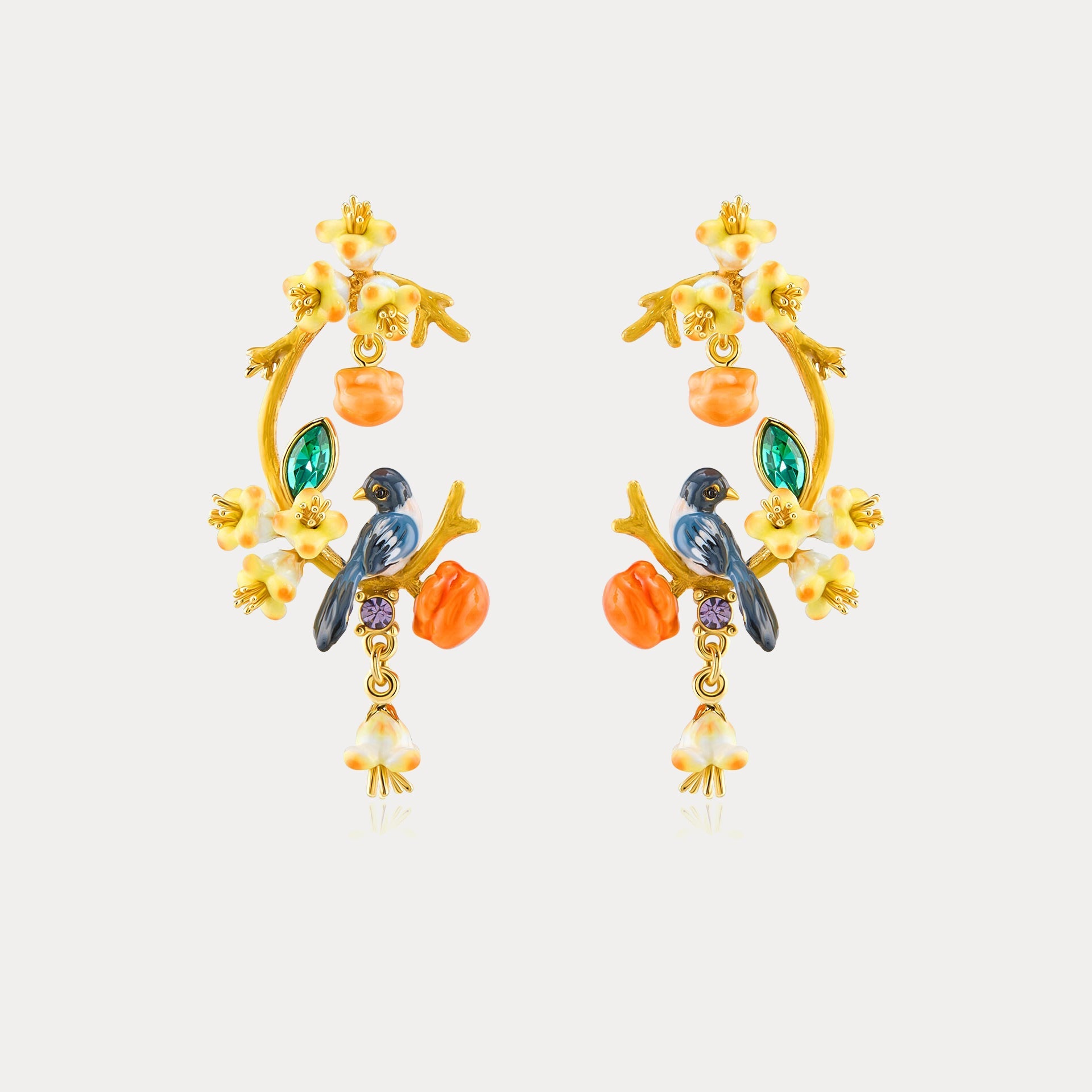 These Magpie & Persimmon Blossom Earrings bloom with the sweetness of nature and the promise of good luck. A cheerful magpie rests among soft persimmon blossoms, their colors glowing with gentle warmth and happiness. The design feels light, graceful, and full of life, adding a poetic touch to your everyday style. A lovely piece of nature jewelry and a thoughtful gift for her, these earrings bring a little moment of joy wherever you go.