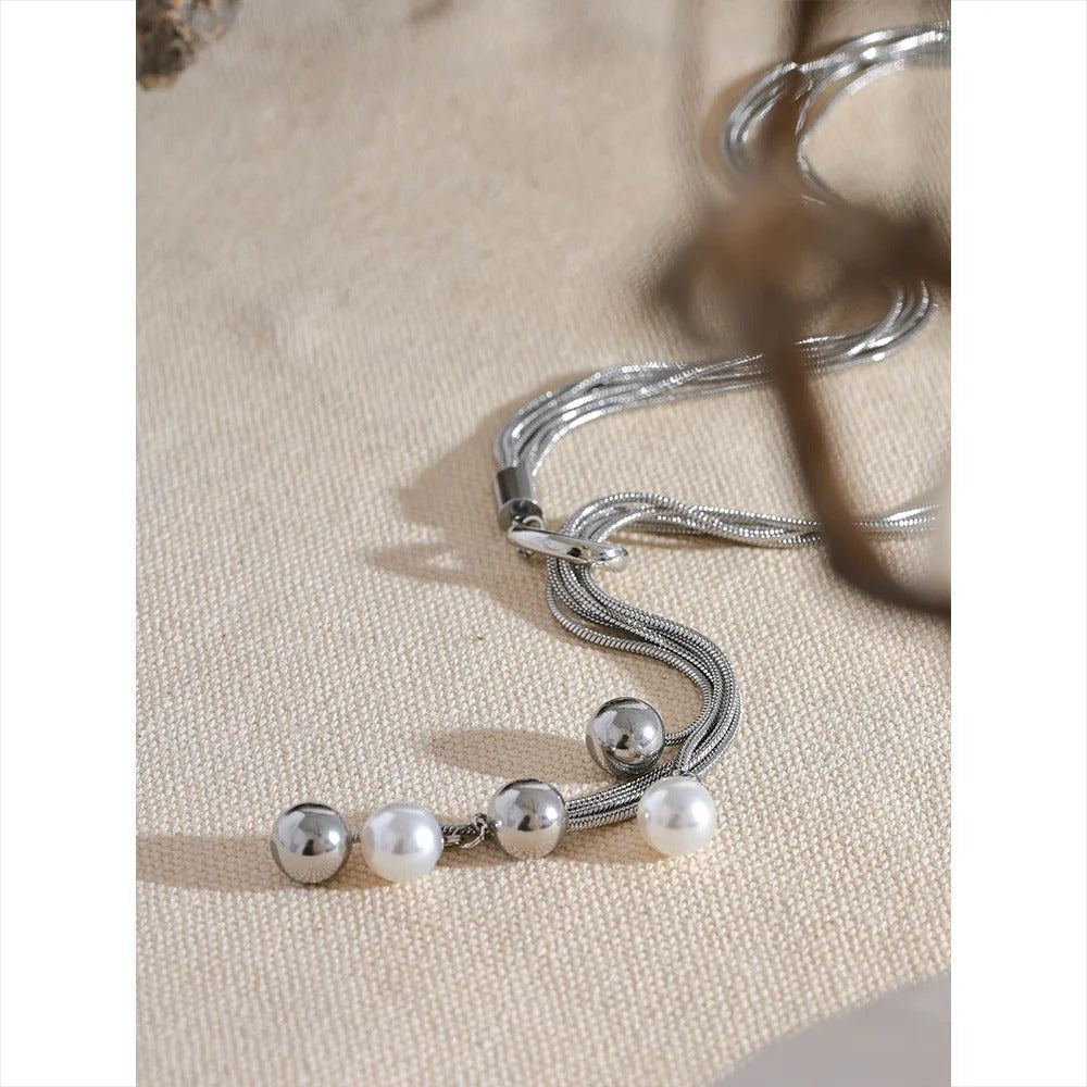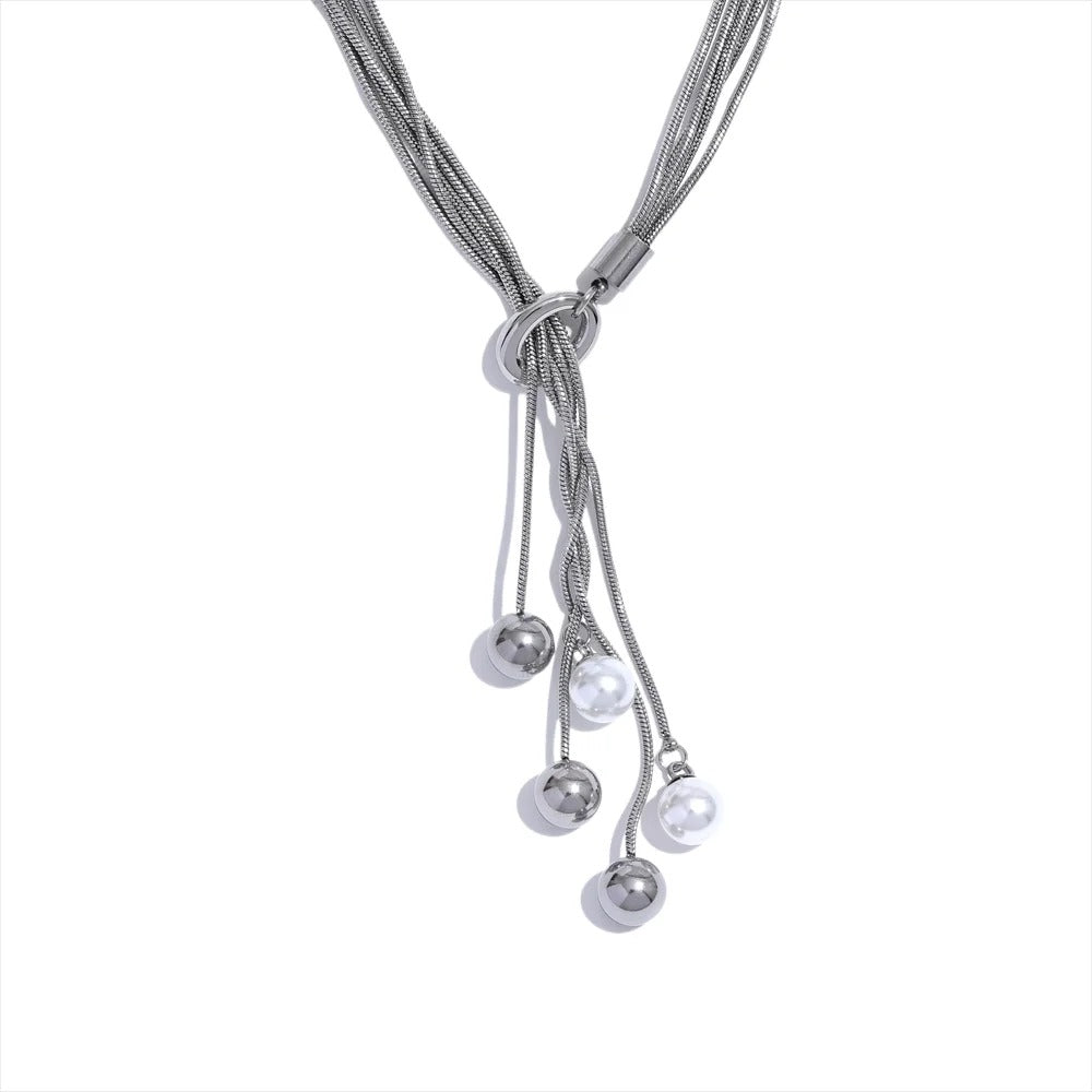 Dive into enchanting elegance with our 'Mermaid's Treasure' Silver Multi Layer Long Necklace, a captivating adornment that exudes oceanic charm and sophistication. Crafted with meticulous attention to detail, this necklace is adorned with lustrous pearls, evoking the timeless allure of the sea. Crafted from high-quality stainless steel, the 'Mermaid's Treasure' Silver Multi Layer Long Necklace boasts durability and resilience. The silver hue adds a touch of sophistication, while the hypoallergenic properties of the metal make it suitable for even the most sensitive skin.