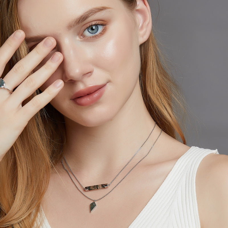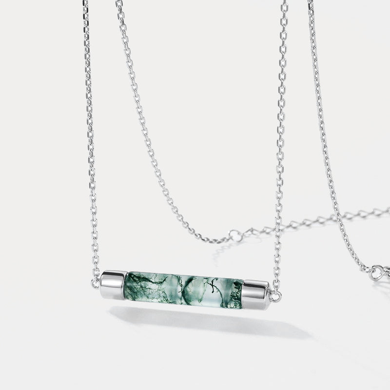 Immerse yourself in a harmonious blend of natural beauty and modern design of our elegant Moss Agate Pendant Necklace! This exquisite necklace features a slender, cylindrical moss agate stone, showcasing the mesmerizing green inclusions that evoke the serene beauty of a forest canopy. Encased in sleek silver caps and suspended from a delicate silver chain, this pendant exudes contemporary sophistication.
