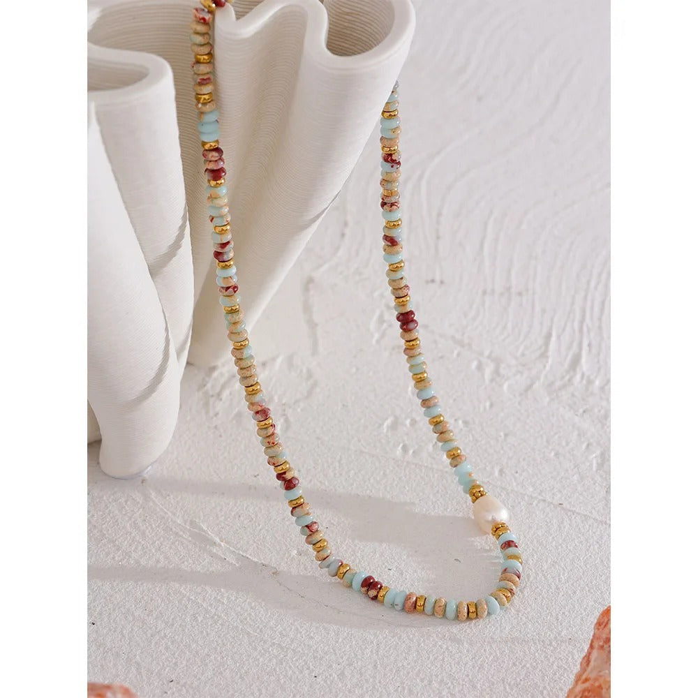 Introducing 'Open and Balanced' - a captivating Jasper Necklace with Pearls that combines the grounding energy of Jasper with the timeless elegance of Pearls. Whether worn as a bold standalone piece or layered for a modern twist, let this necklace be a reflection of your unique style and appreciation for the harmonious interplay of natural elements.