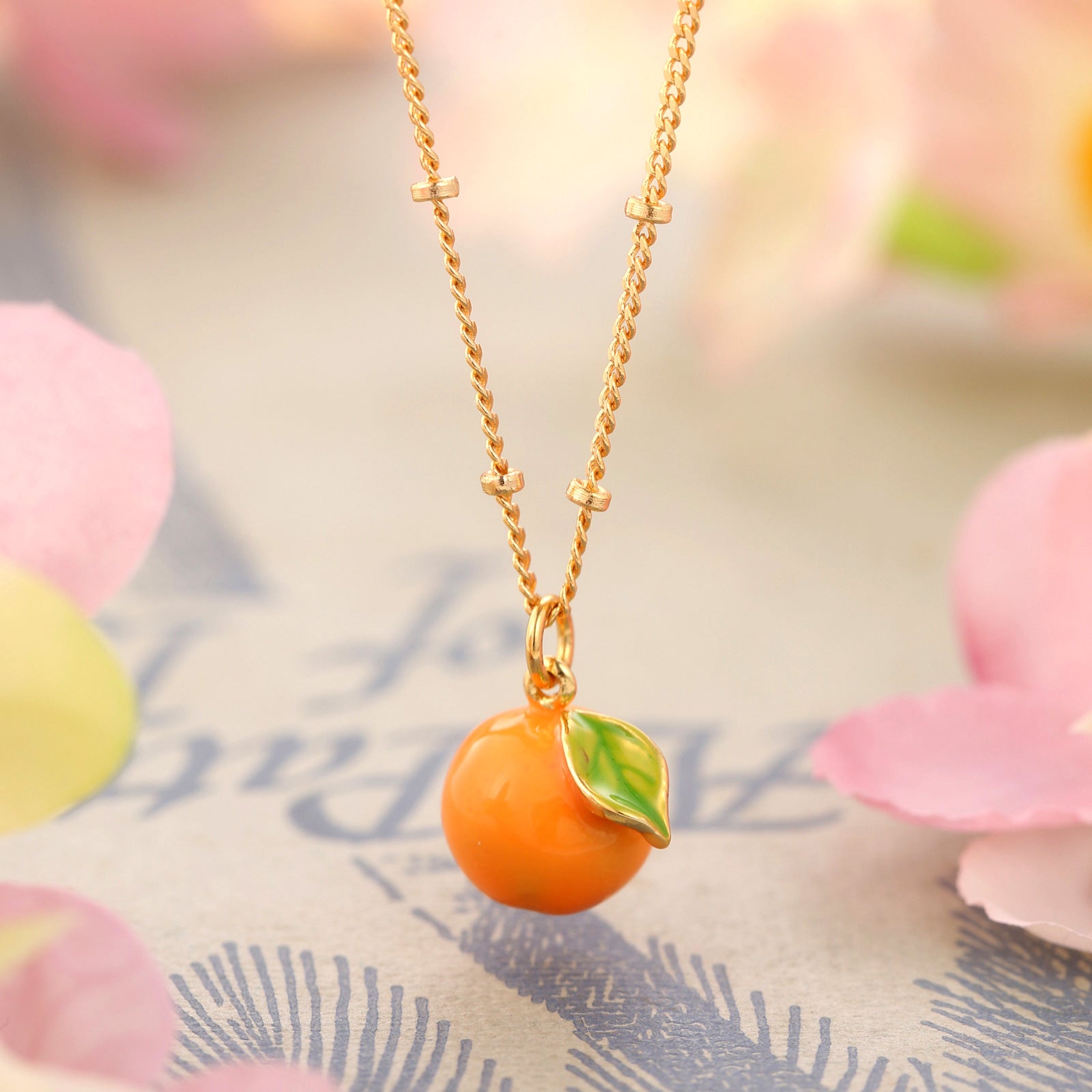 Bask in the sunshine with the Orange Necklace, a vibrant addition to your summer wardrobe. This delightful orange fruit necklace features a charming orange charm, made from 18K gold-plated brass. The rich orange enamel brings the charm to life, capturing the essence of a perfectly ripe citrus fruit. Whether you're seeking a pop of color to elevate your everyday look or a statement piece to turn heads at a summer soirée, the statement orange necklace injects a touch of playful sophistication into any outfit. Made with meticulous attention to detail, the high-quality materials ensure this necklace is built to last. Surprise a loved one who appreciates bold and beautiful jewelry, or treat yourself to a reminder of summer's vibrant spirit. The orange pendant necklace is a guaranteed conversation starter and a surefire way to add a touch of citrusy cheer to any ensemble.
