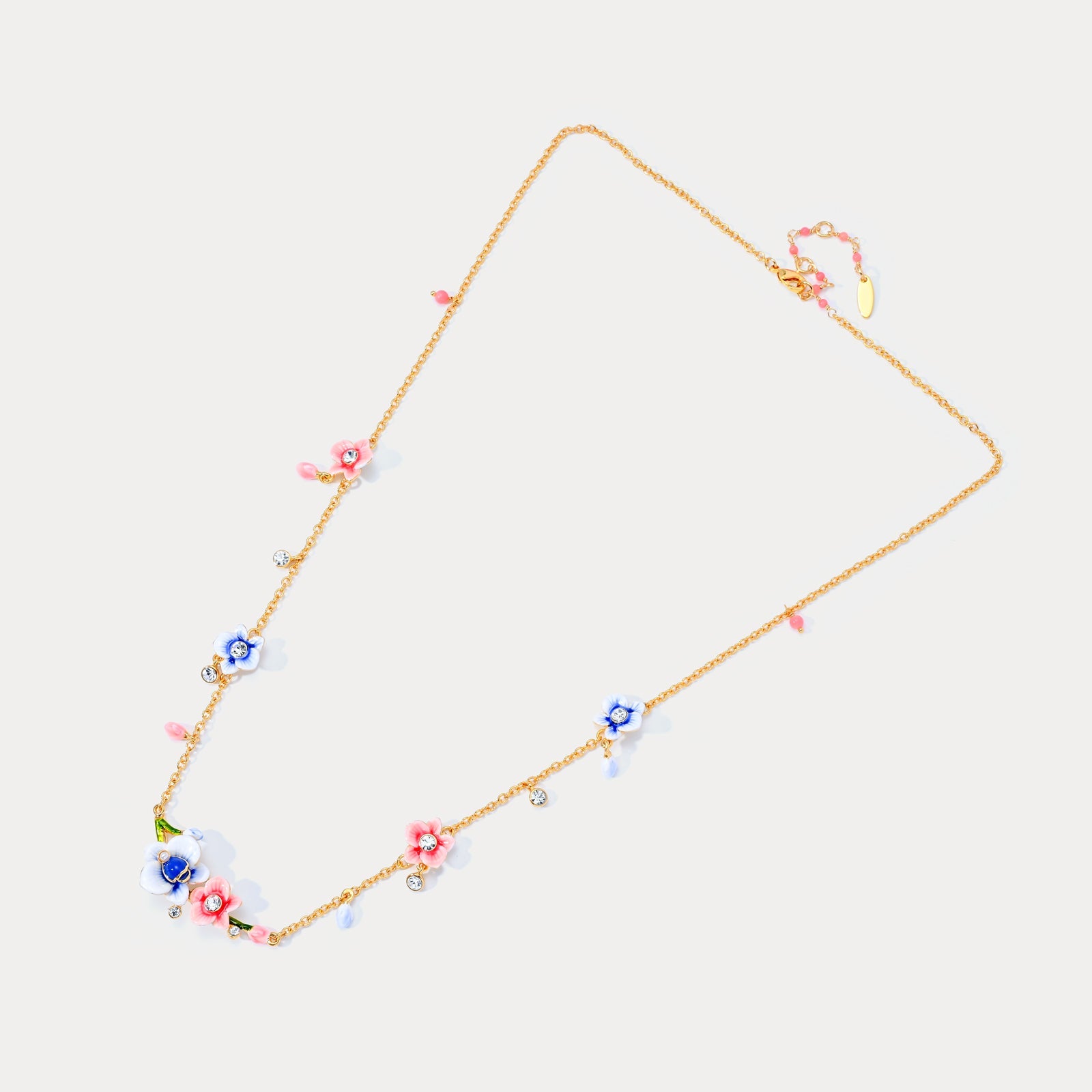 This stunning enamel and pearl orchid necklace adds a touch of elegance and femininity to any outfit. The delicate pink and blue orchids evoke feelings of beauty and grace, making it the perfect accessory for special occasions or everyday wear. Enhance your style with the Orchid Necklace today!