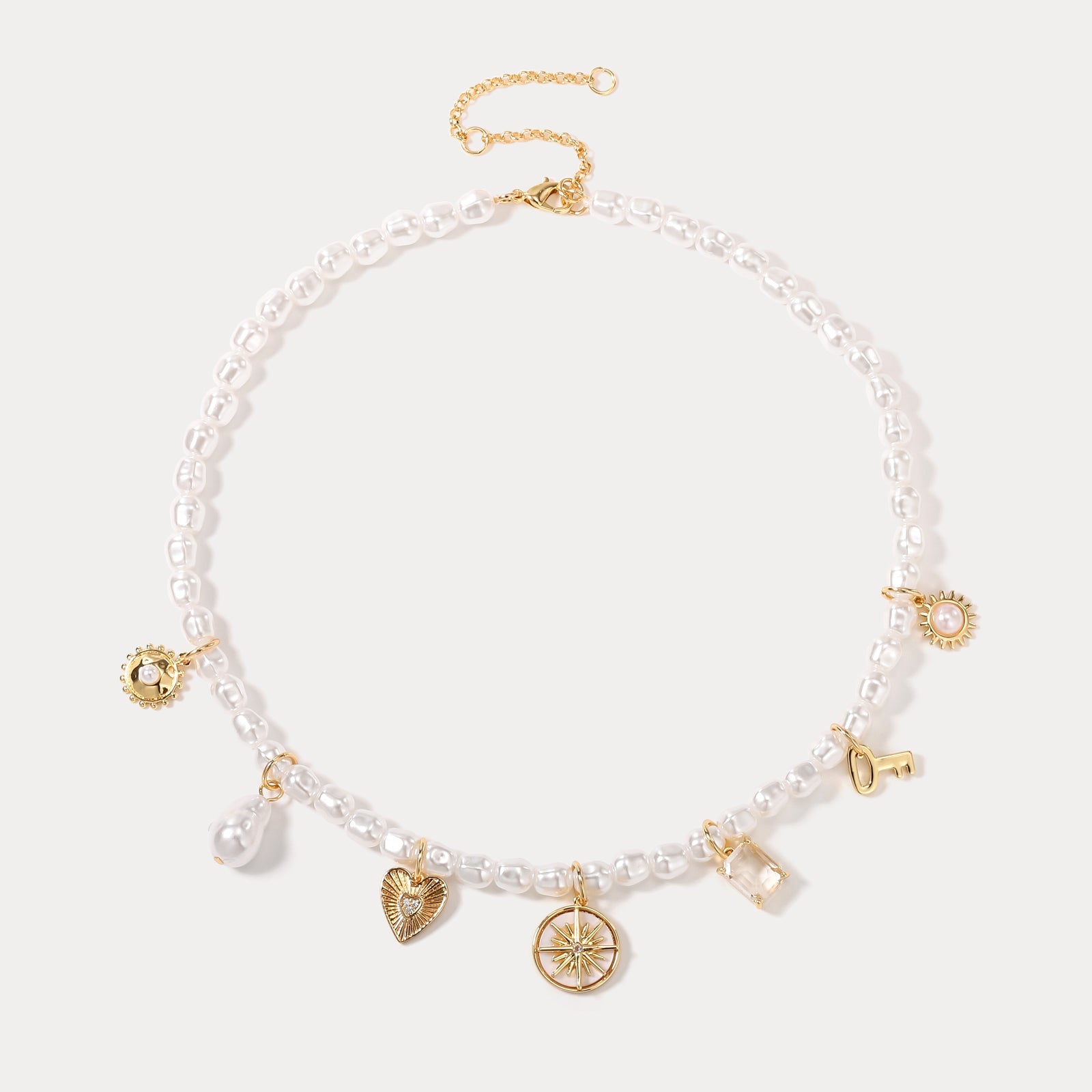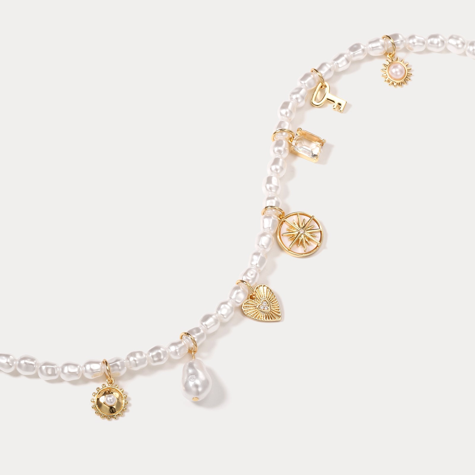 Under glittering star-strewn skies, the Love Star Charms Necklace unfurls its celestial charms. A lustrous freshwater pearl glows like the moon itself, its creamy incandescence illuminating delicate gold talismans - a compass to guide adventures, a heart brimming with affection's ardor, a key unlocking life's boundless treasures. Suspended from a shimmering chain, these ethereal charms sway in graceful rhythm with each breath, attuning the wearer to the cosmic wonders and natural harmonies of the vast universe. Embrace starry-eyed romanticism with this heavenly talisman adorning your neckline.