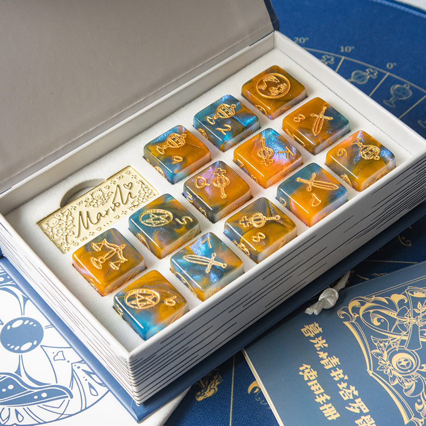 * Offering intuitive guidance through randomized rolls instead of card draws, tarot dice are a unique divination tool that replaces traditional tarot cards with 13 six-sided dice. Each of the 78 faces corresponds to a tarot card, identified by symbols and numbers.