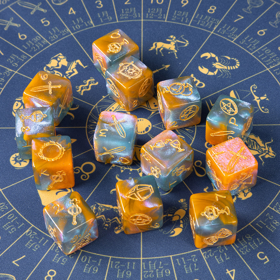 Inspired by Norse mythology, the design captures twilight's fading glow. A gentle fusion of orange, blue, and pink hues drapes the set in a dreamlike serenity. Hand-drawn symbols, rendered with casual grace and heartfelt intention, emanate soothing energy and invite wisdom with every roll.