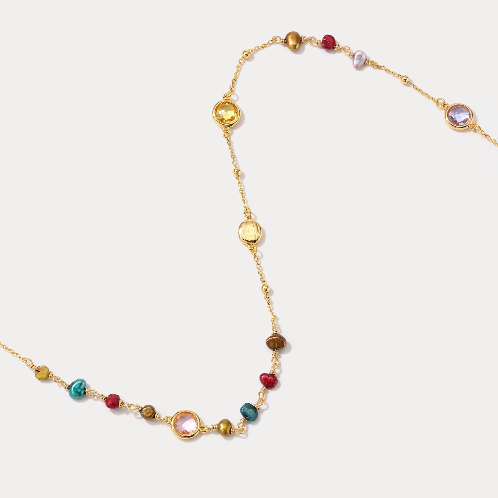 Embark on a vibrant journey with the Rainbow Station Beaded Necklace, a captivating piece of beaded jewelry celebrating nature's kaleidoscopic beauty. Handcrafted with freshwater pearls, cubic zirconia, and 18K gold-plated brass, this Multi Colored Pearl Necklace for Women features a mesmerizing array of pearl hues that dance with every movement. Strategically placed cubic zirconia stones add radiant sparkle, elevating the elegance of this versatile accessory that effortlessly complements any outfit. An exceptional gift idea for loved ones or a luxurious treat for oneself, this necklace is a cherished addition to any stone necklaces collection, embracing life's vibrant hues with style and confidence.
