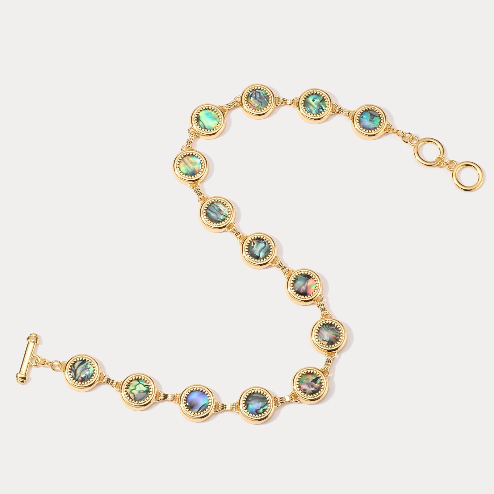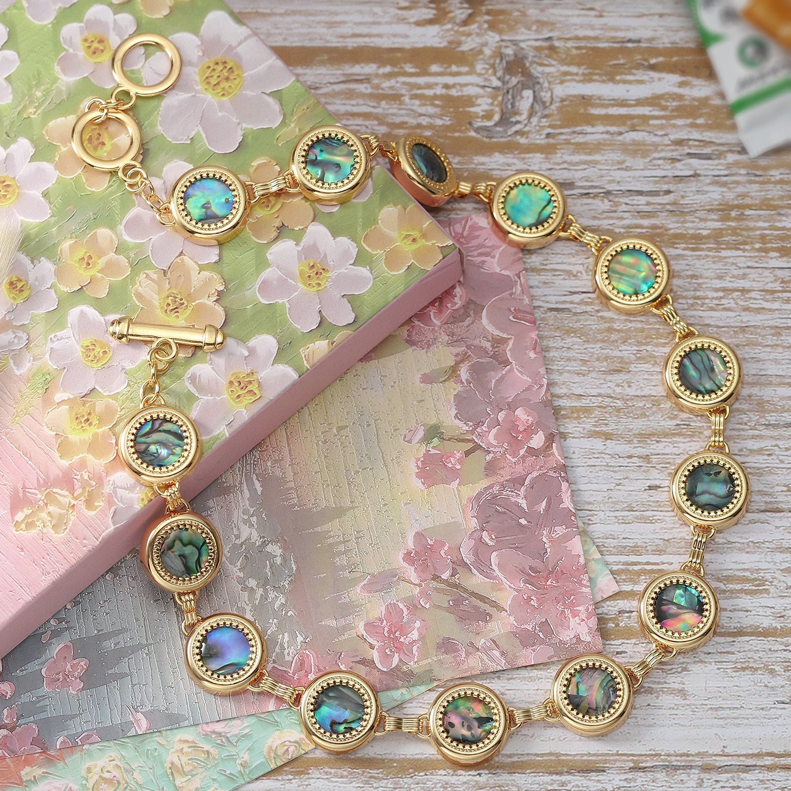 Pearls luminous, abalone iridescent, entwine in regal splendor upon thy décolletage. As evening's silken folds caress thy neck, this necklace whispers of ocean's depths, where nature's treasures emerge dripping with saline majesty. Gold-plated links envelop coin-shaped abalone awash in rainbow hues, escorting pearlescent spheres in an opulent promenade. With each breath, the lustrous strands sway, adorning thee in Mother Nature's raw fineries, refined yet humble, luxurious regality embodied.
