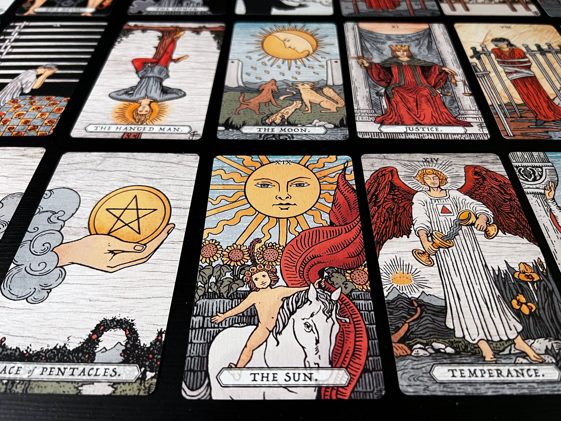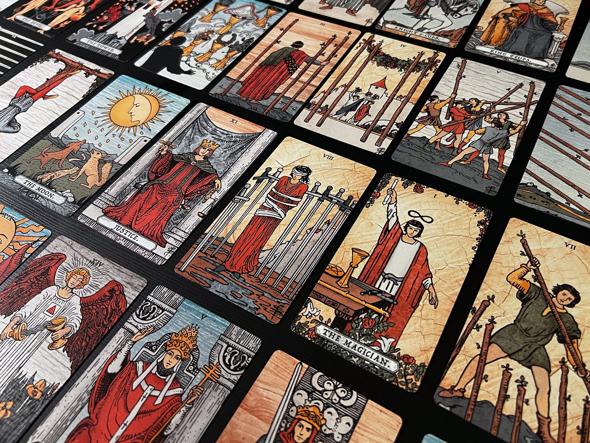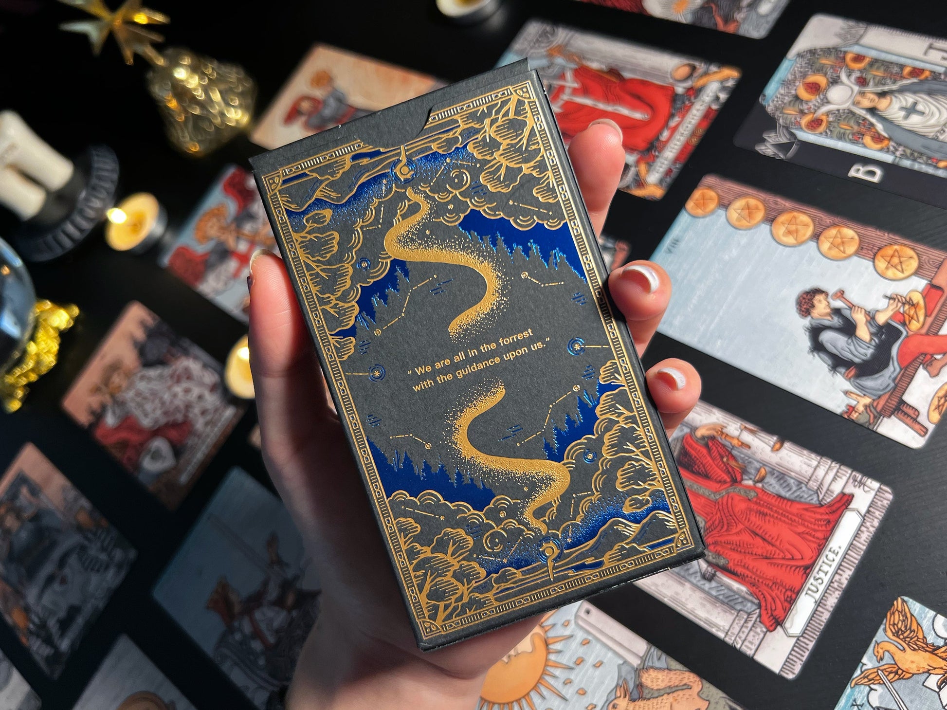 Inspired by the significance of “wood” as a medium for transferring information, the artwork of this deck is distinguished by the use of wood grain textures in place of pure colors. The overall design employs a Morandi palette to depict traditional RWS imagery, creating a more soothing visual experience. The packaging design is derived from the “Wheel of Fortune,” symbolizing a fresh start, while the flourishing olive branch represents new life. We hope that everyone who embarks on their tarot journey with this deck will have a positive new beginning.